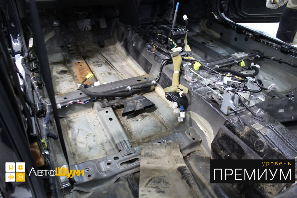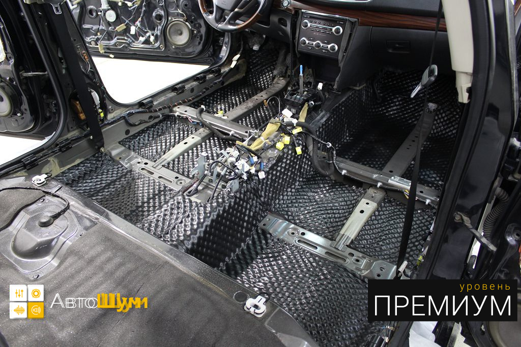 От моторной перегородки и до заднего сиденья вмести с ним клеится мощный многослойный шумо и звукоизолятор Шумофф Prizma 6.