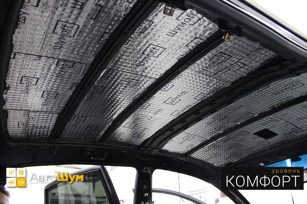 Вторым слоем поверх виброизоляции клеим на крышу современный и очень эффективный шумопоглотитель Шумофф Absorber А15.
