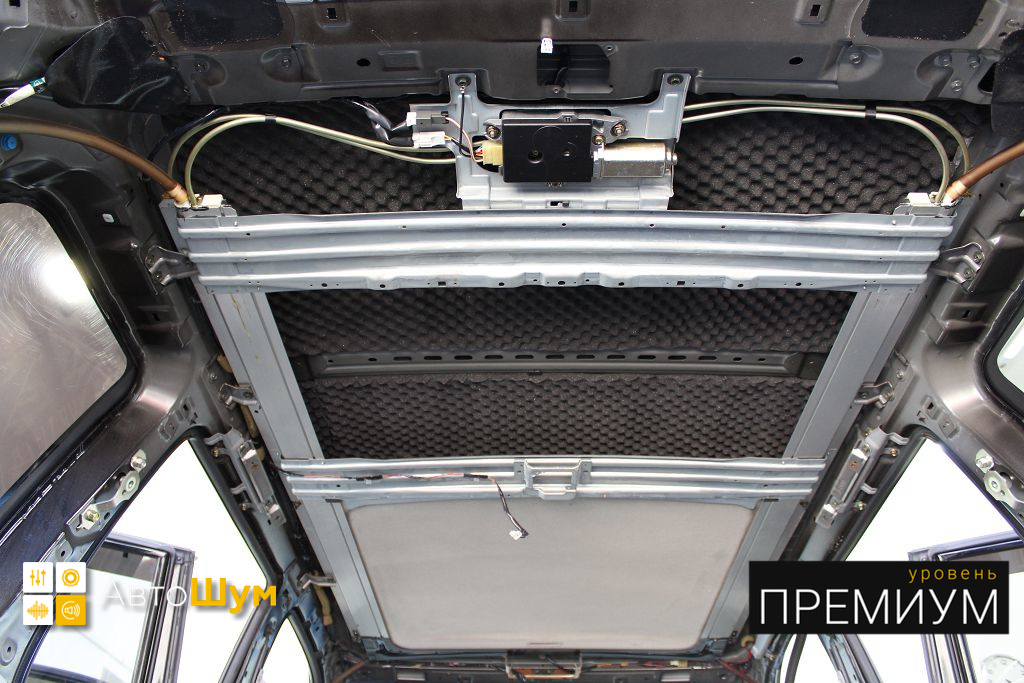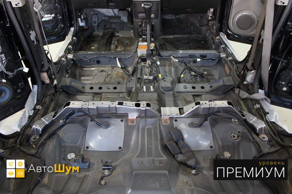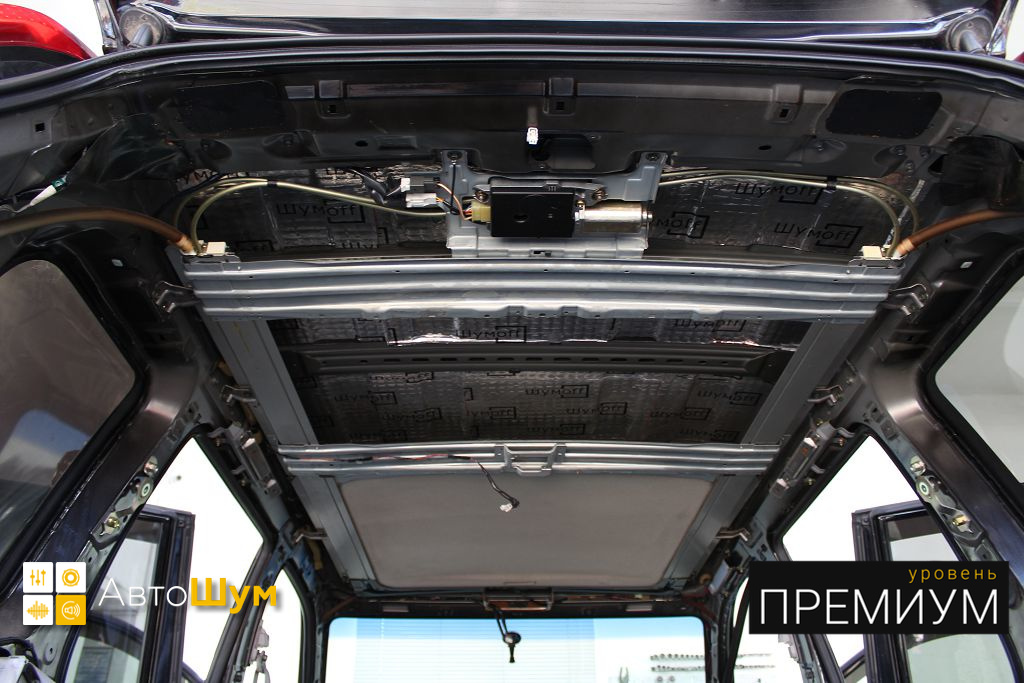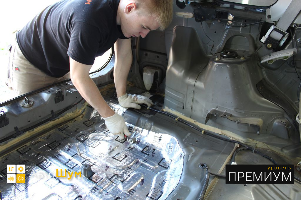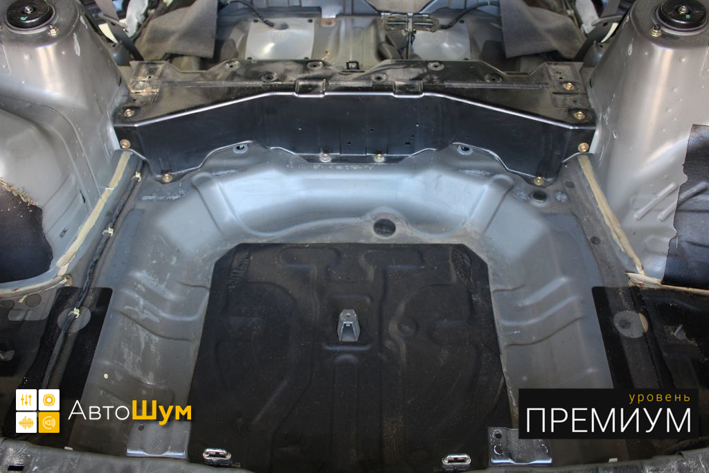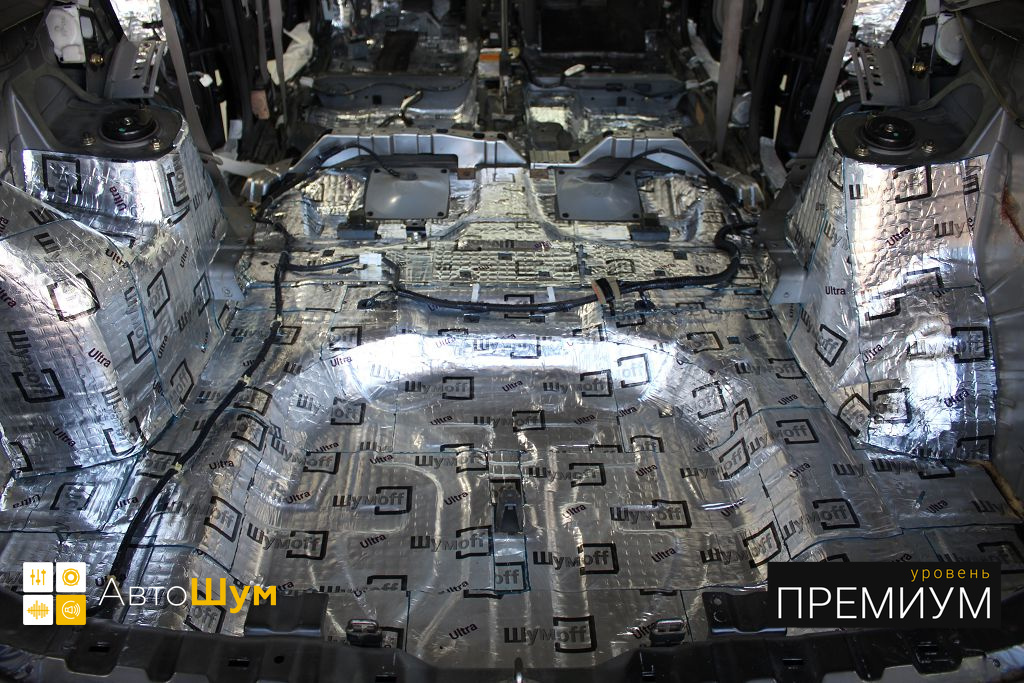Дно оклеивается многослойным шумо и звукоизолятором Шумофф Prizma 6, крылья, арки и крышка багажника шумопоглотителем Absorber A15.