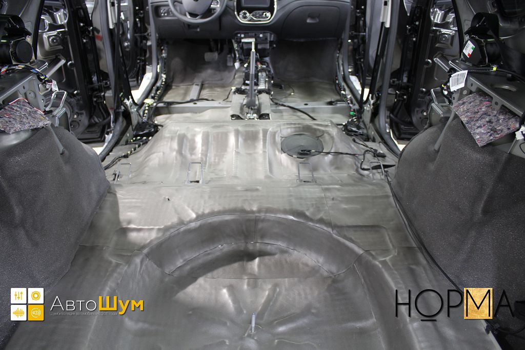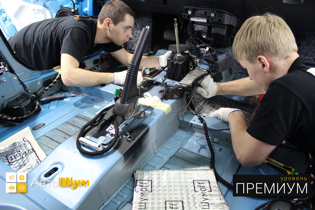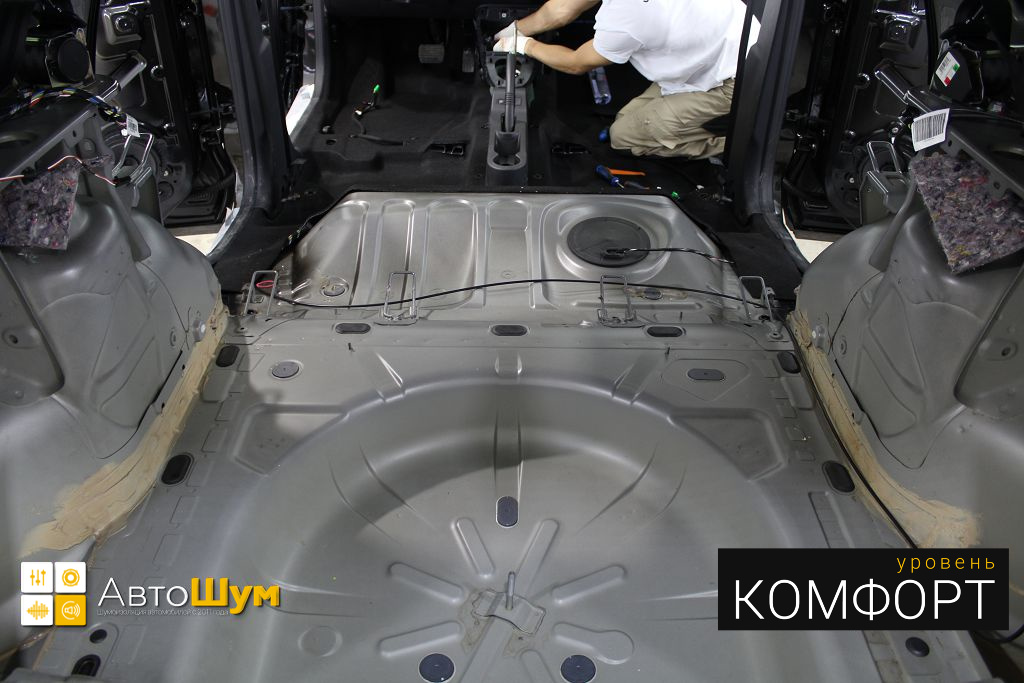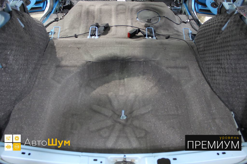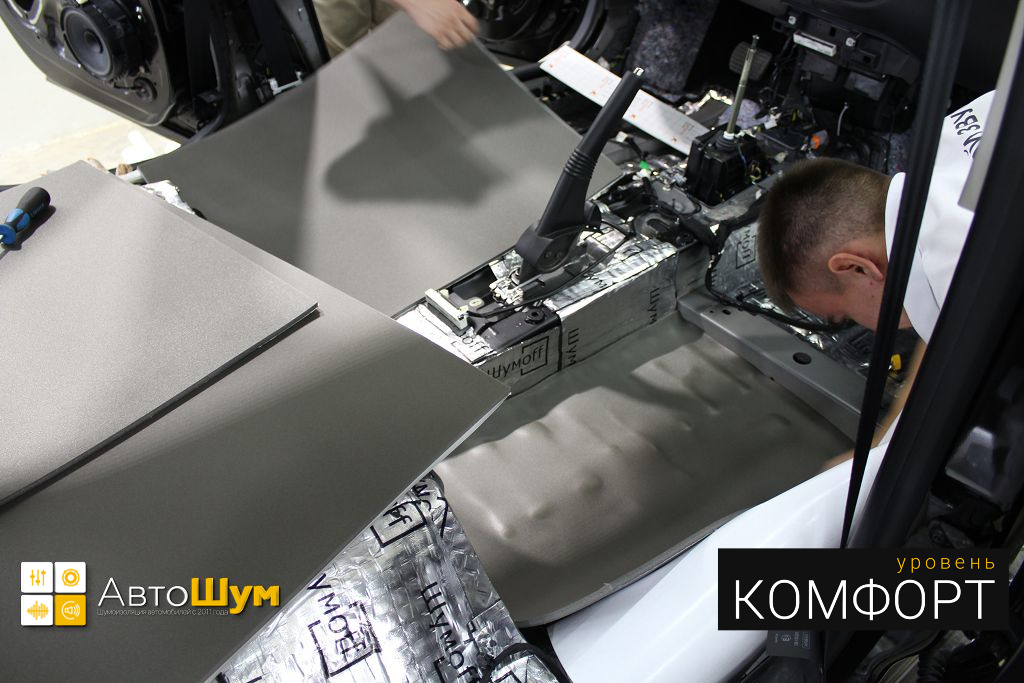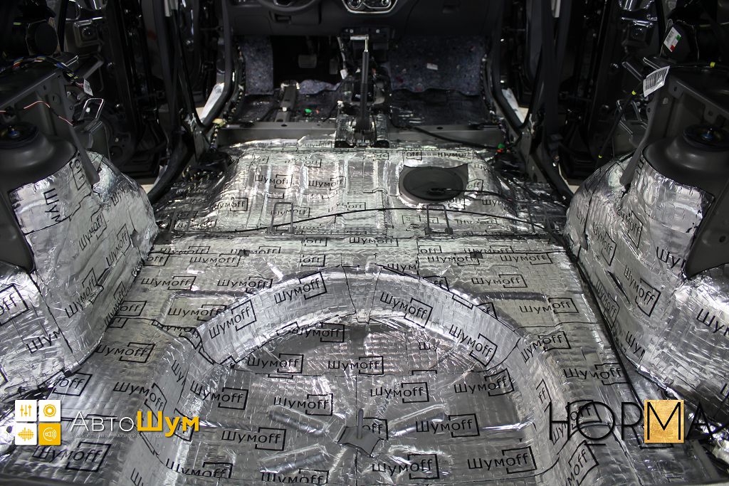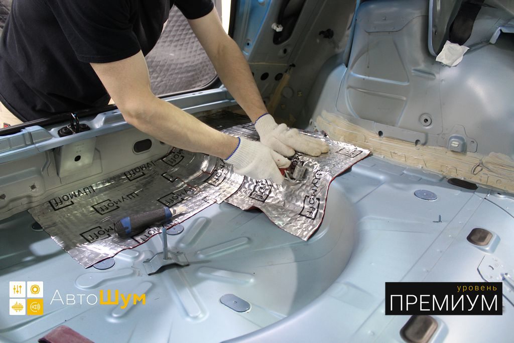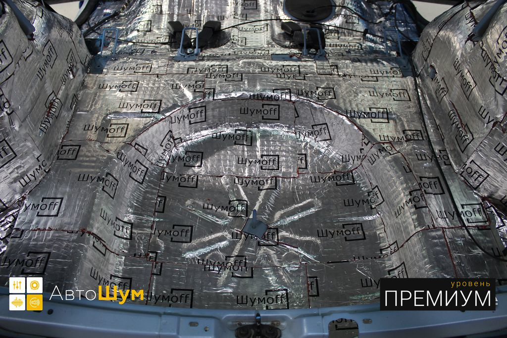 Дно оклеивается многослойным шумо и звукоизолятором Шумофф Prizma 6, крылья, арки и крышка багажника шумопоглотителем Absorber A15.