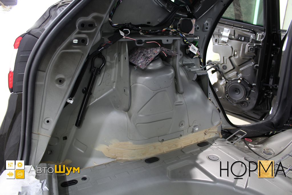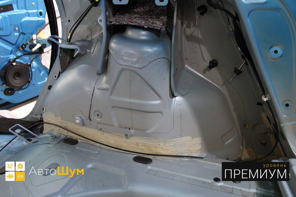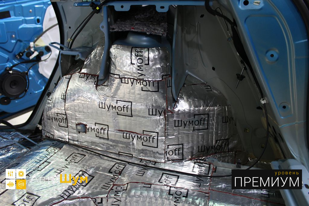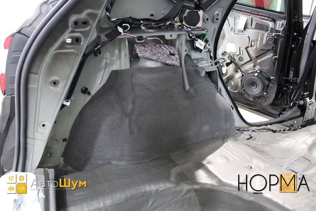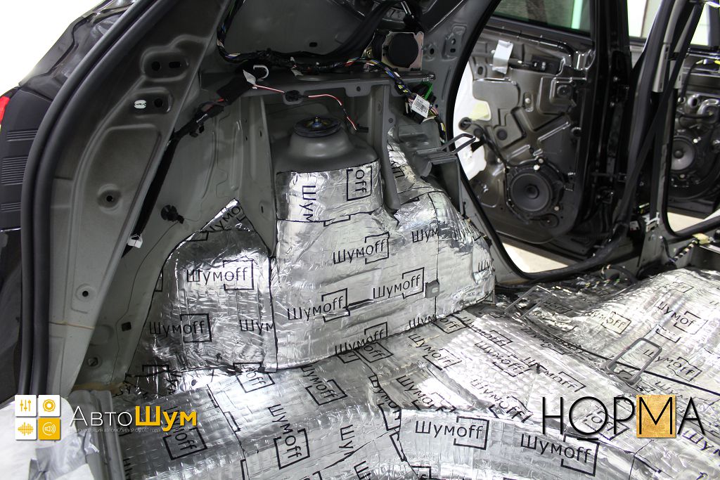 Дно багажника и крылья оклеиваются шумо и теплоизолятором Шумофф П4 4. Арки оклеиваются шумопоглотителем Flex A15.