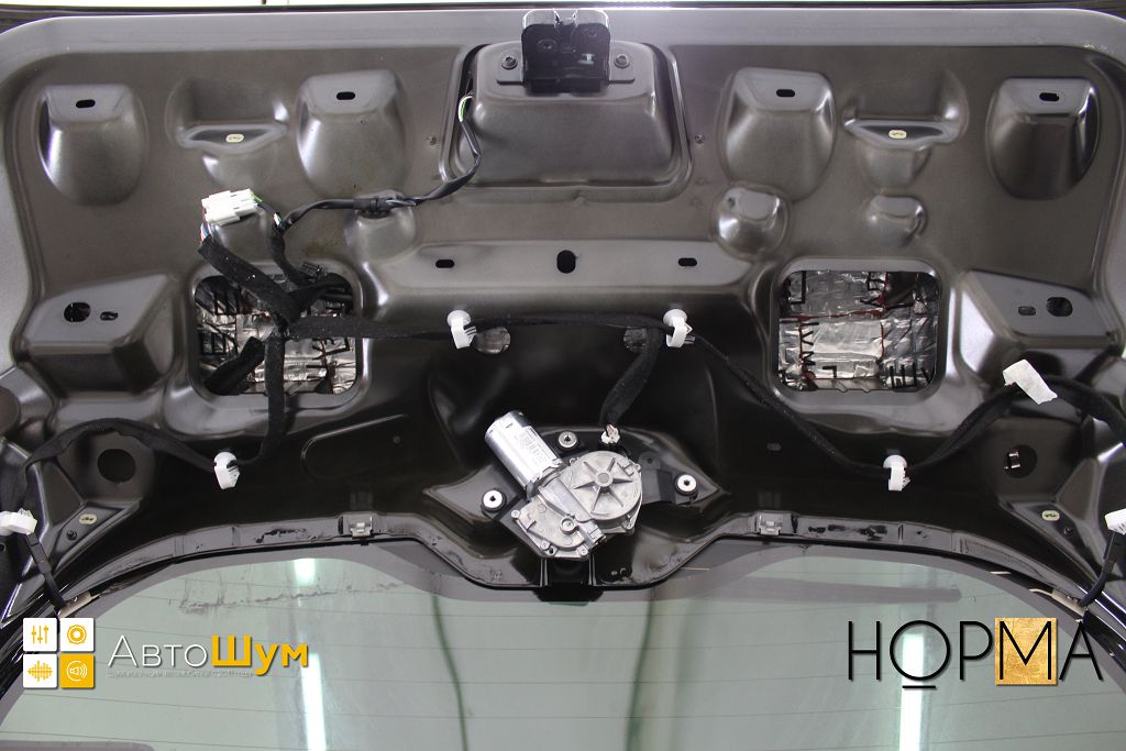 Обшивку пятой двери оклеиваем Flex А15, для устранения ненужных скрипов и бряков.