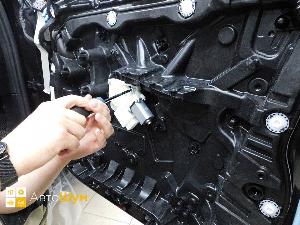 Разбор двери БМВ X5 На внутреннюю поверхность двери между ребер жесткости клеим современную виброизоляцию Шумофф Joker. Тщательно прикатываем каждый лист к поверхности, не оставляя пустот и пузырей