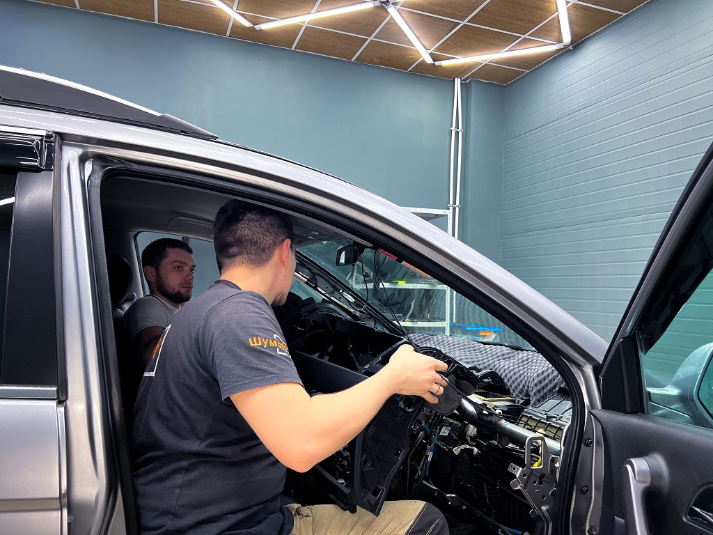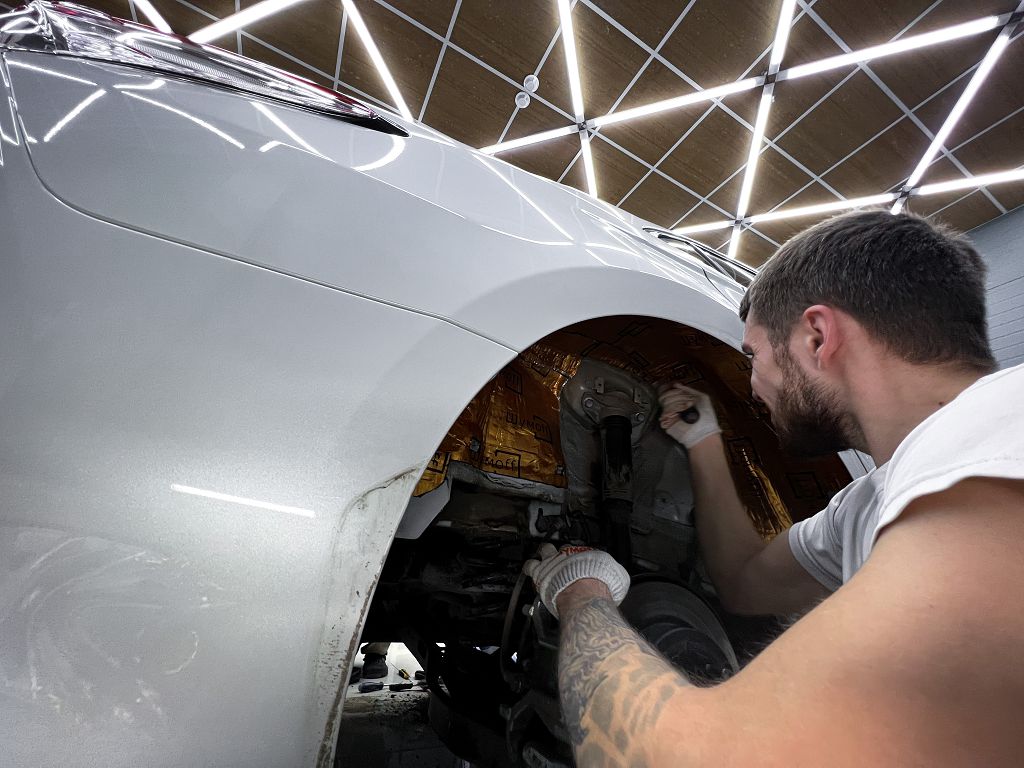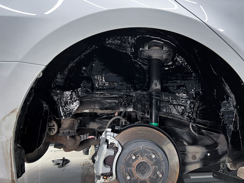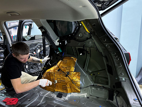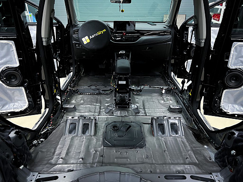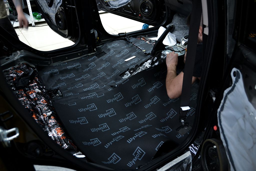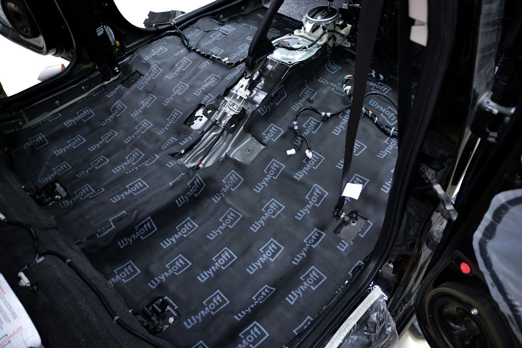 Дно оклеивается многослойным шумо и звукоизолятором Шумофф Prizma 6, крылья, арки и крышка багажника шумопоглотителем Absorber A15.