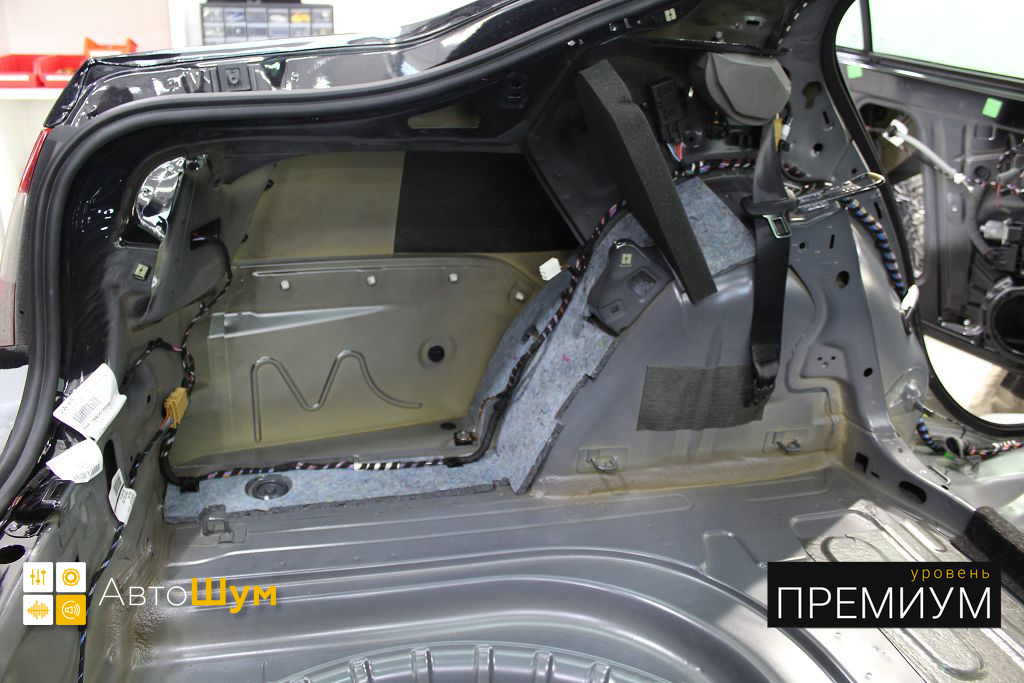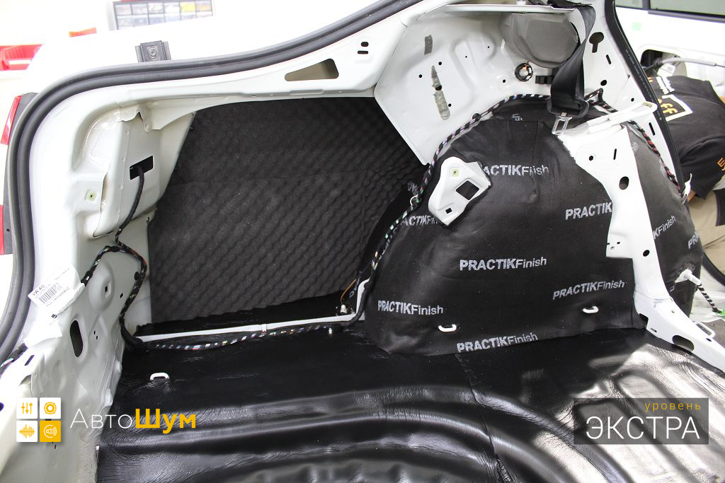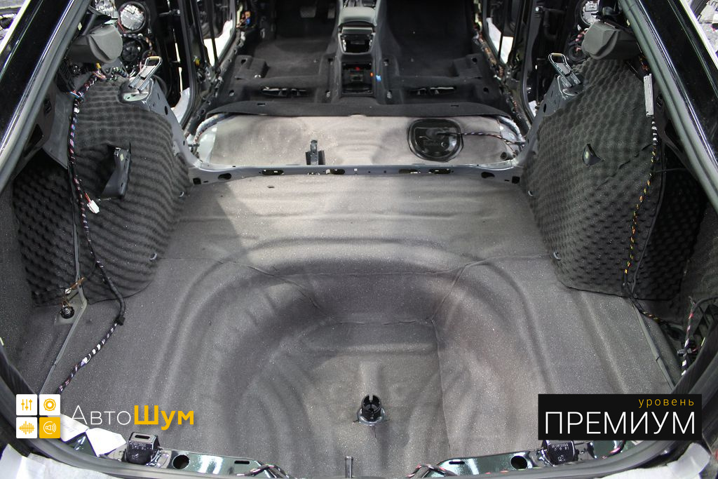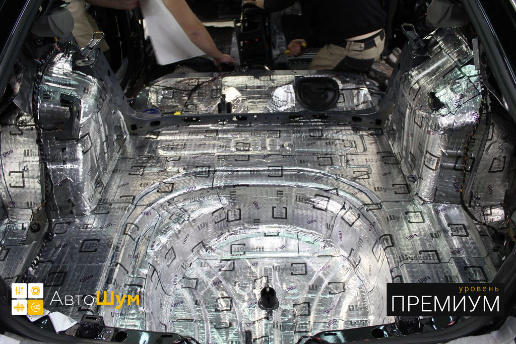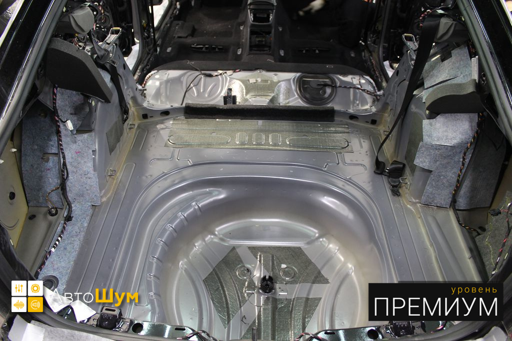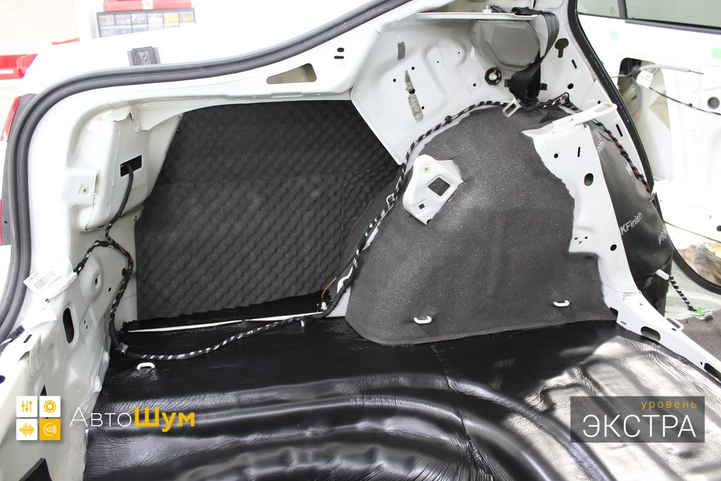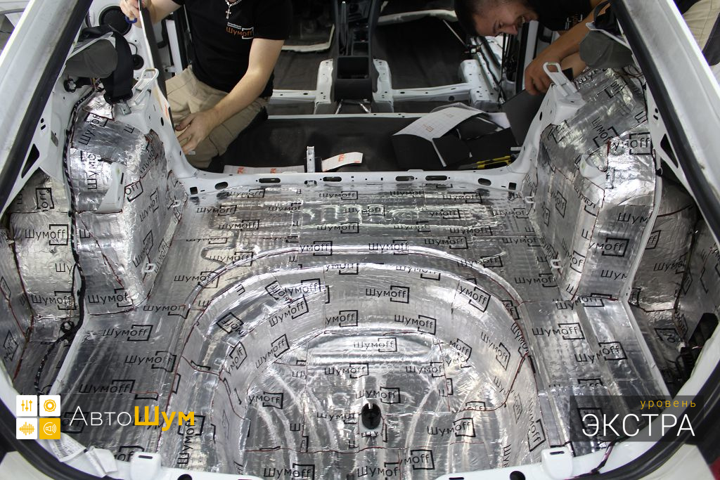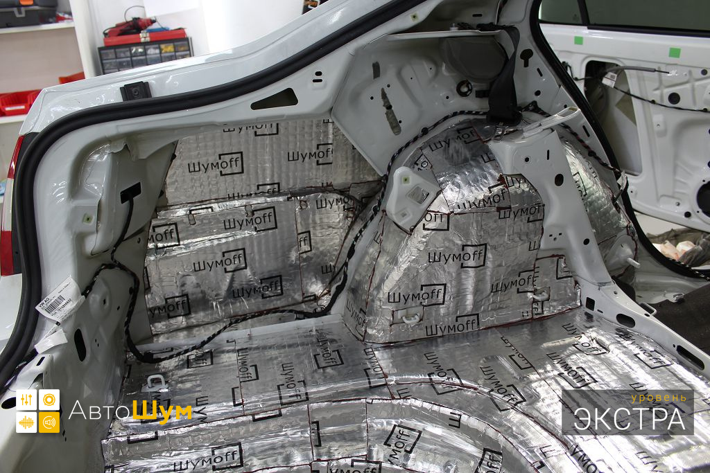 Дно багажника и крылья оклеиваются шумо и теплоизолятором Шумофф П4 4. Арки оклеиваются шумопоглотителем Flex A15.