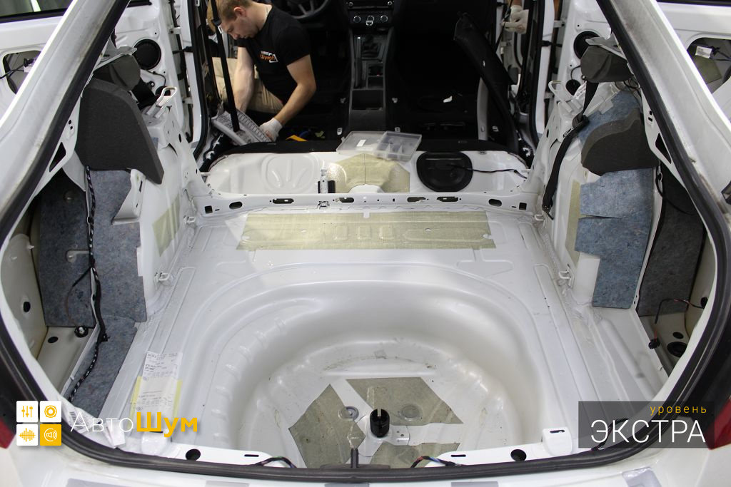 Обезжириваем поверхность и приступаем к монтажу второго слоя. Также для получения более эффективного результата используем компоновку из двух материалов На дно багажника клеим Шумофф Base 4. Этот слой позволит снизить нам шум от дороги.