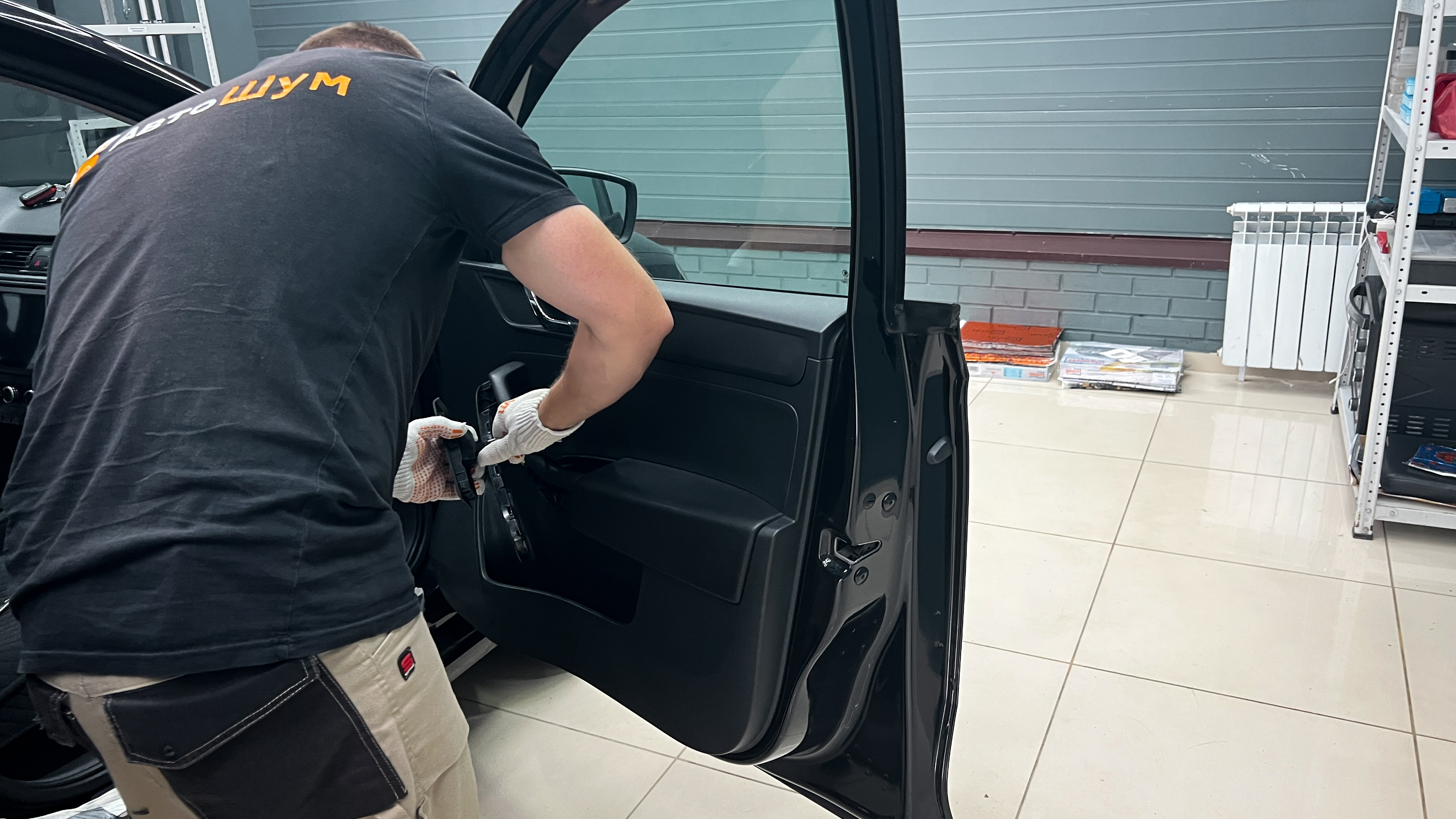 Очищаем и обезжириваем. Первым слоем на внутреннюю часть двери клеим виброизоляцию Шумофф Jack Этот слой поможет нам улучшить звучание акустики, а также сделать закрывание дверей более приятным.