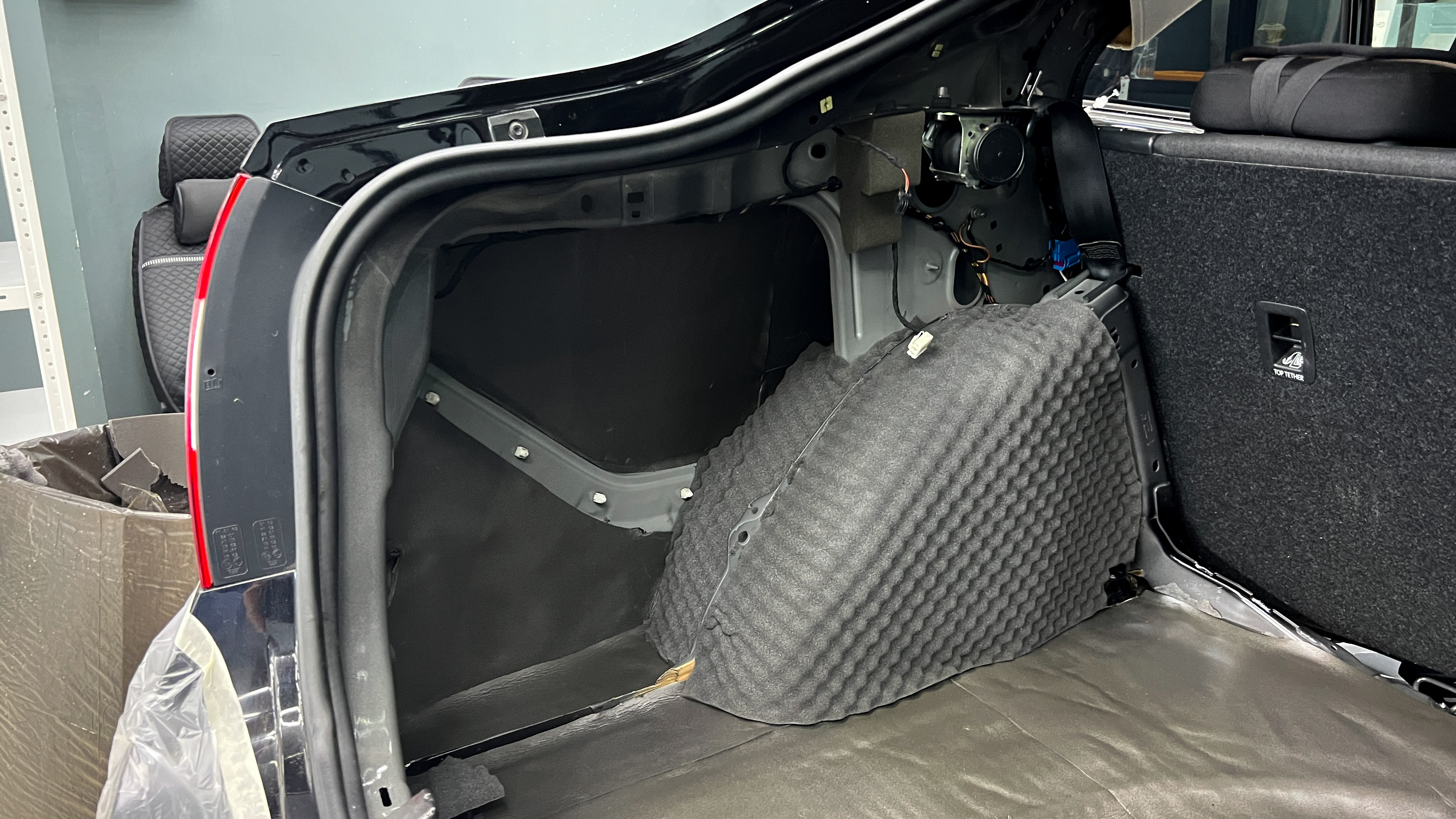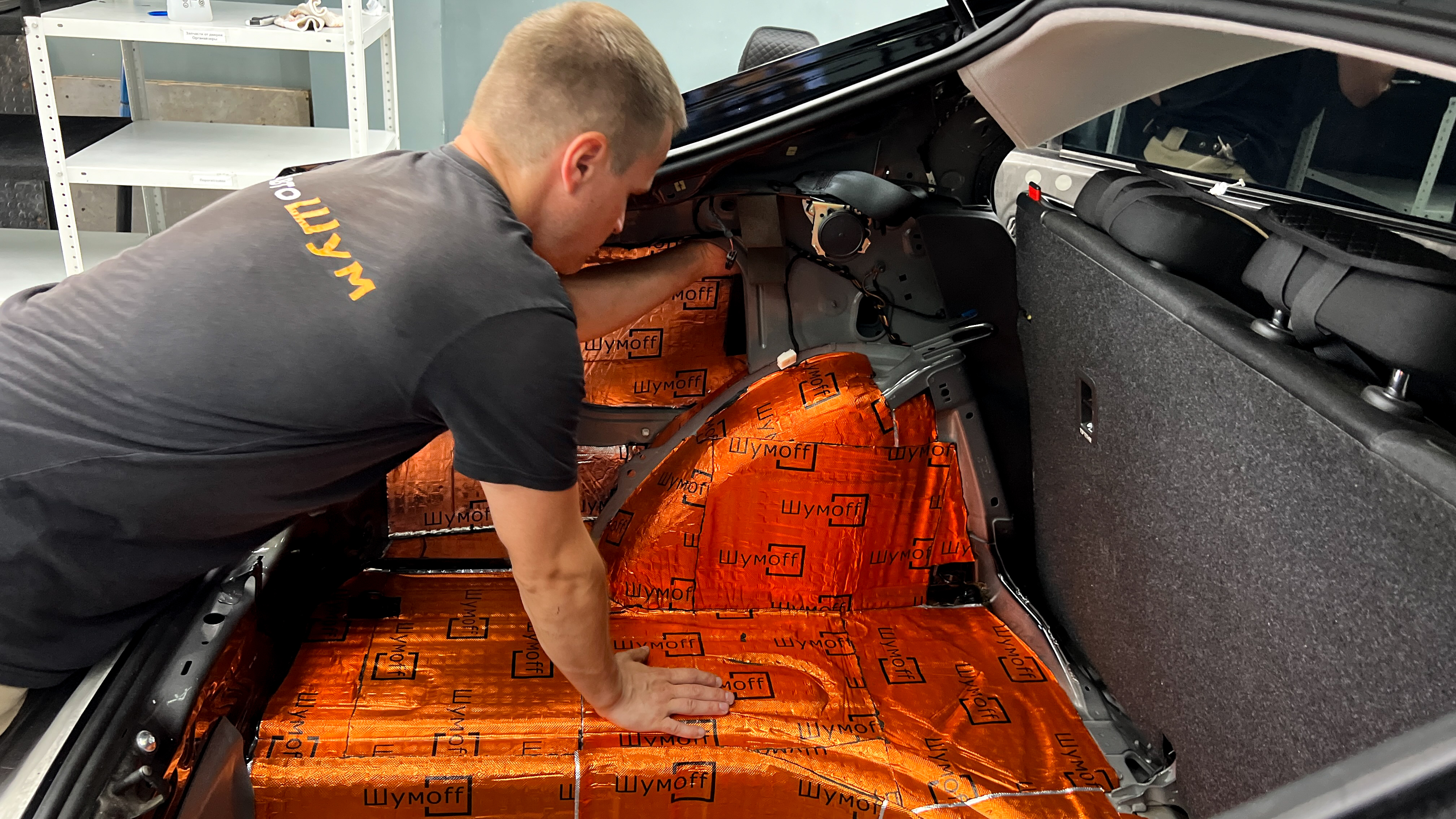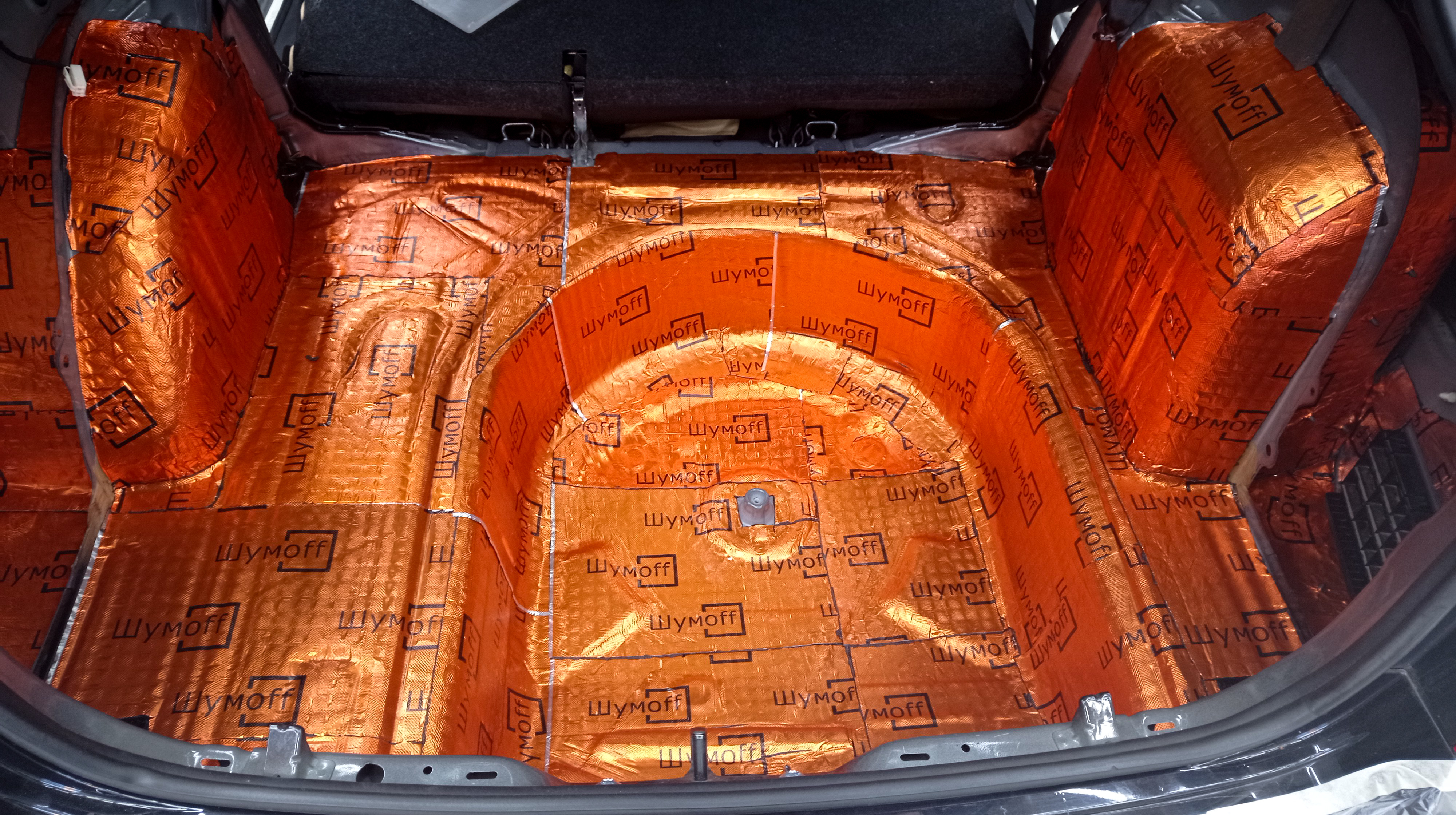 Дно багажника и крылья оклеиваются шумо и теплоизолятором Шумофф П4 4. Арки оклеиваются шумопоглотителем Flex A15.