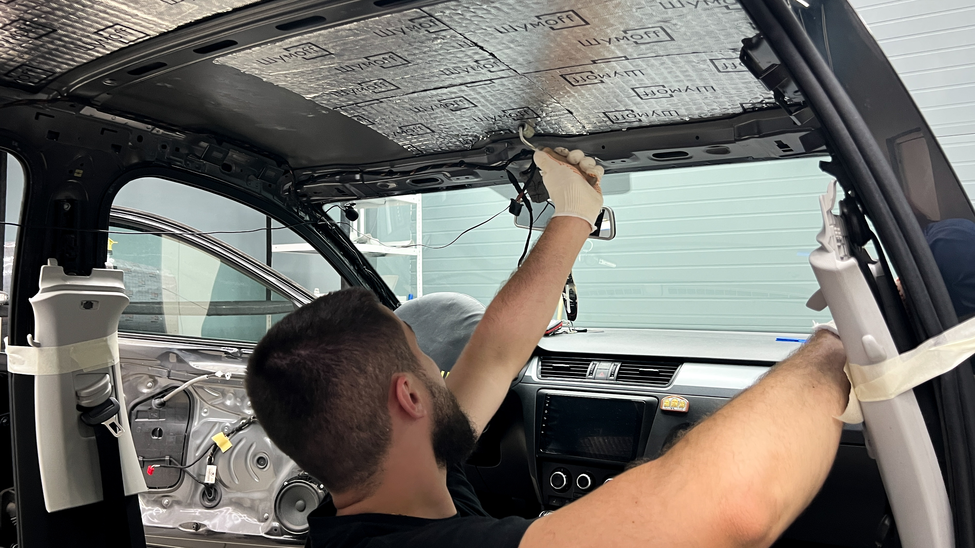 Вторым слоем поверх виброизоляции клеим на крышу современный и очень эффективный шумопоглотитель Шумофф Absorber А15.