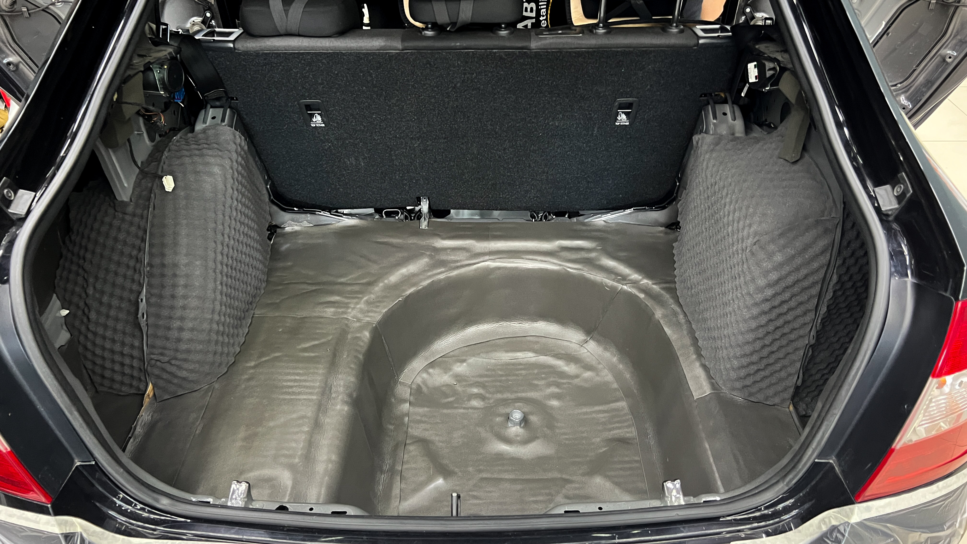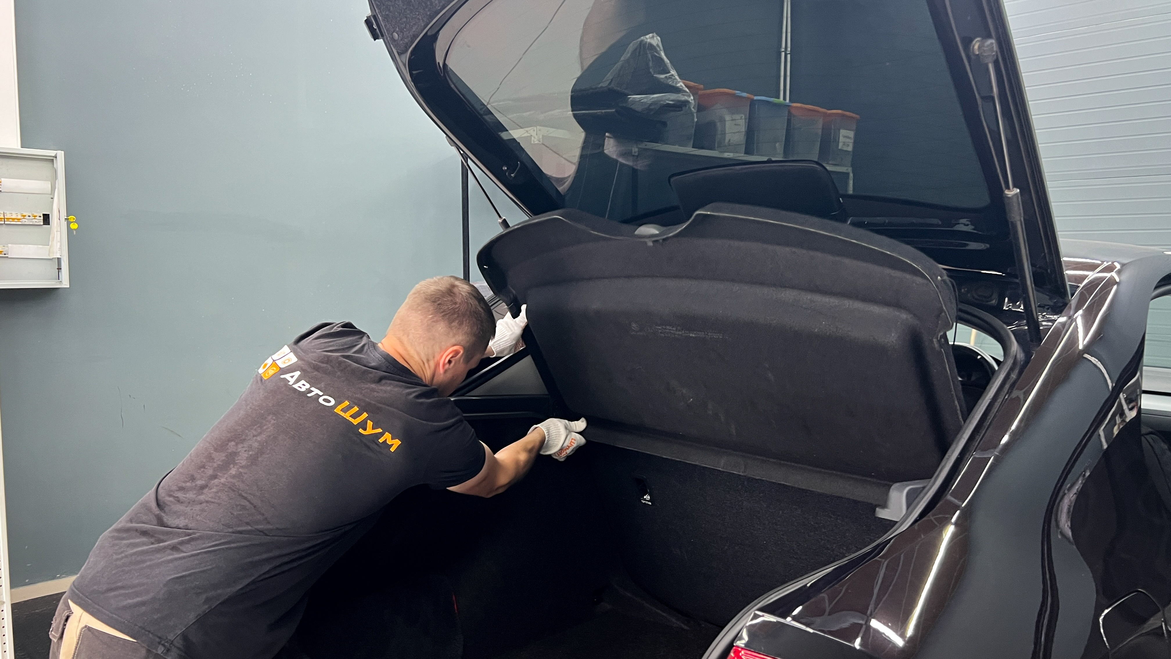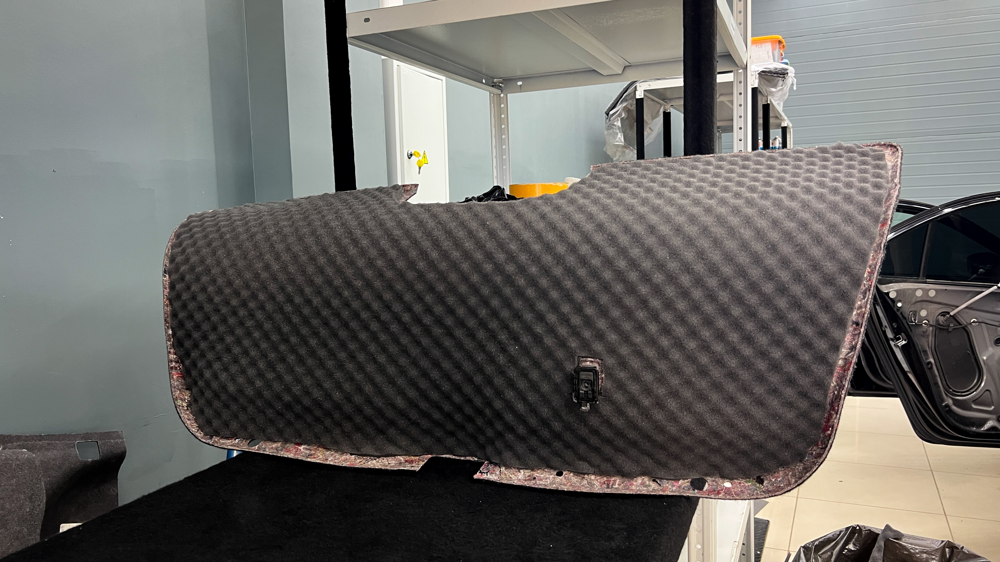 Разбираем багажник, все детали складываем на специальный стеллаж. Штатная шумоизоляция багажника практически отсутствует, при этом еще и плохо держится на кузове. Очищаем и обезжириваем, после приступаем к монтажу