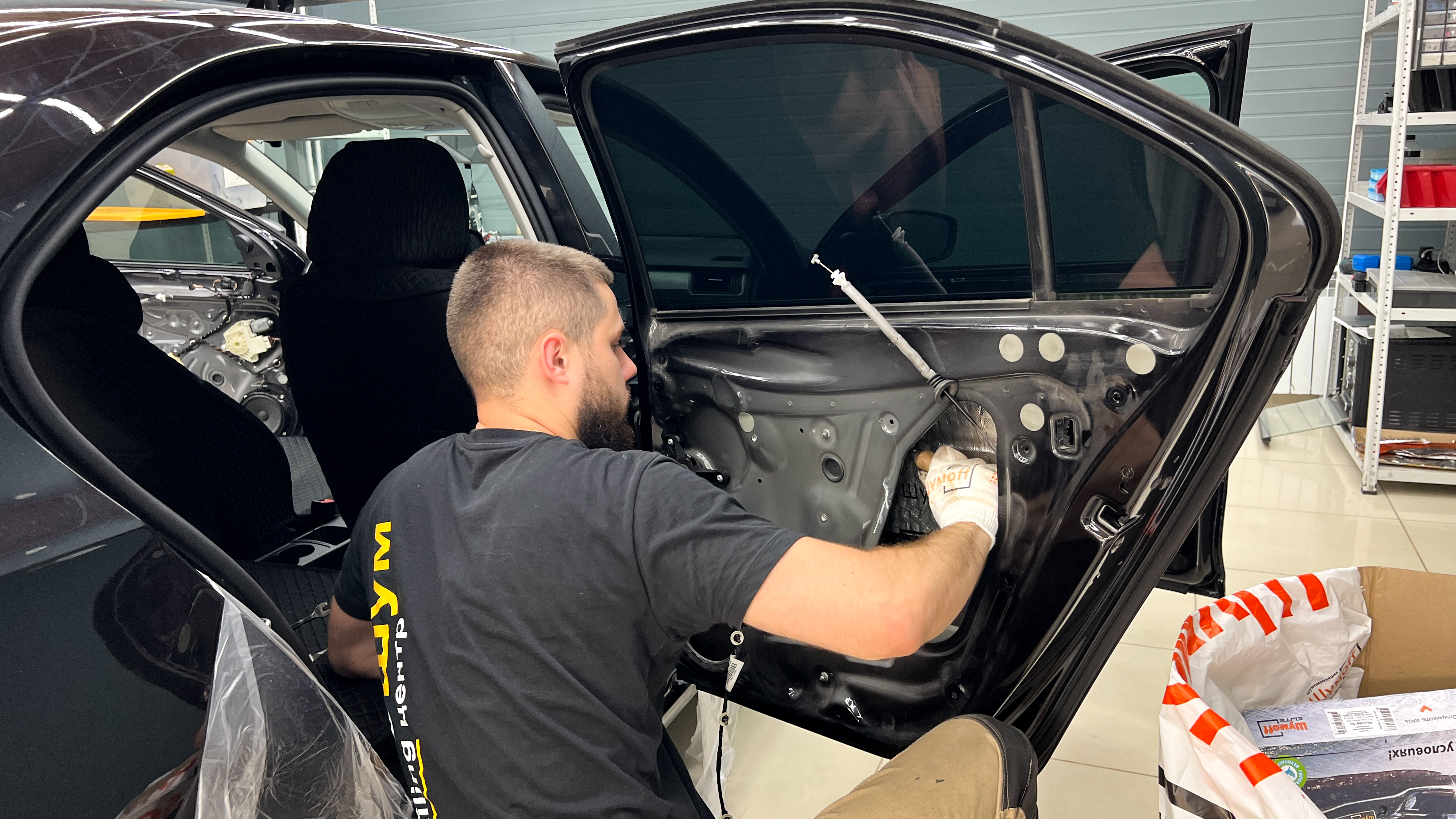 Переходим к дверной обшивке. Убираем штатную шумоизоляцию иобезжириваем поверхность. Всю внутреннюю поверхность оклеиваем мощным шумопоглотителем Шумофф Absorber А15.
