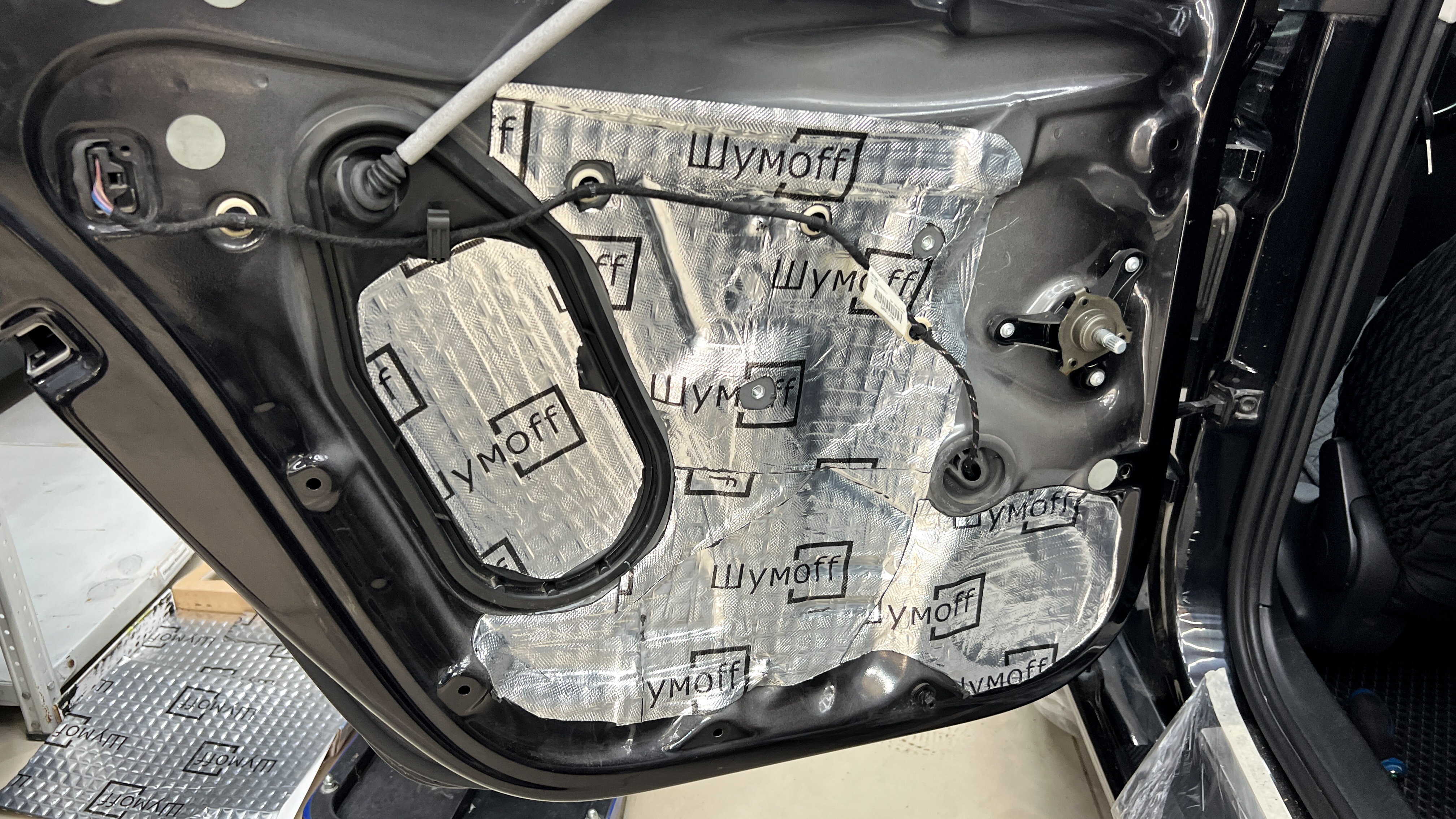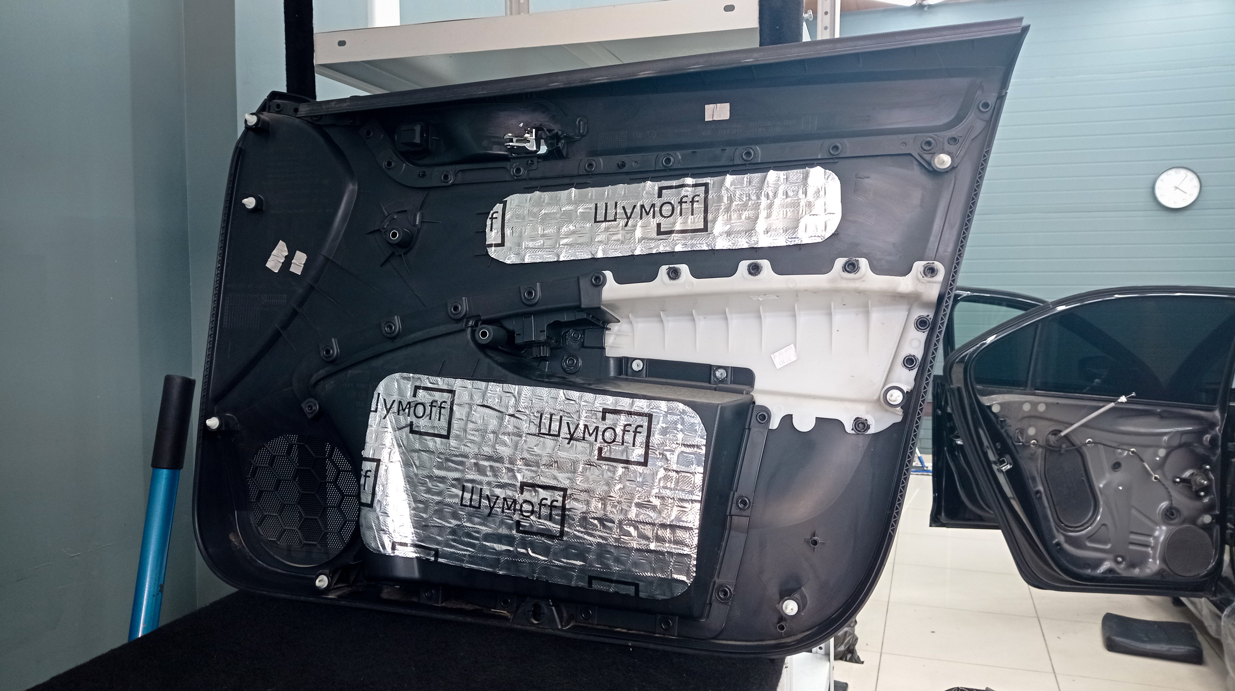 После чего приступаем к оклейке второго слоя виброизоляцией Шумофф М2. Второй слой в совокупности с первым улучшает звучание акустики, а также засчет увеличения массы, двери будут закрываться более четко, тихо и плотно.