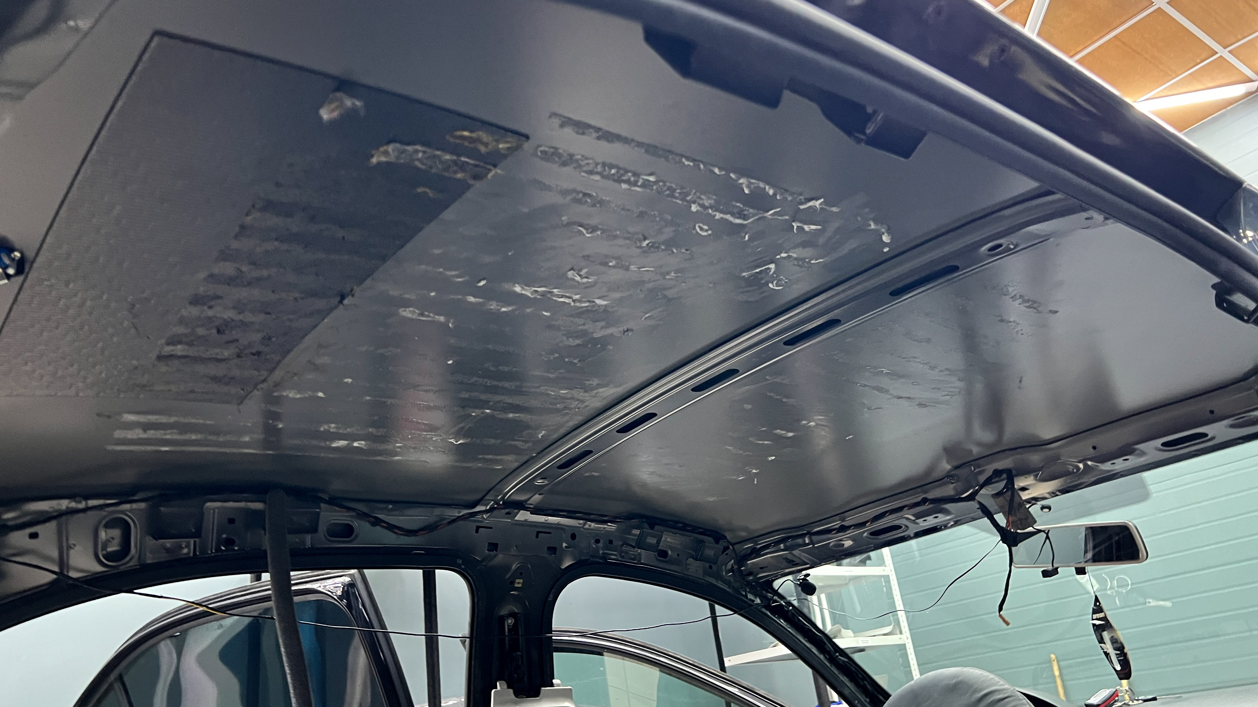 Штатная шумоизоляция крыши полностью отсутствует. Обезжириваем поверхность для начала монтажа виброизоляции.