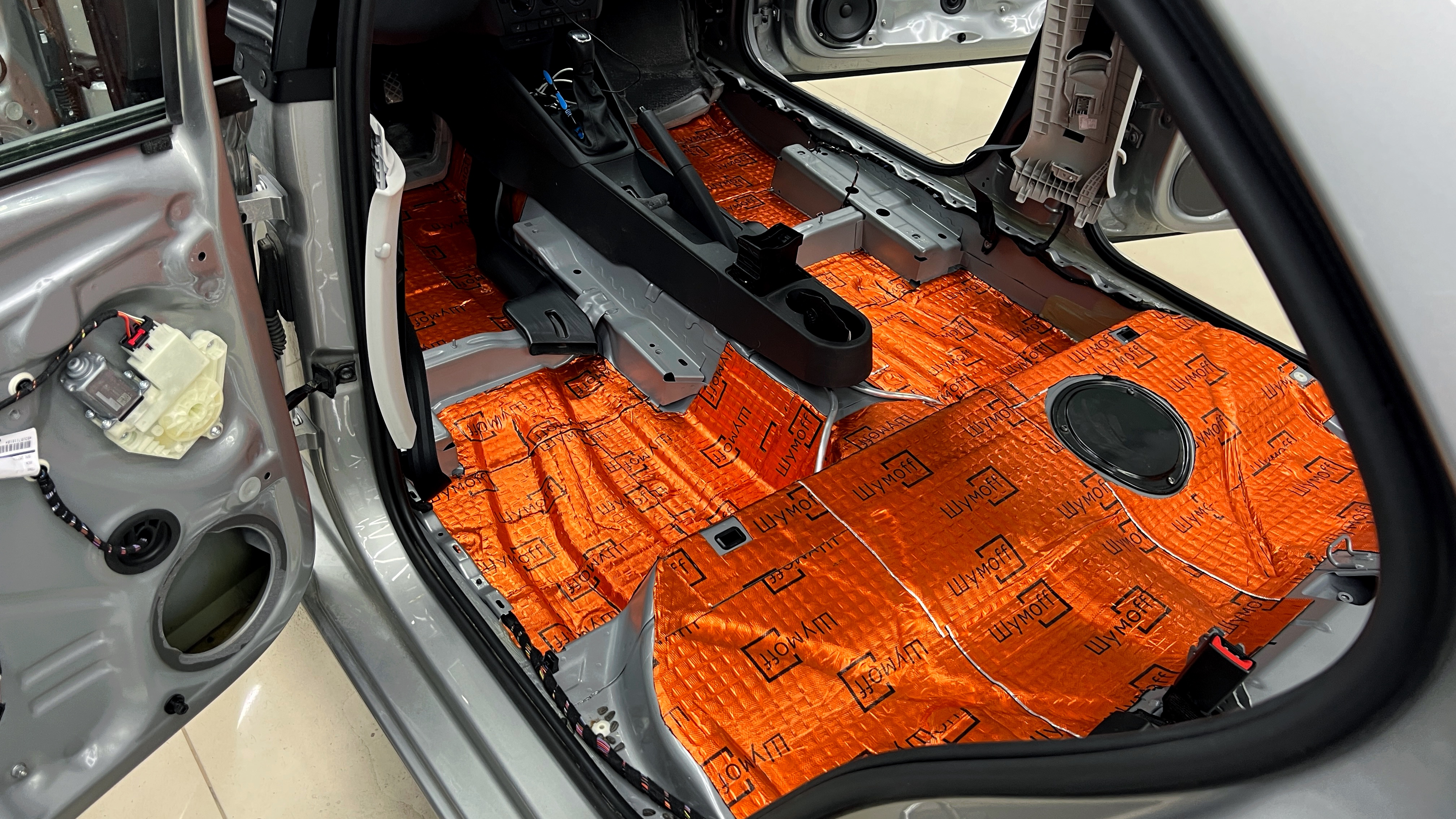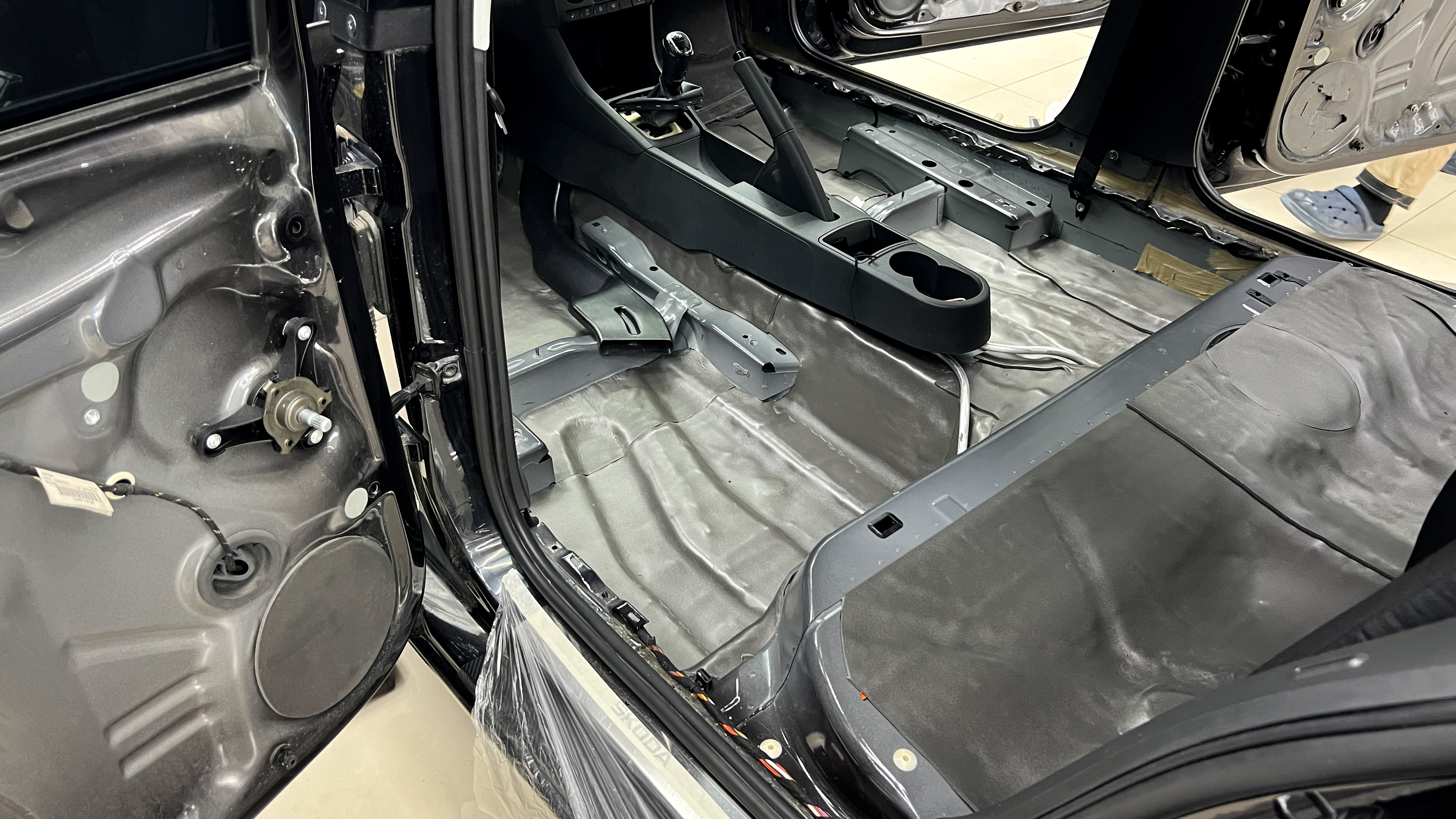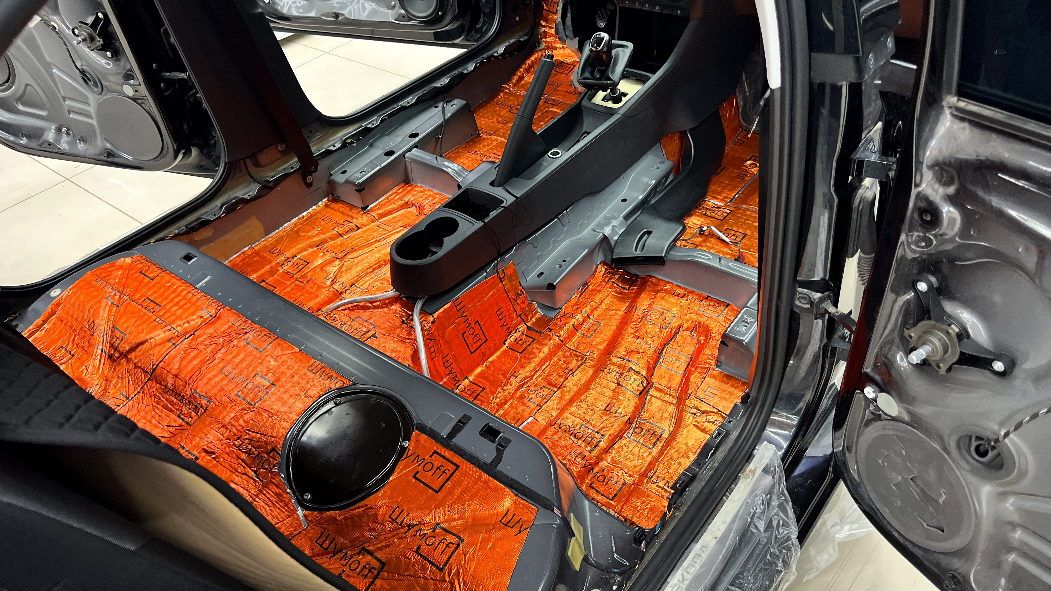 От моторной перегородки и до заднего сиденья вмести с ним клеится мощный многослойный шумо и звукоизолятор Шумофф Prizma 6.
