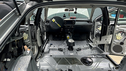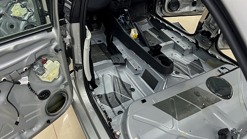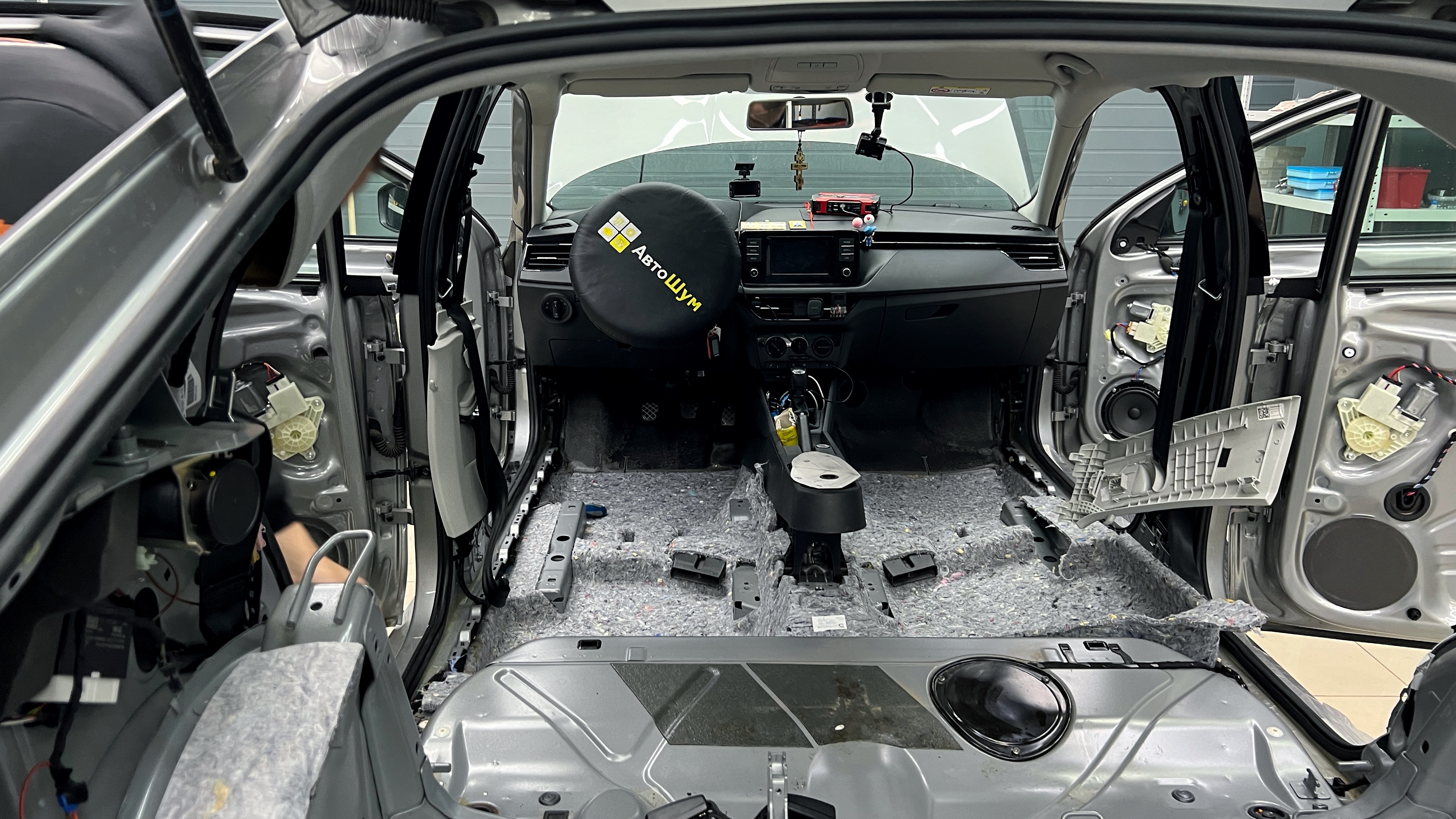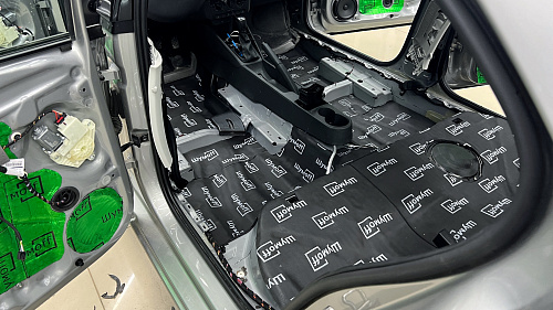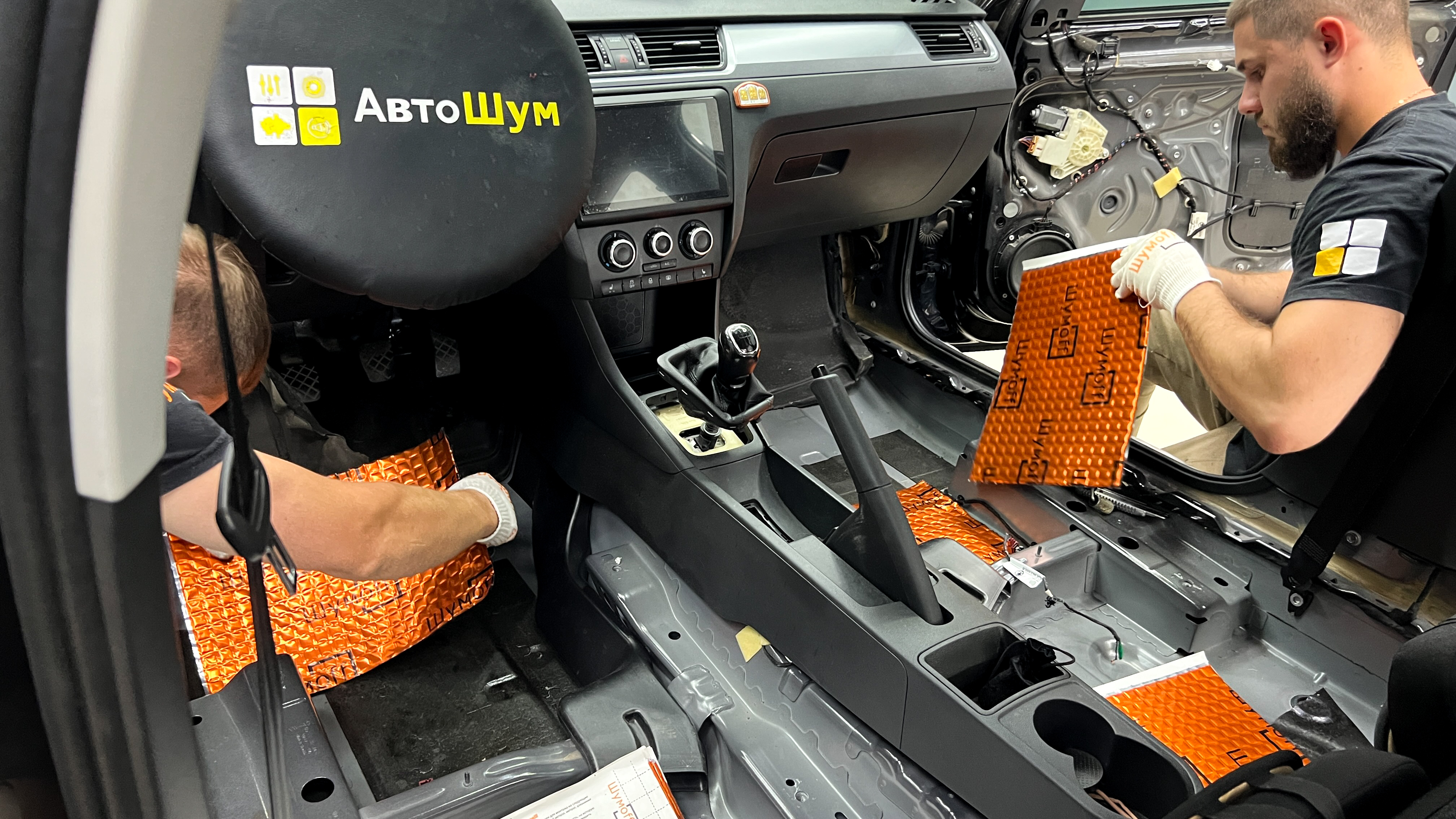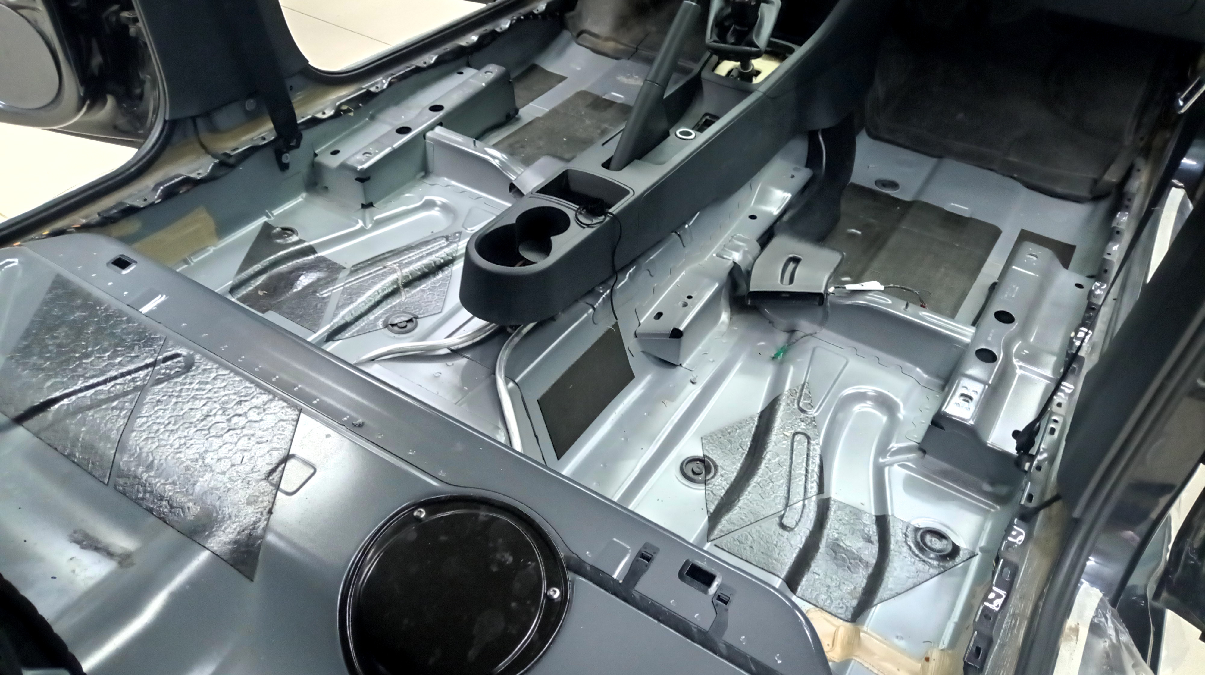 От моторной перегородки и до заднего сиденья вмести с ним клеится мощный многослойный шумо и звукоизолятор Шумофф Prizma 6.