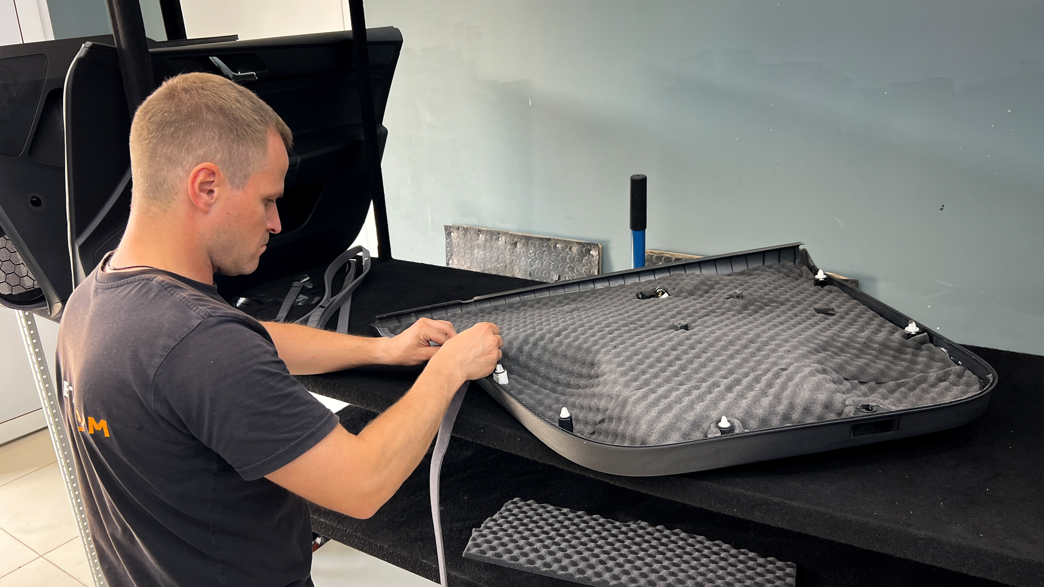 Внутренняя поверхность обивки оклеивается шумопоглотителем Flex А15.
