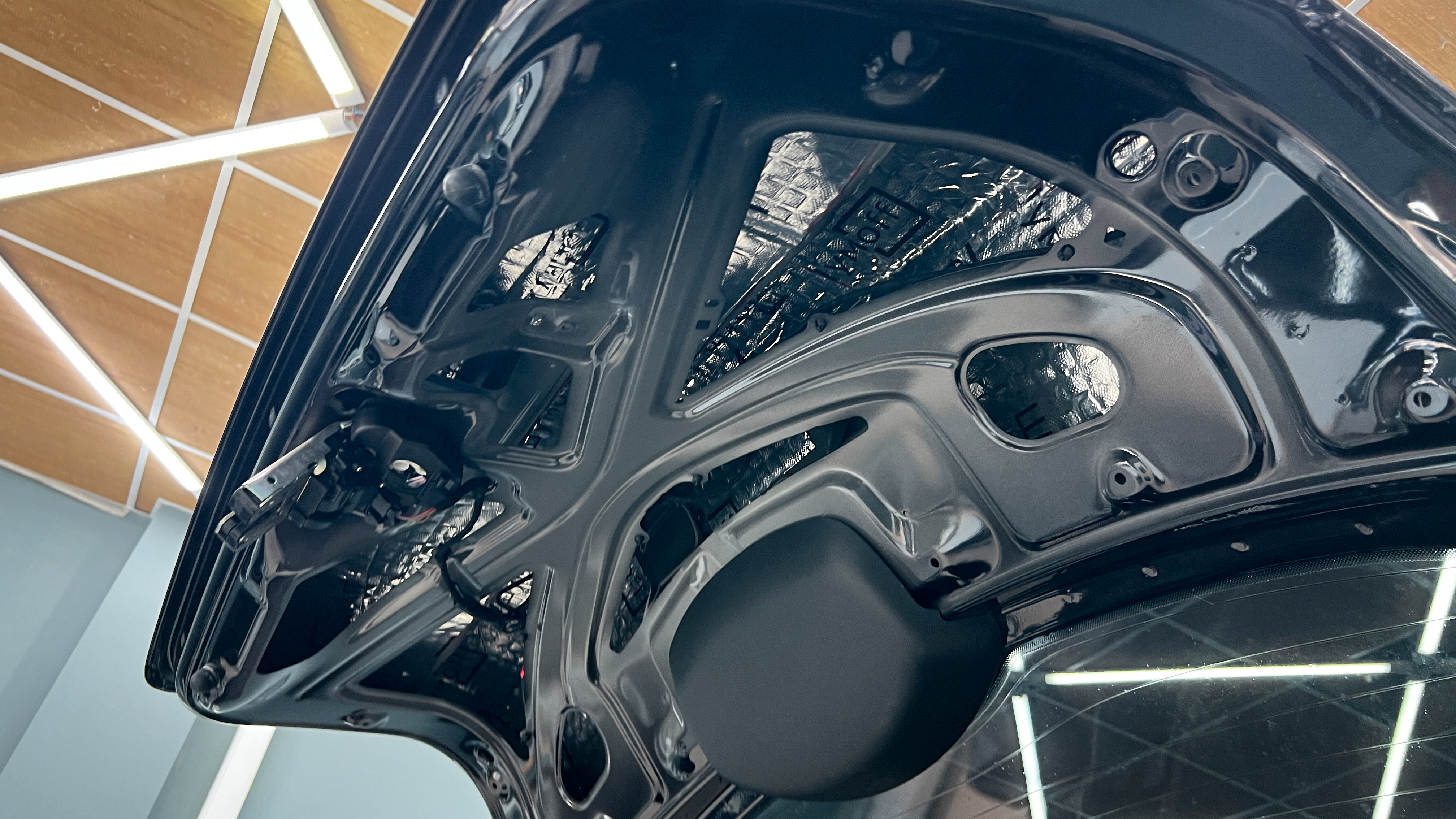 На арки клеим также Шумофф М3, а для крыльев используем менее тяжелый М2. Оклеиваем максимальную площадь багажника за исключением усилителей и ребер жесткости. Данная компоновка материалов позволит идеально достичь нужной эффективности при минимальном увеличении веса, что вместе с виброизоляцией пола также поможет нам снизить вибрацию от дороги, увеличить целостность и сбитость авто.
