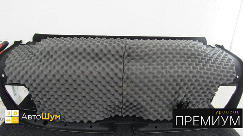Монтируем шумопоглотитель на капот авто Вторым слоем, но уже на обшивку капота наносим шумопоглотитель Шумофф Absorber A15. Данная компоновка позволит нам не просто снизить шум от двигателя, но и увеличить теплоизоляцию подкапотного пространства, от чего двигатель будет быстрее прогревается и медленнее остывать зимой.