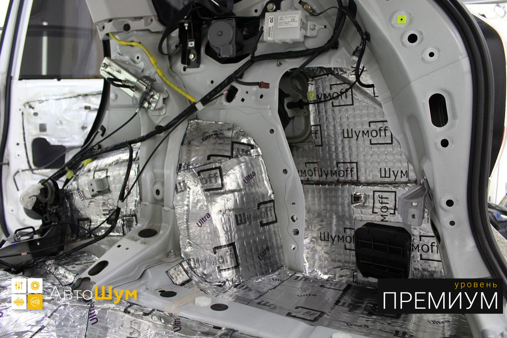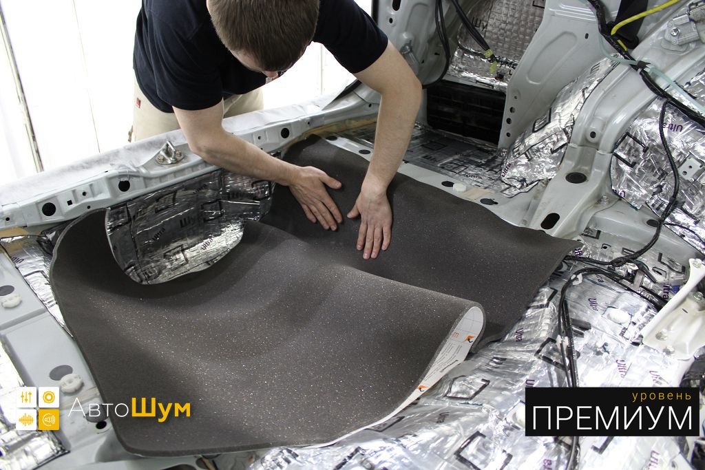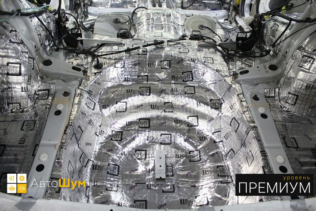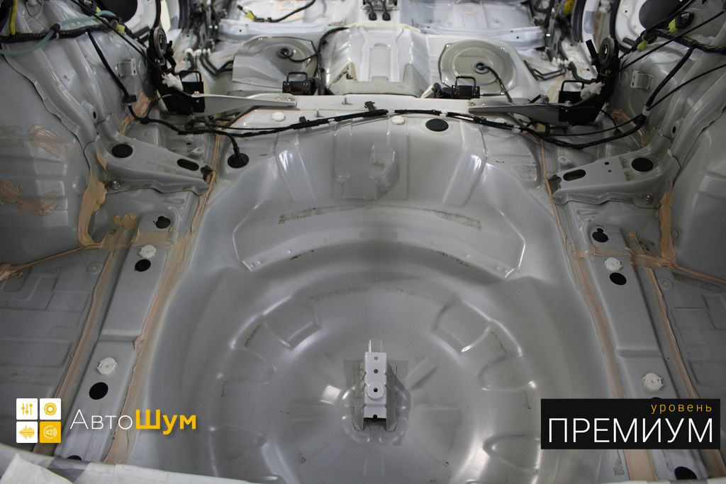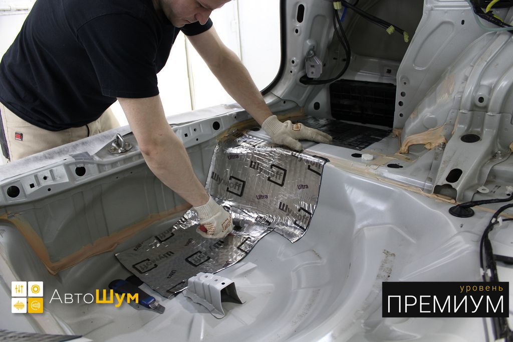 Дно оклеивается многослойным шумо и звукоизолятором Шумофф Prizma 6, крылья, арки и крышка багажника шумопоглотителем Absorber A15.