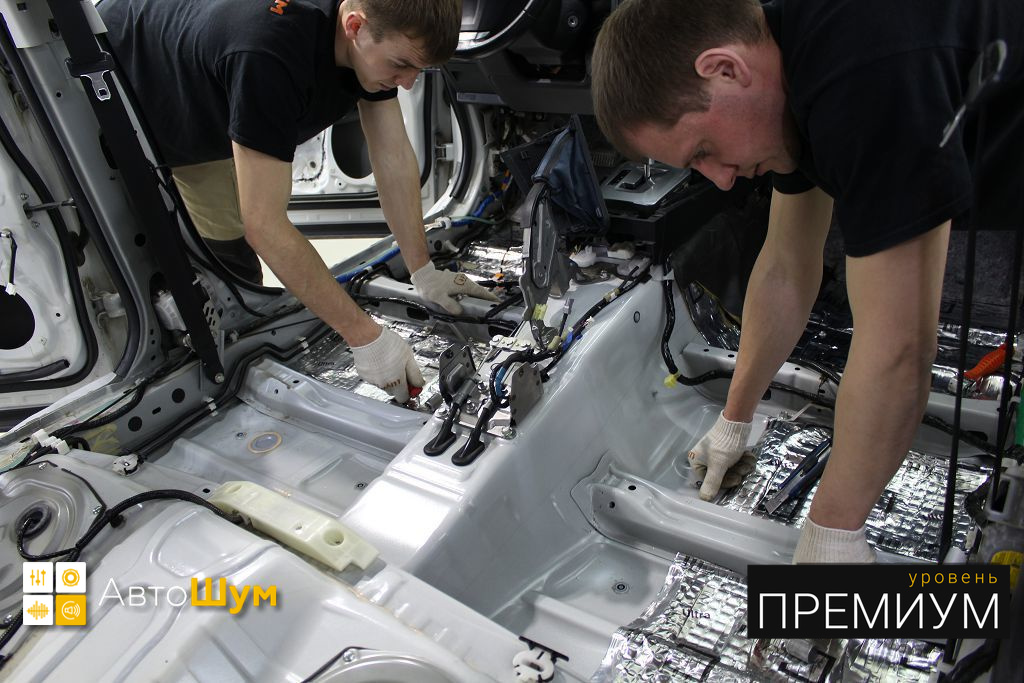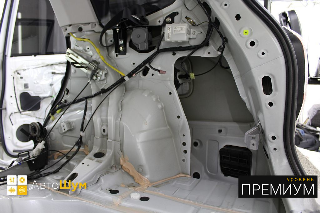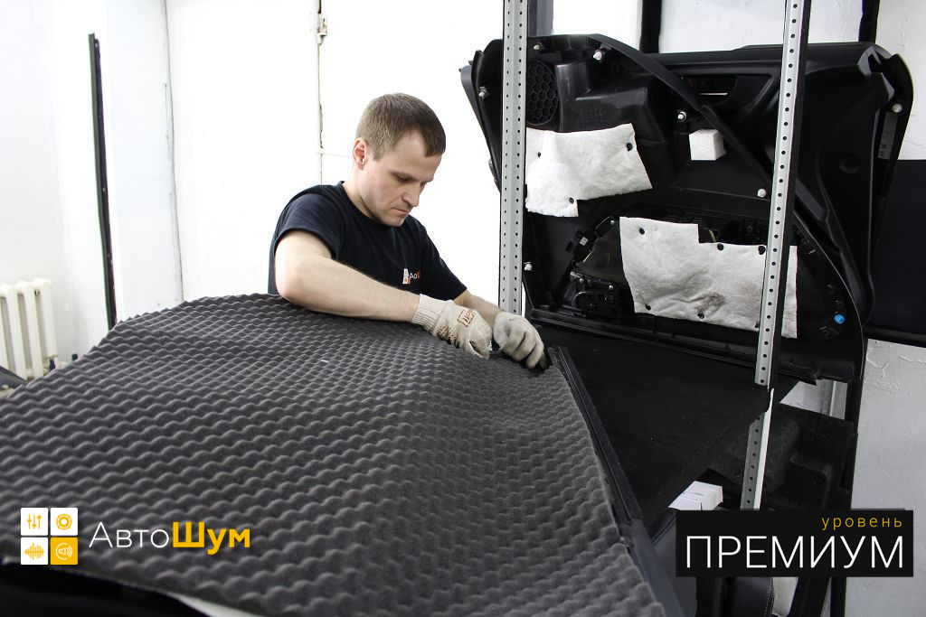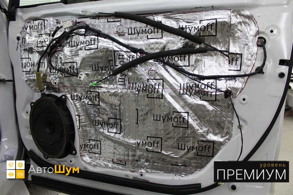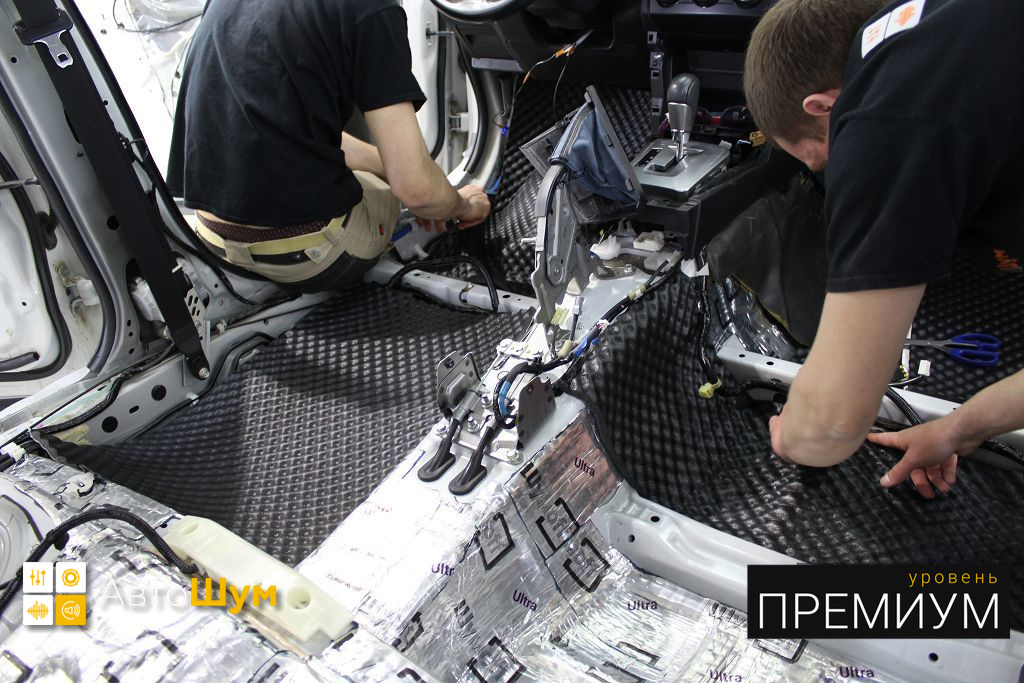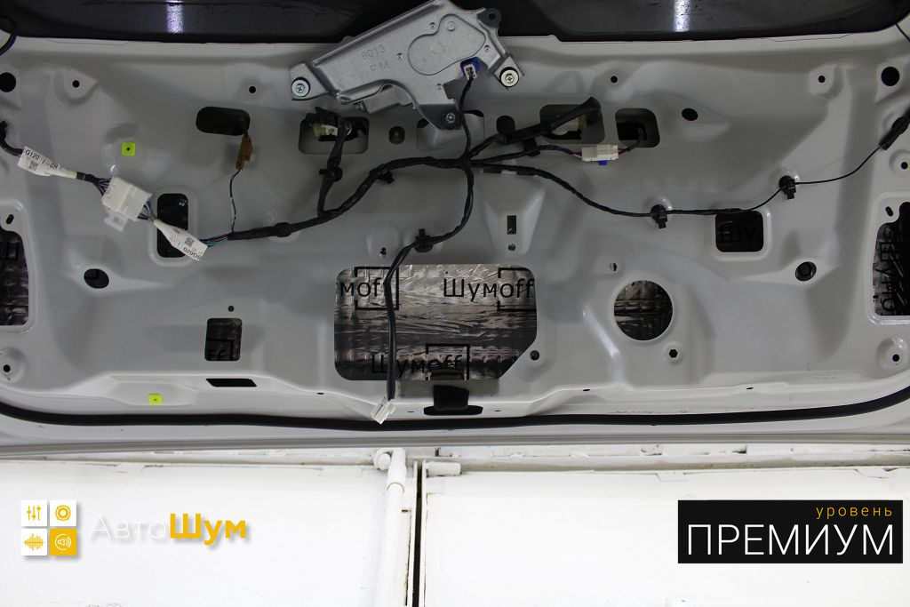 Дно оклеивается многослойным шумо и звукоизолятором Шумофф Prizma 6, крылья, арки и крышка багажника шумопоглотителем Absorber A15.