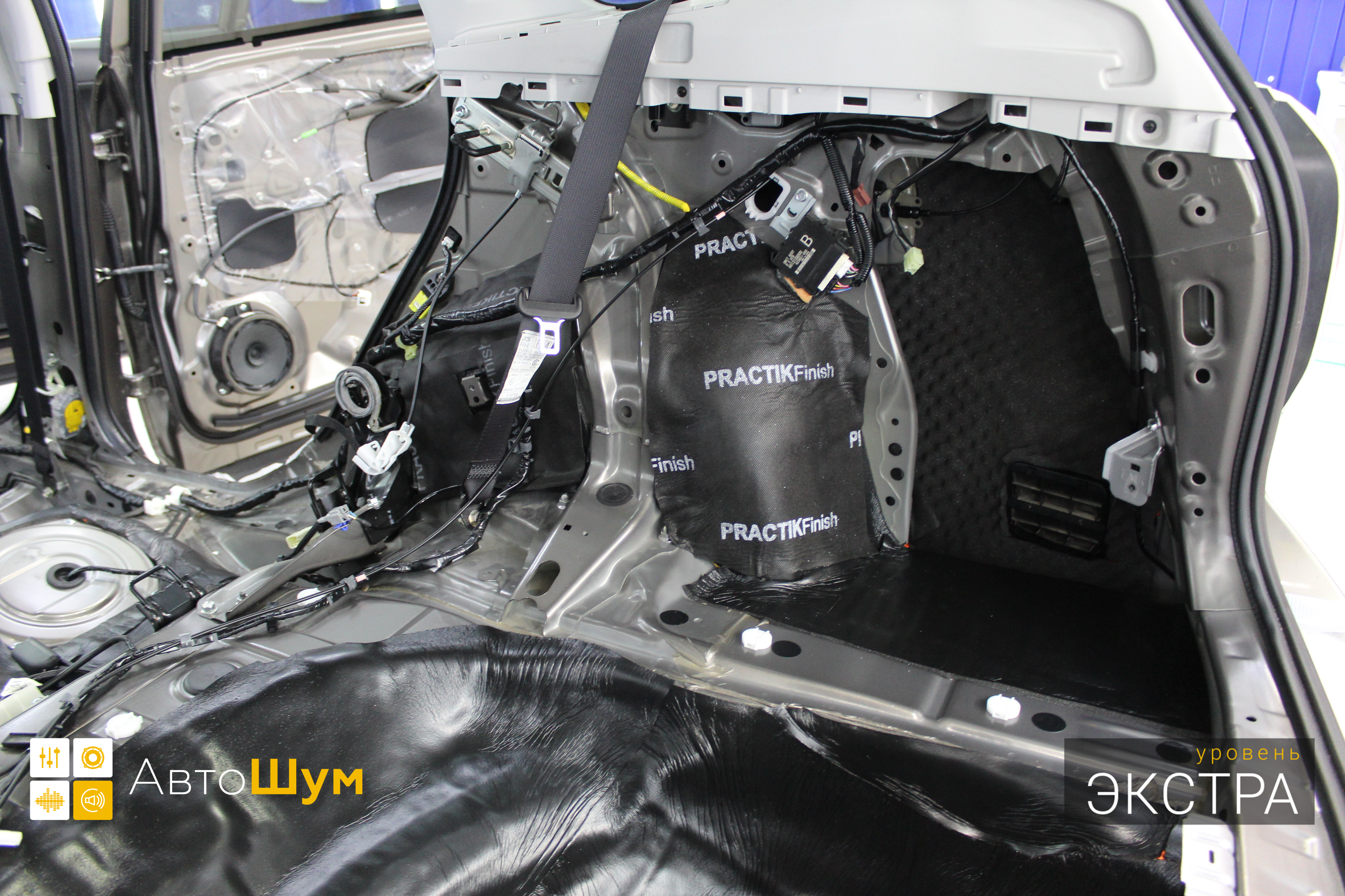 Дно багажника и крылья оклеиваются шумо и теплоизолятором Шумофф П4 4. Арки оклеиваются шумопоглотителем Flex A15.
