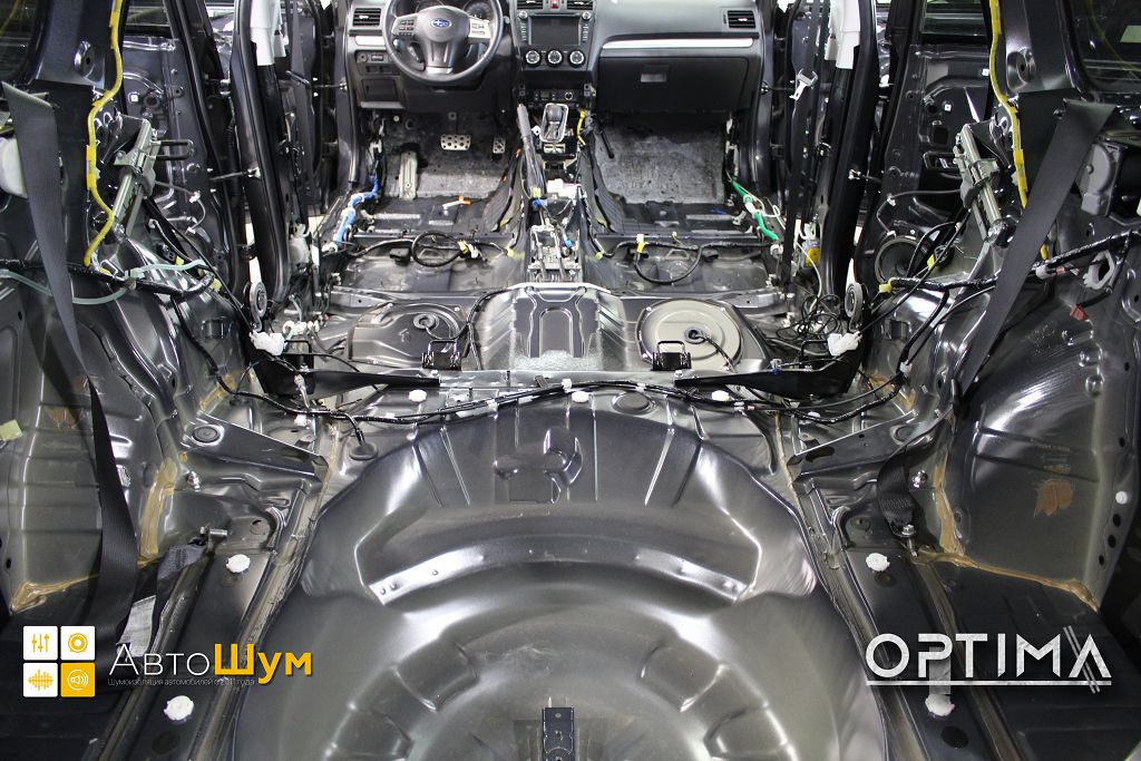 Звукоизоляция днища Субару Форестер. В итоге получаем лучшую компоновку материалов для шумоизоляции пола, какую только позволяет разместить свободное пространство под ковром.