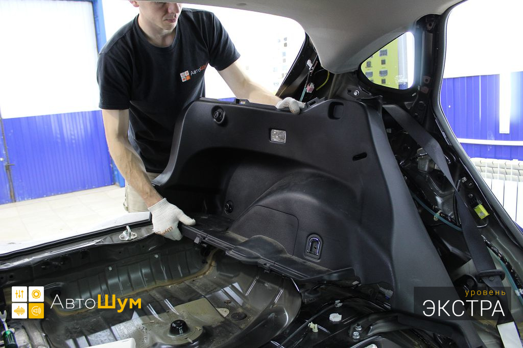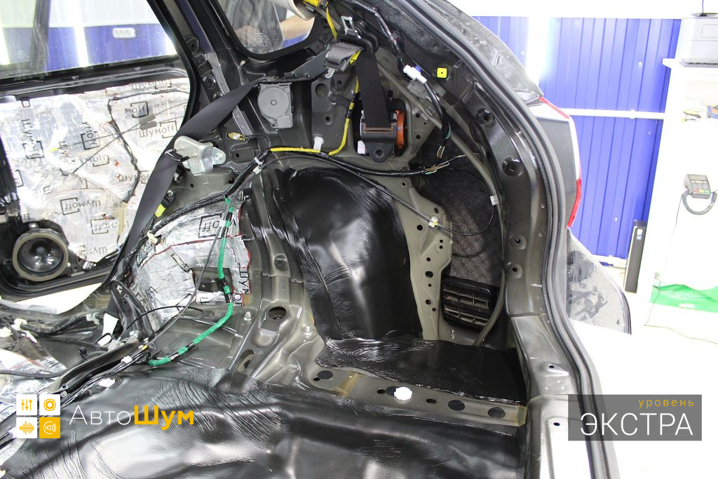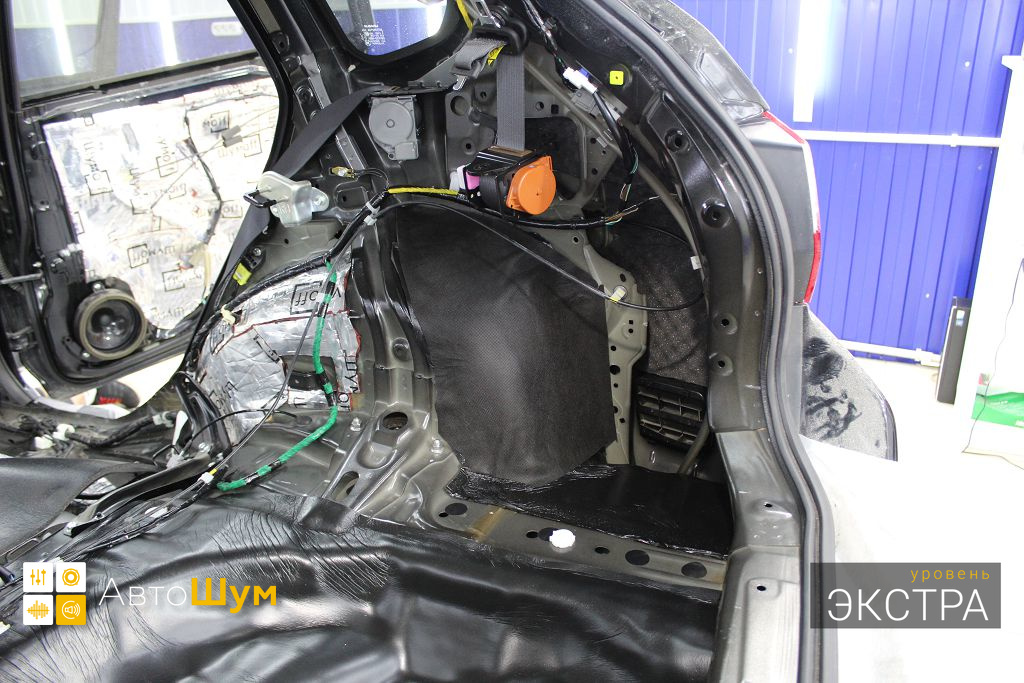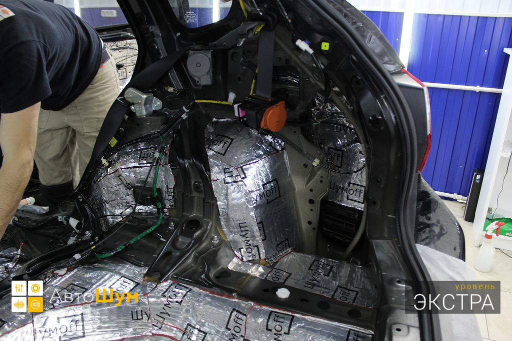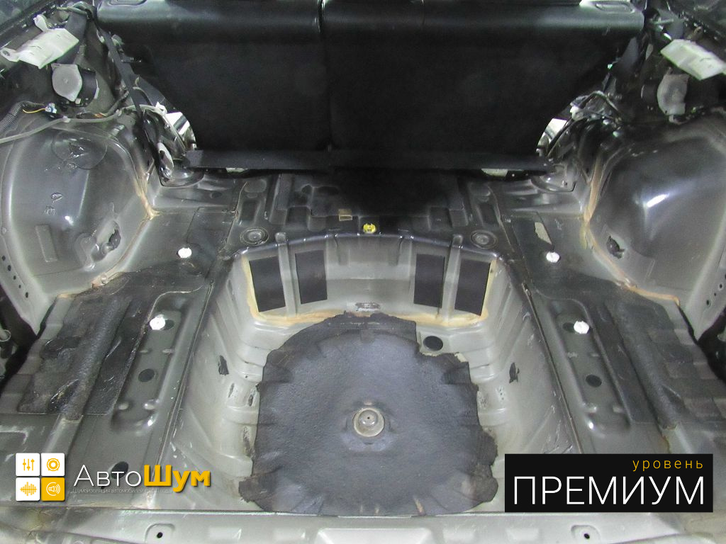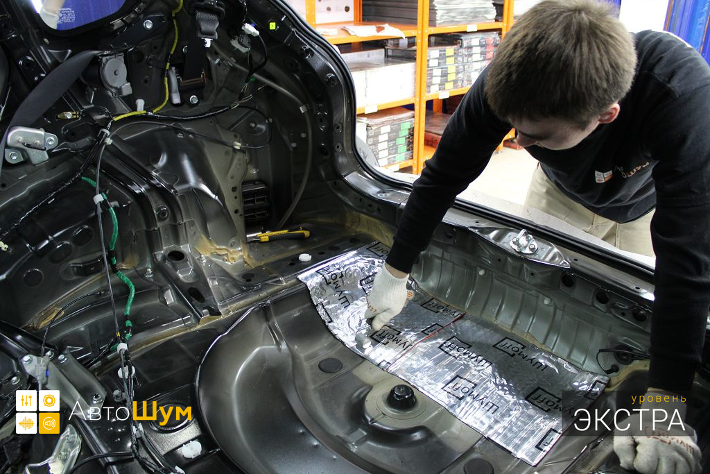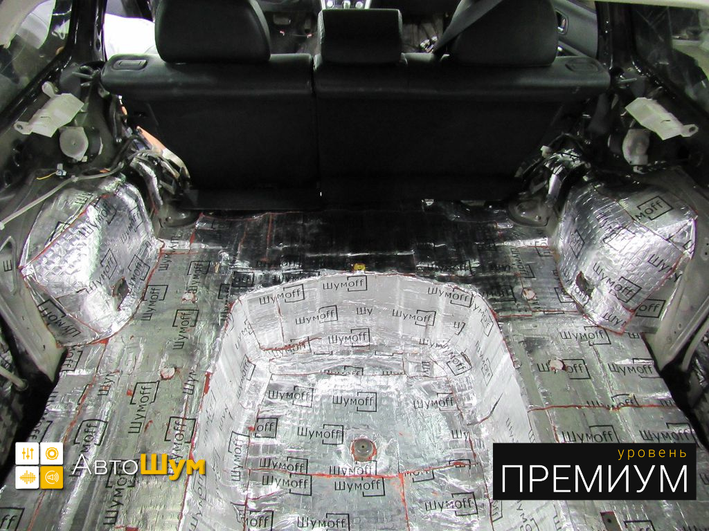 Дно багажника и крылья оклеиваются шумо и теплоизолятором Шумофф П4 4. Арки оклеиваются шумопоглотителем Flex A15.