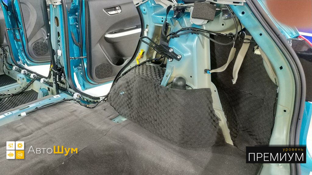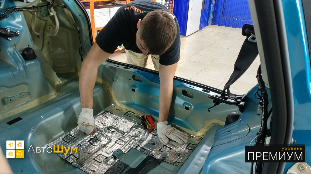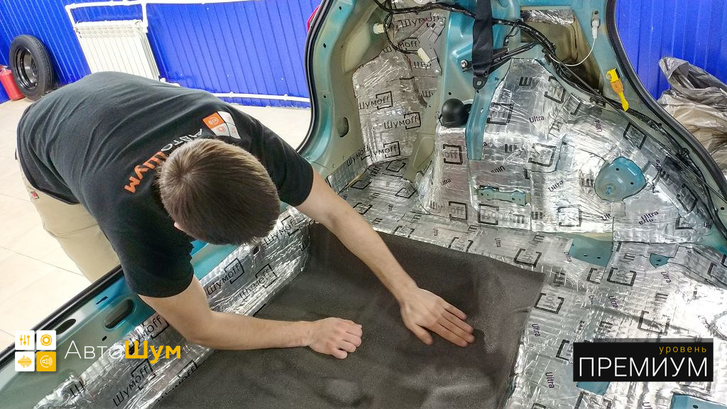 Дно багажника и крылья оклеиваются шумо и теплоизолятором Шумофф П4 4. Арки оклеиваются шумопоглотителем Flex A15.