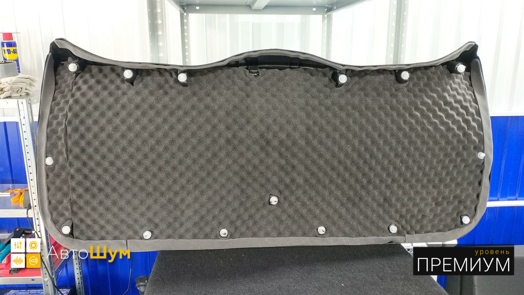 Вторым слоем, но уже на обшивку капота наносим шумопоглотитель Шумофф Absorber A15. Данная компоновка позволит нам не просто снизить шум от двигателя, но и увеличить теплоизоляцию подкапотного пространства, от чего двигатель будет быстрее прогревается и медленнее остывать зимой.
