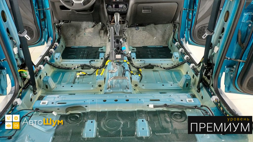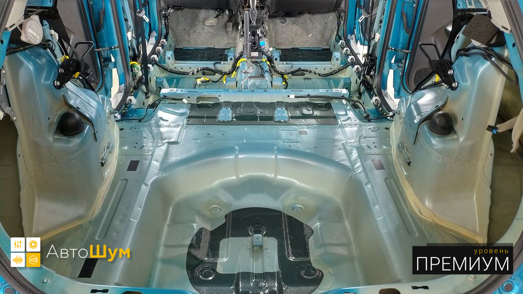 От моторной перегородки и до заднего сиденья вмести с ним клеится мощный многослойный шумо и звукоизолятор Шумофф Prizma 6.