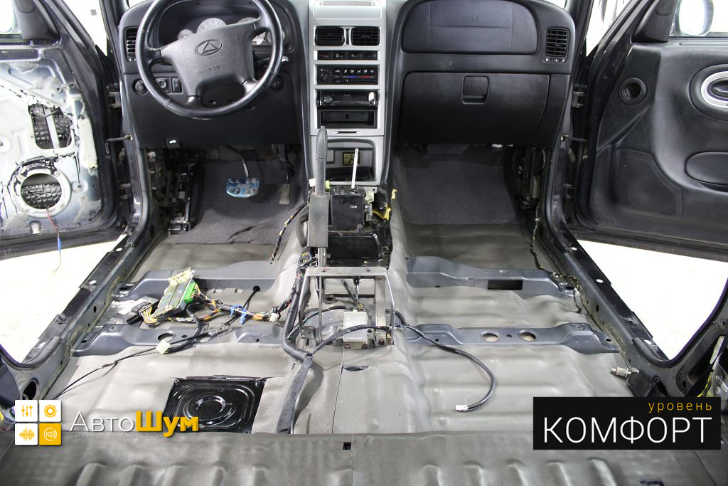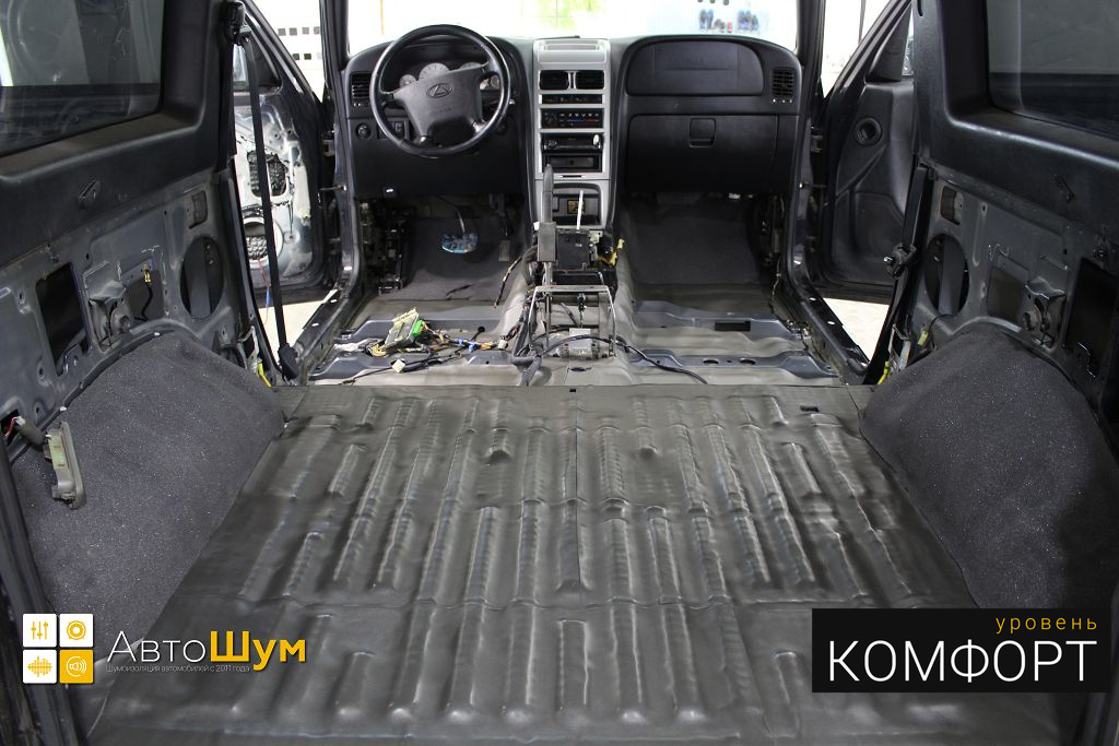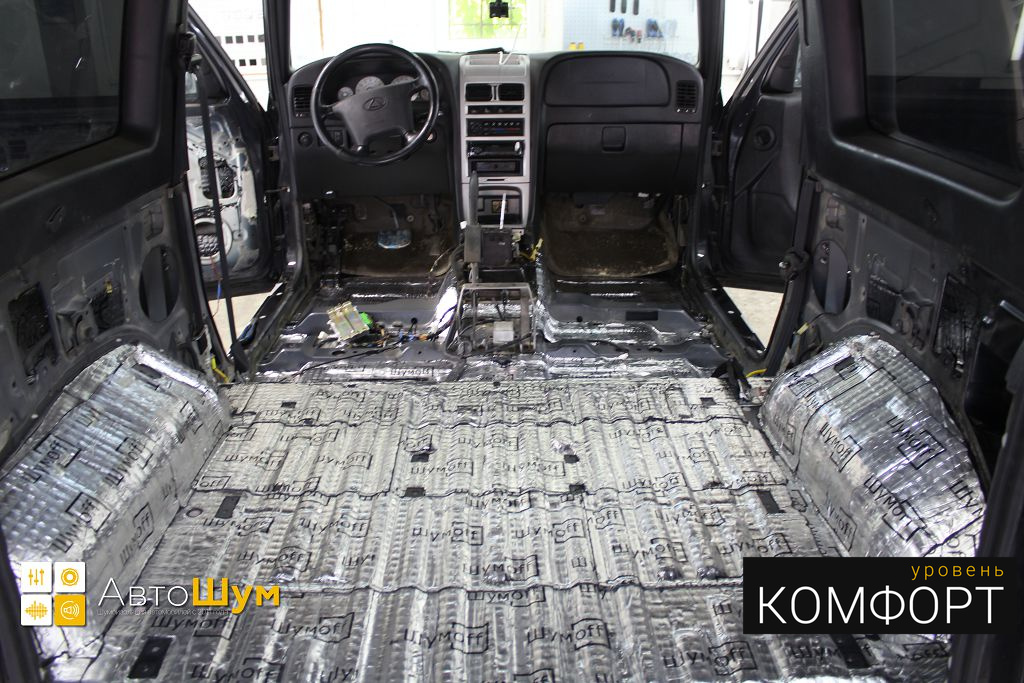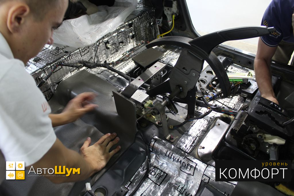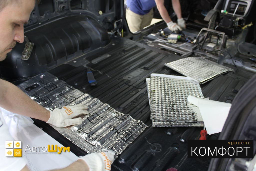 Дно оклеивается многослойным шумо и звукоизолятором Шумофф Prizma 6, крылья, арки и крышка багажника шумопоглотителем Absorber A15.