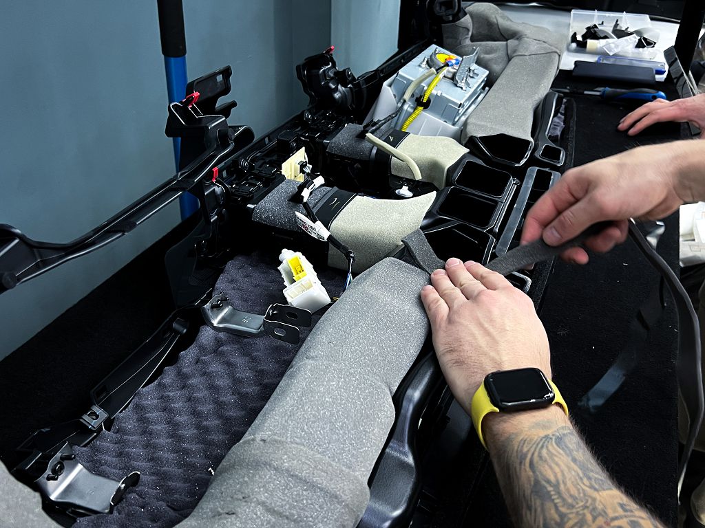 Последним этапом оклеиваем все провода антискрипным материалом и завершаем шумоизоляцию панели её обратной сборкой