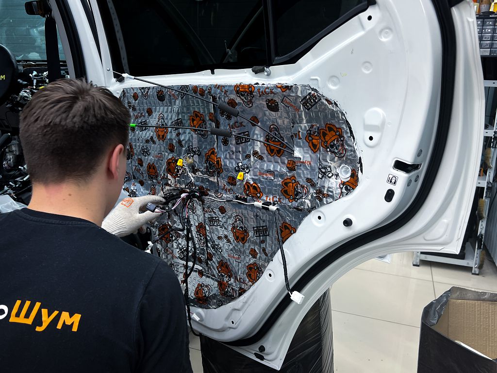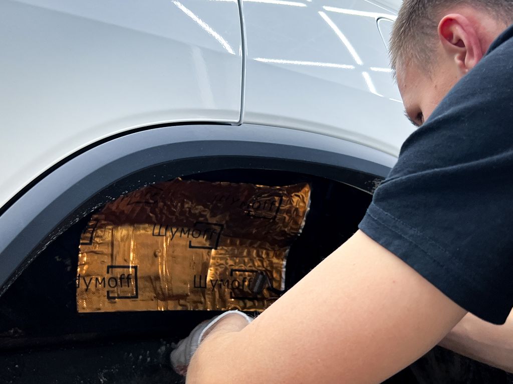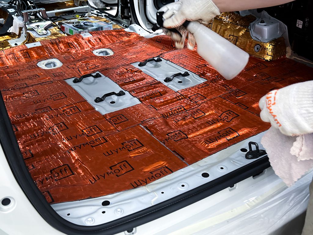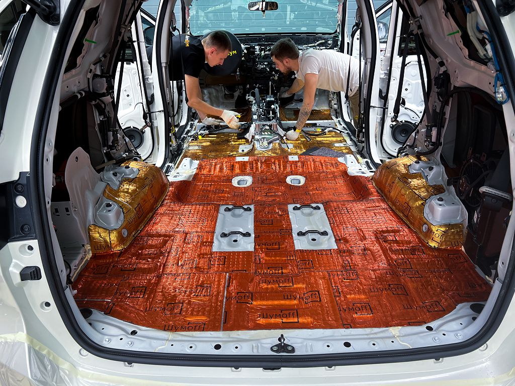 Дно оклеивается многослойным шумо и звукоизолятором Шумофф Prizma 6, крылья, арки и крышка багажника шумопоглотителем Absorber A15.