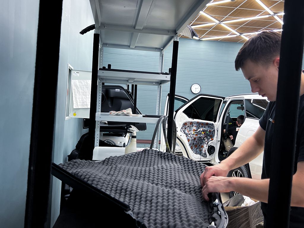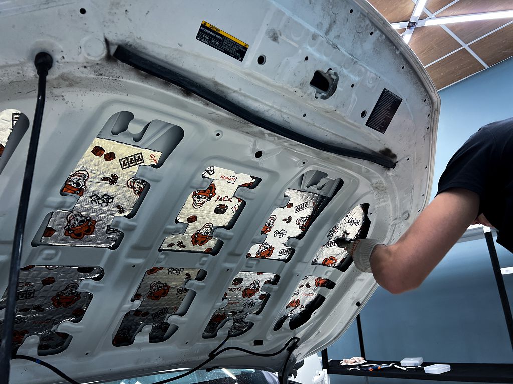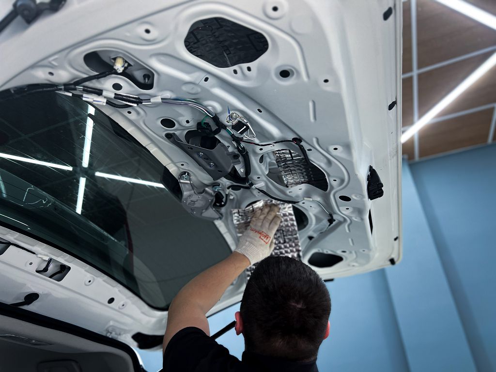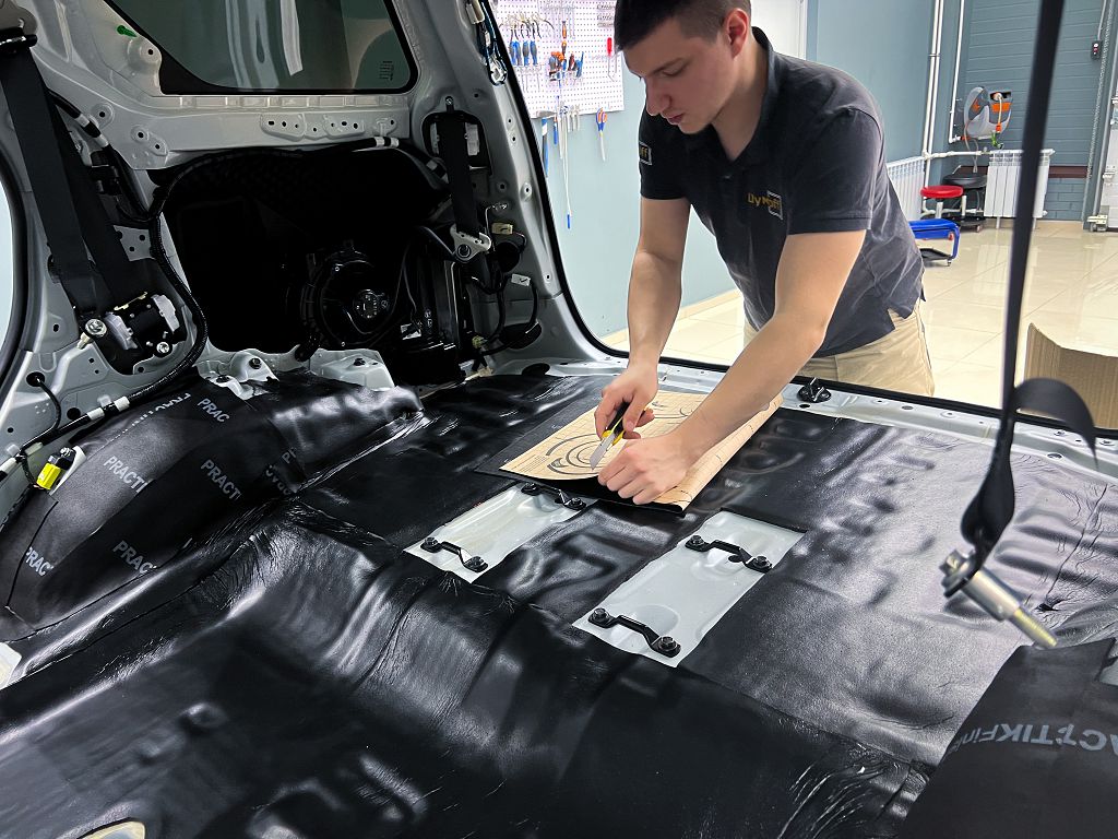 Дно оклеивается многослойным шумо и звукоизолятором Шумофф Prizma 6, крылья, арки и крышка багажника шумопоглотителем Absorber A15.