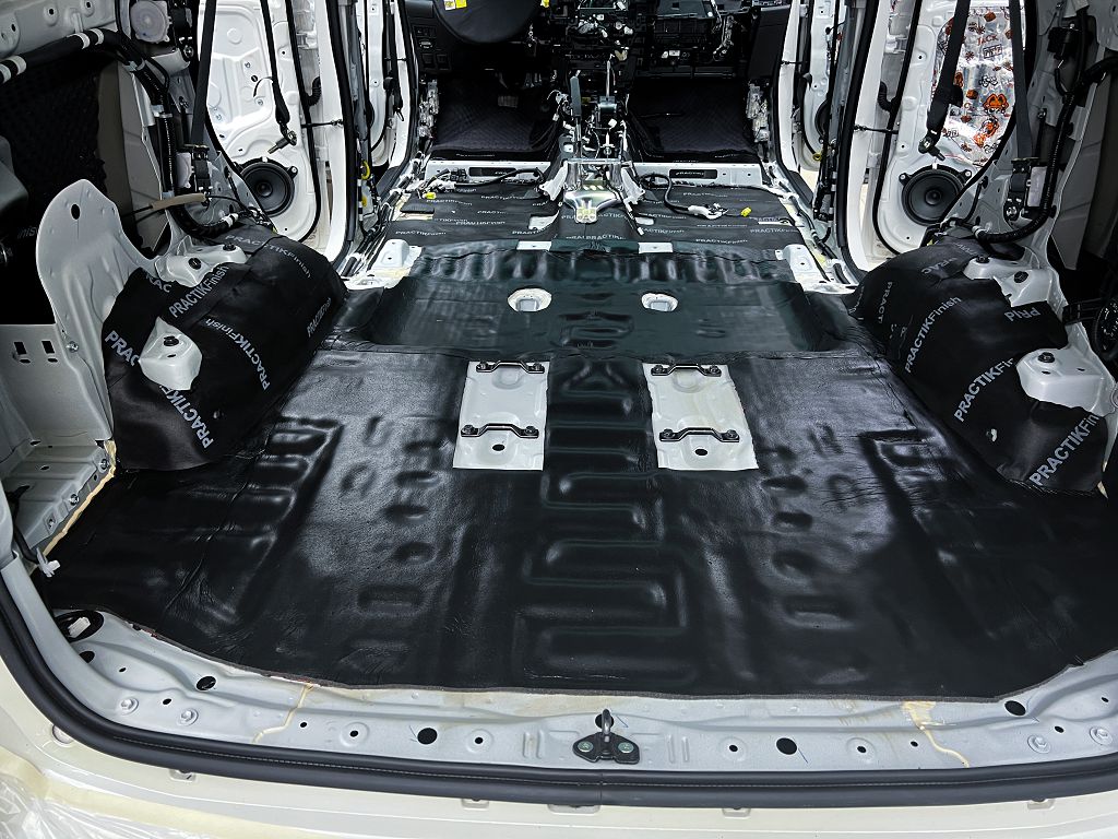 Шумоизоляция пола Тойота Фортунер Максимально вверх к моторной перегородки и до заднего сиденья поверх Герметон 7Л клеим звукоизоляционную мембрану Practik Finish толщиной 2,5 мм. Арки оклеиваем также Practik Finish.