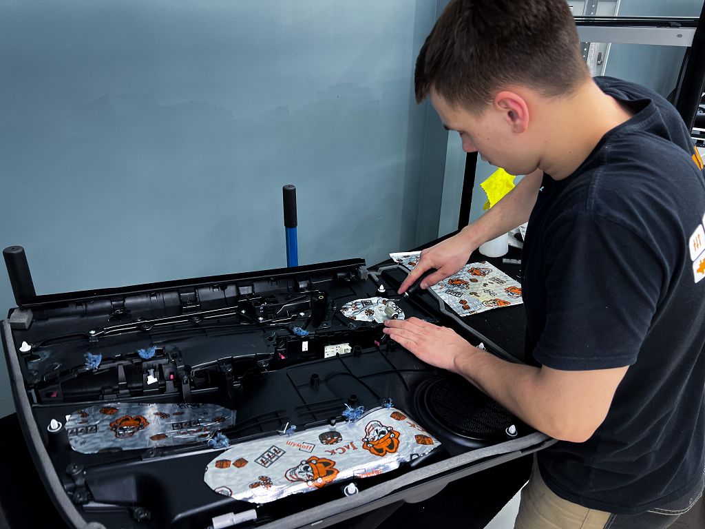 Переходим к оклейке самого корпуса панели, первым слоем частично наносим виброизоляцию Шумофф Joker, создавая тем самым идеальный баланс. Такая частичная оклейка позволит нам чрезмерно не утяжелять панель и придать ей необходимую сбитость