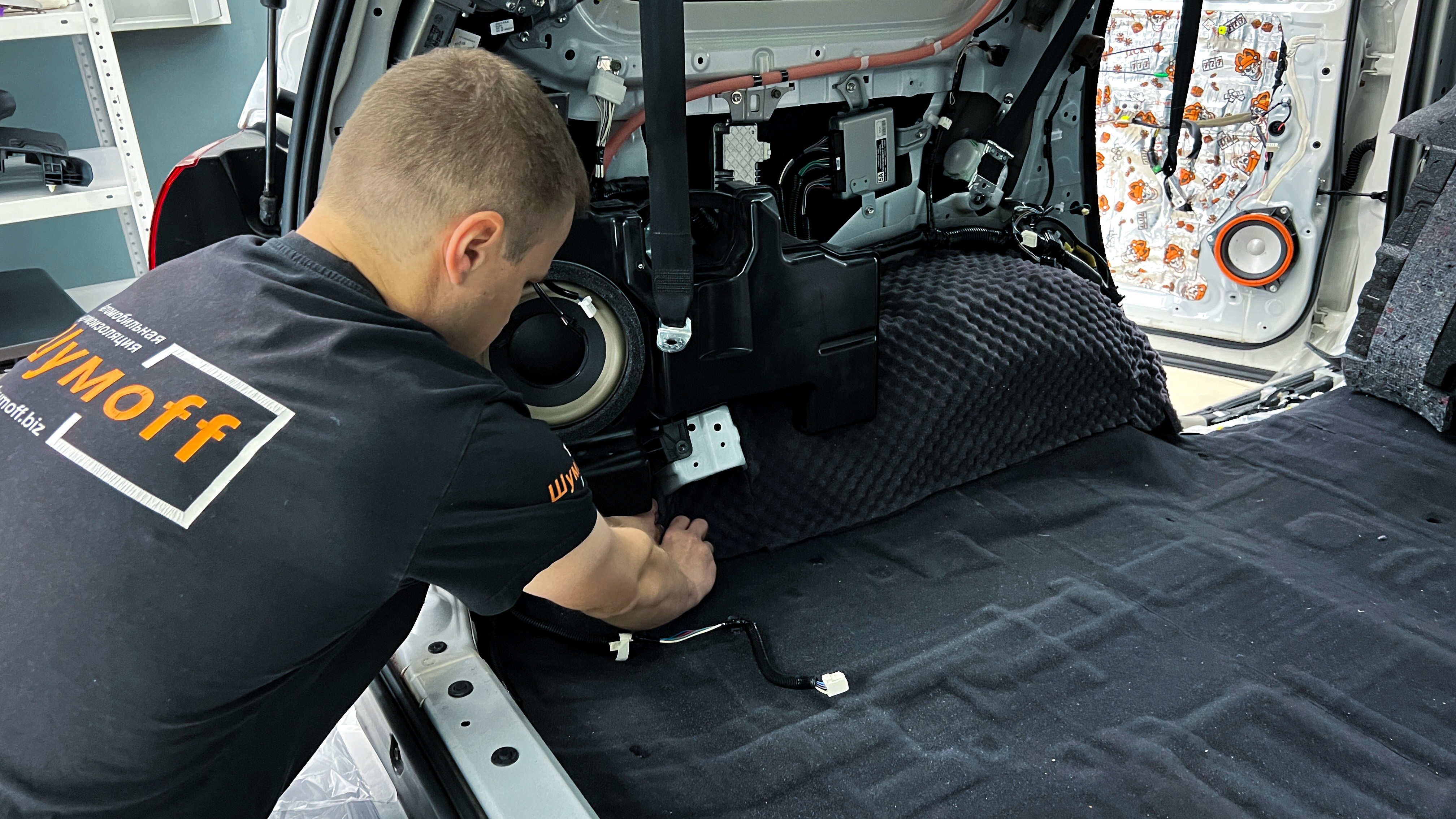 Обезжириваем поверхность и приступаем к монтажу второго слоя. Также для получения более эффективного результата используем компоновку из двух материалов На дно багажника клеим Шумофф Base 4. Этот слой позволит снизить нам шум от дороги.
