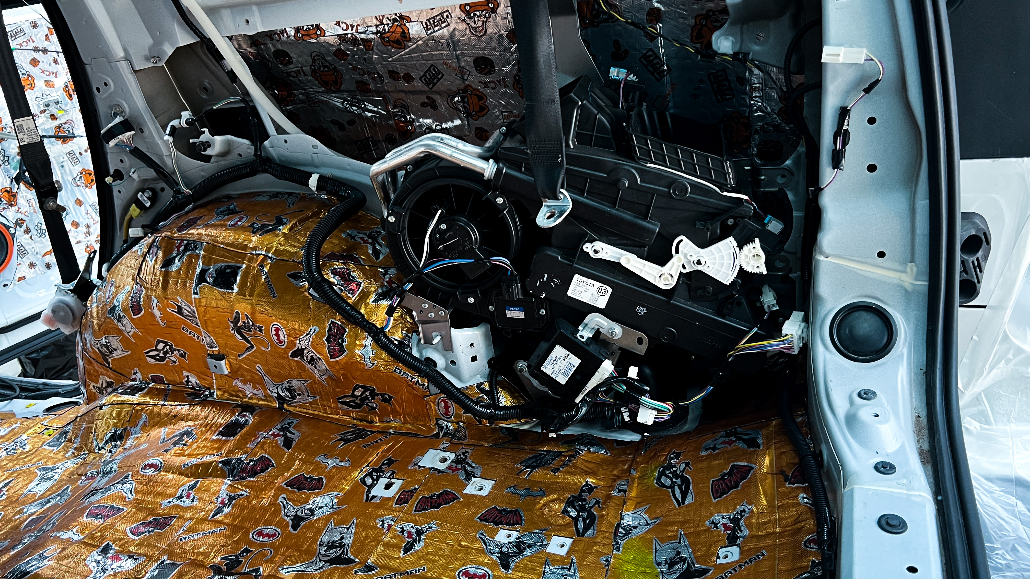 После разбора салона демонтируем ковер и вынимаем все элементы штатной шумоизоляции, а также воздуховоды.
