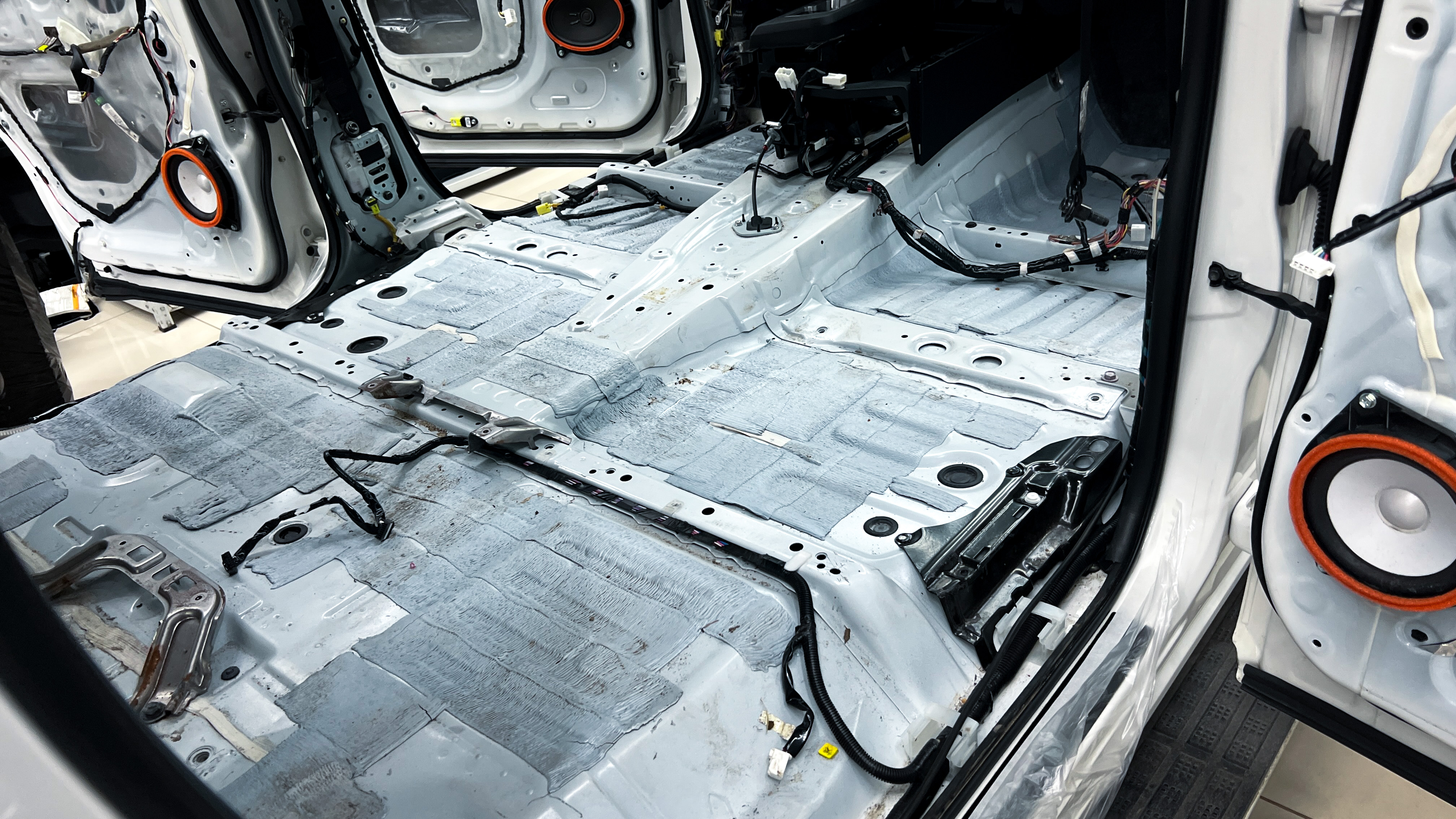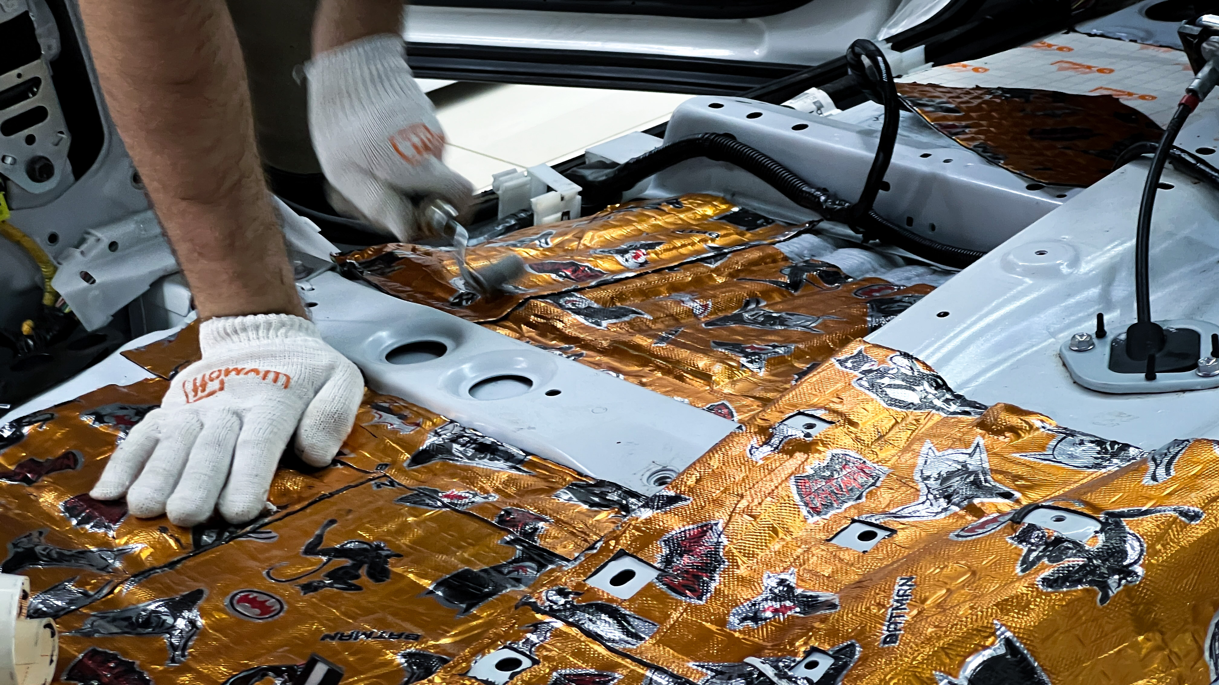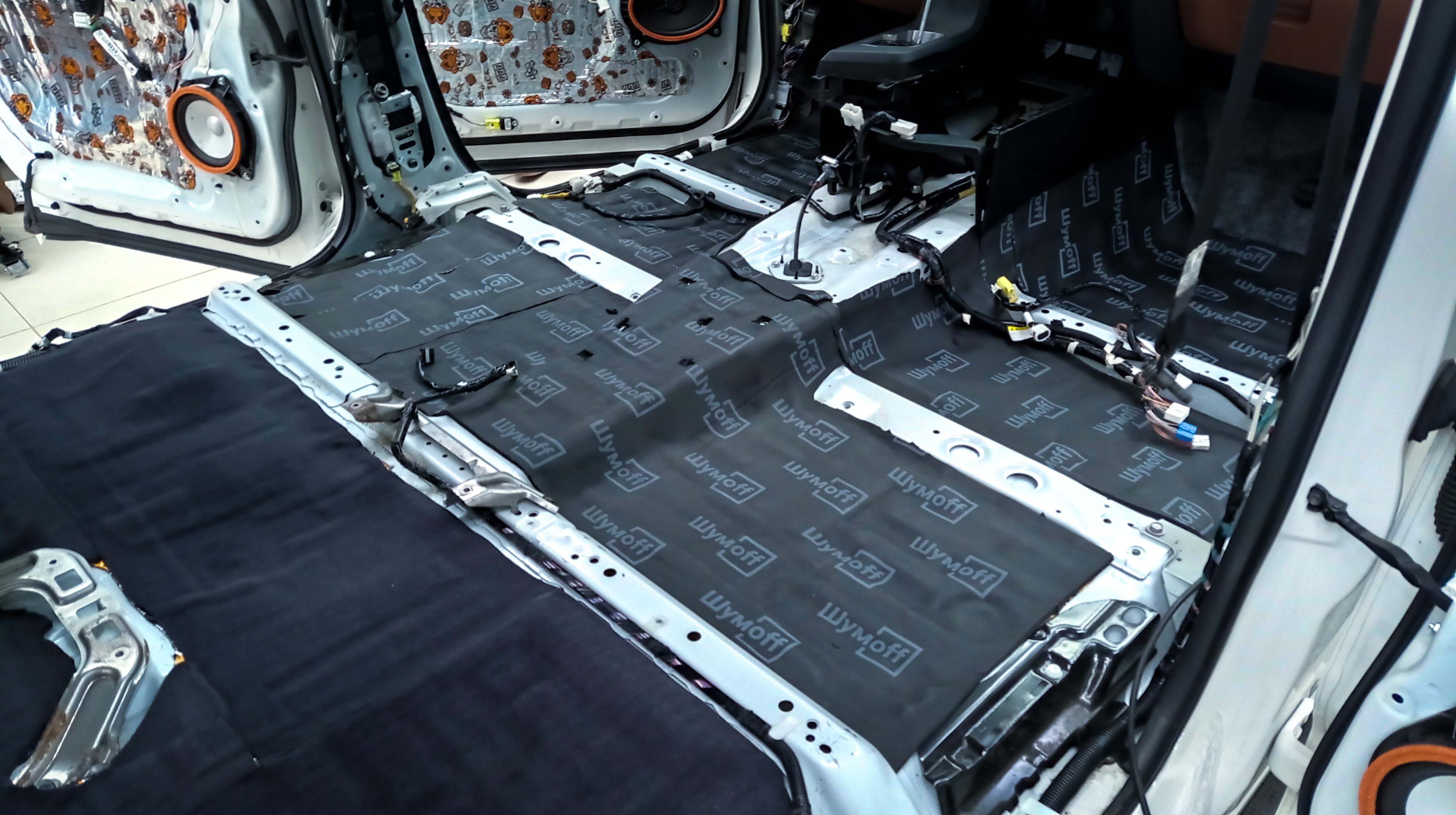 Дно оклеивается многослойным шумо и звукоизолятором Шумофф Prizma 6, крылья, арки и крышка багажника шумопоглотителем Absorber A15.