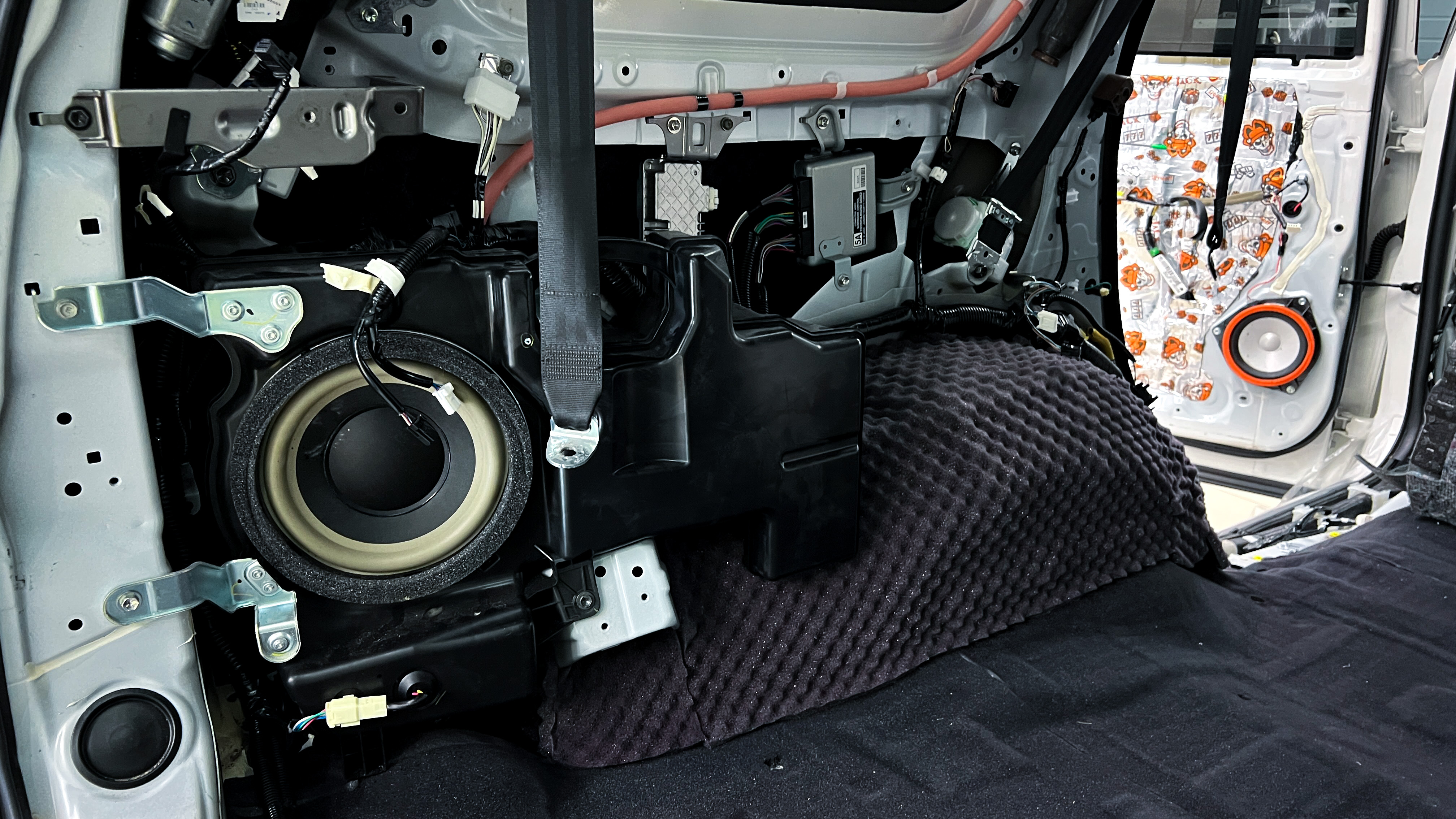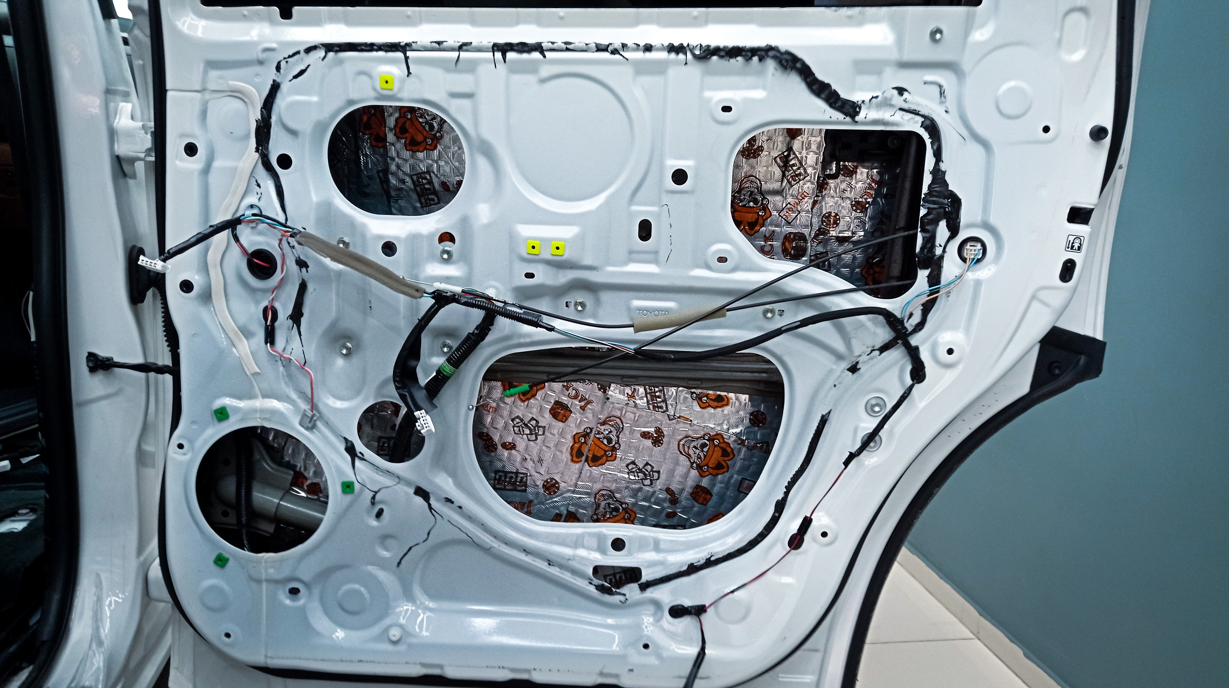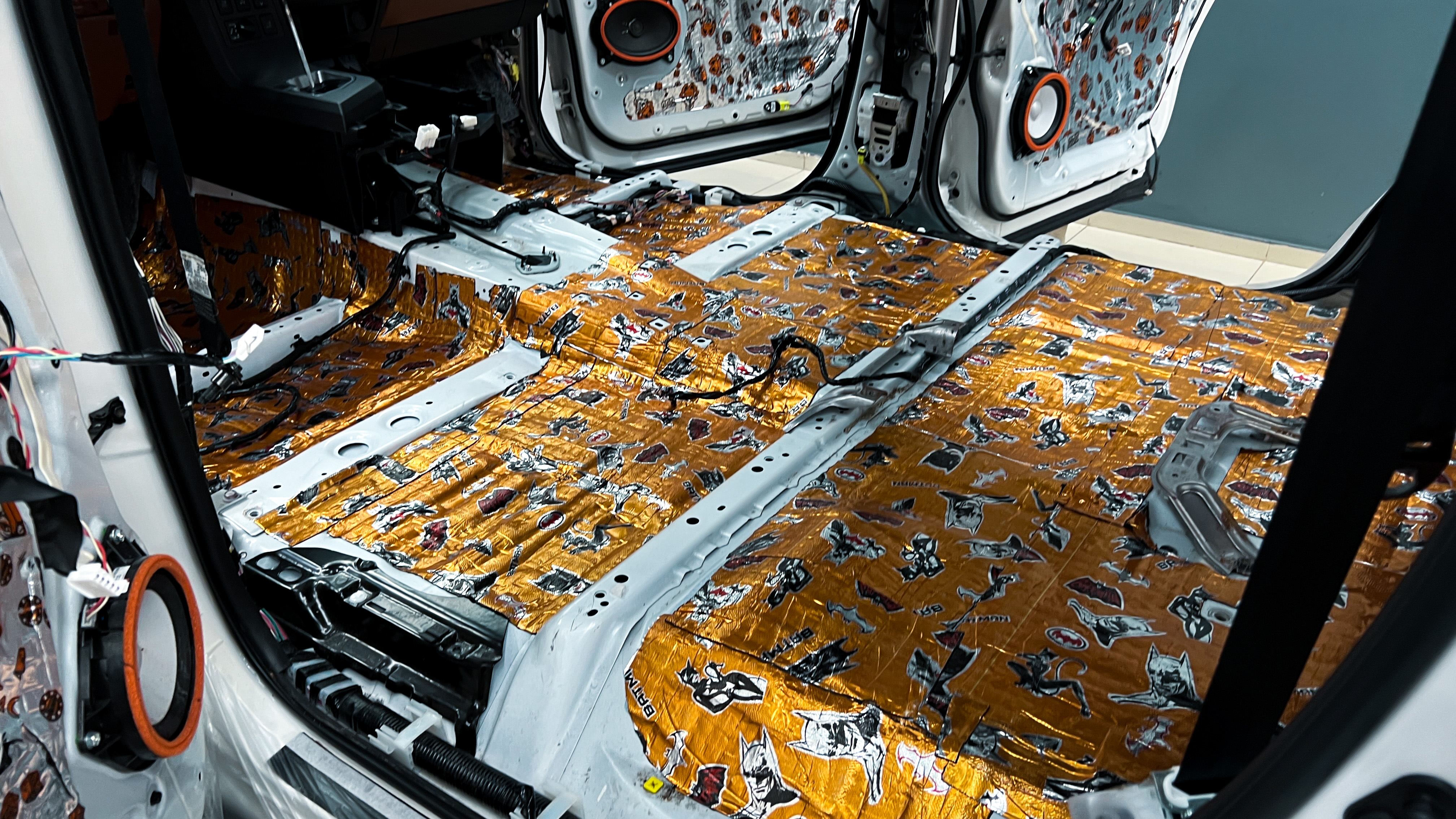 Дно оклеивается многослойным шумо и звукоизолятором Шумофф Prizma 6, крылья, арки и крышка багажника шумопоглотителем Absorber A15.