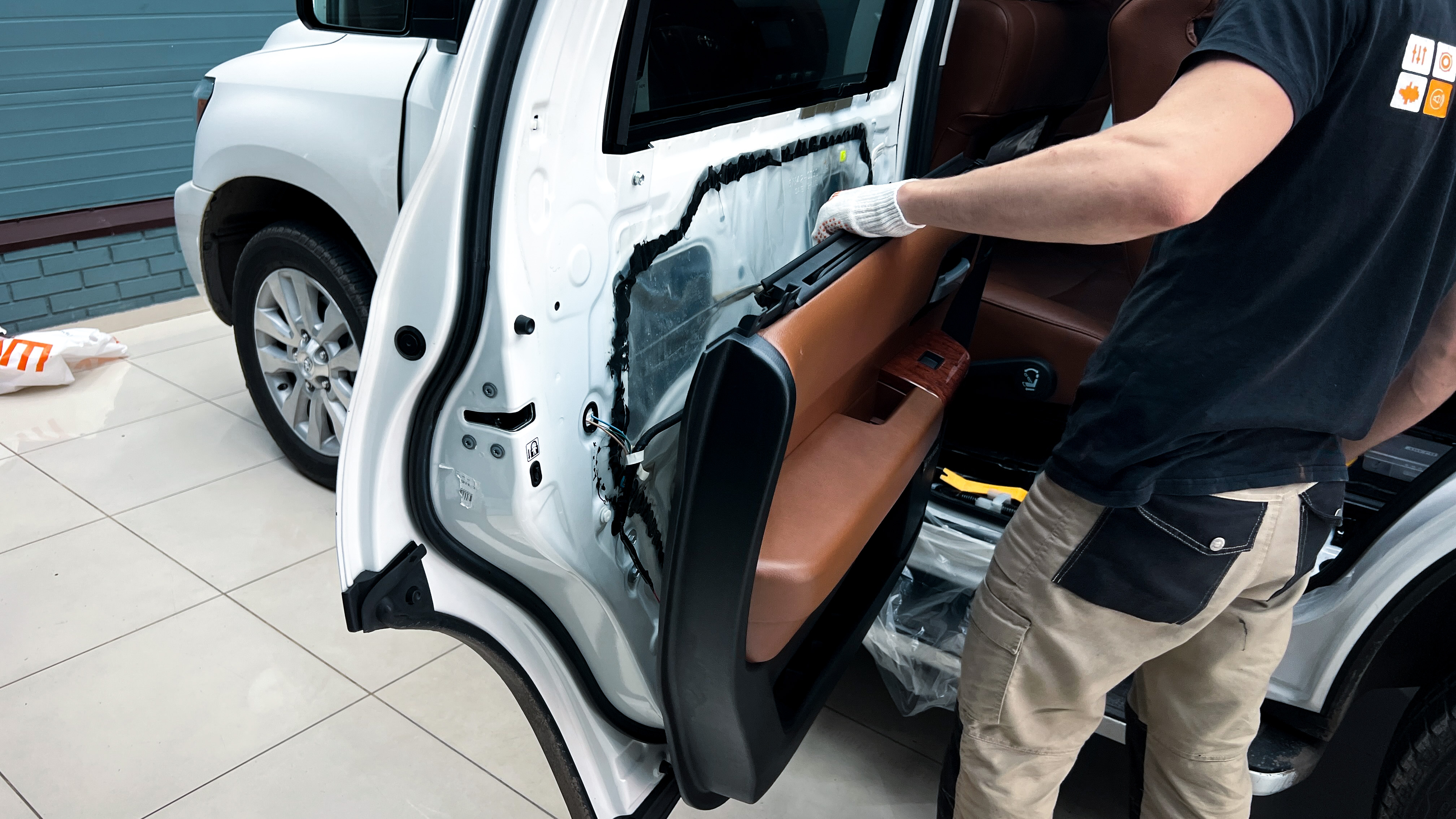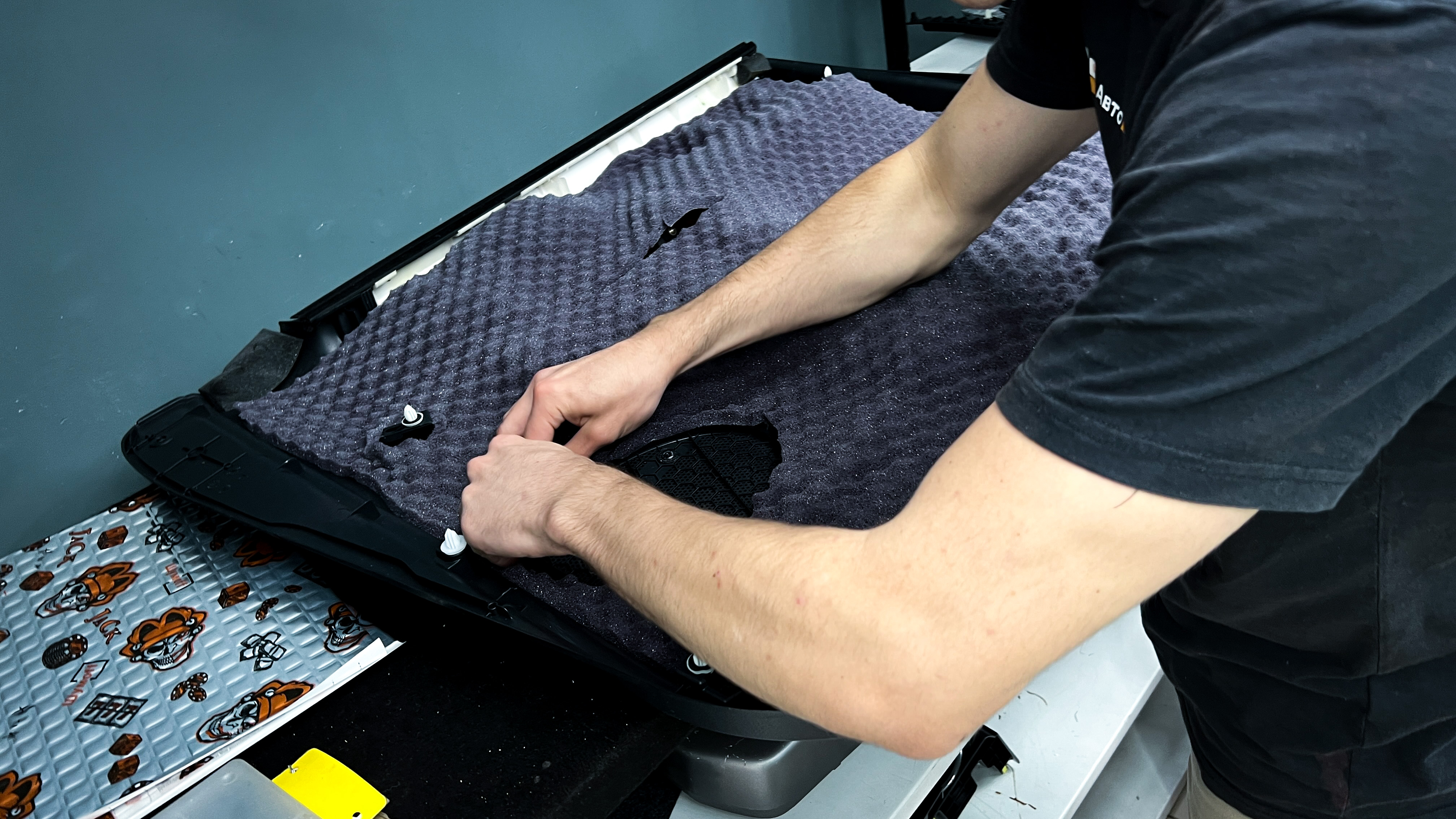 Внутренняя поверхность обивки оклеивается шумопоглотителем Flex А15.