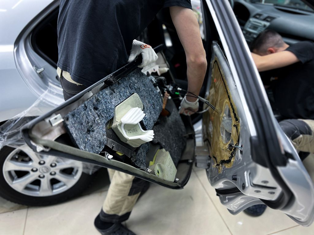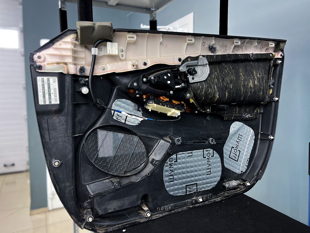 Приступаем к шумоизоляции дверей Toyota Camry (Тойота Камри). Разбираем все дверные обшивки. Убираем их на специальный стеллаж, чтобы не повредить.