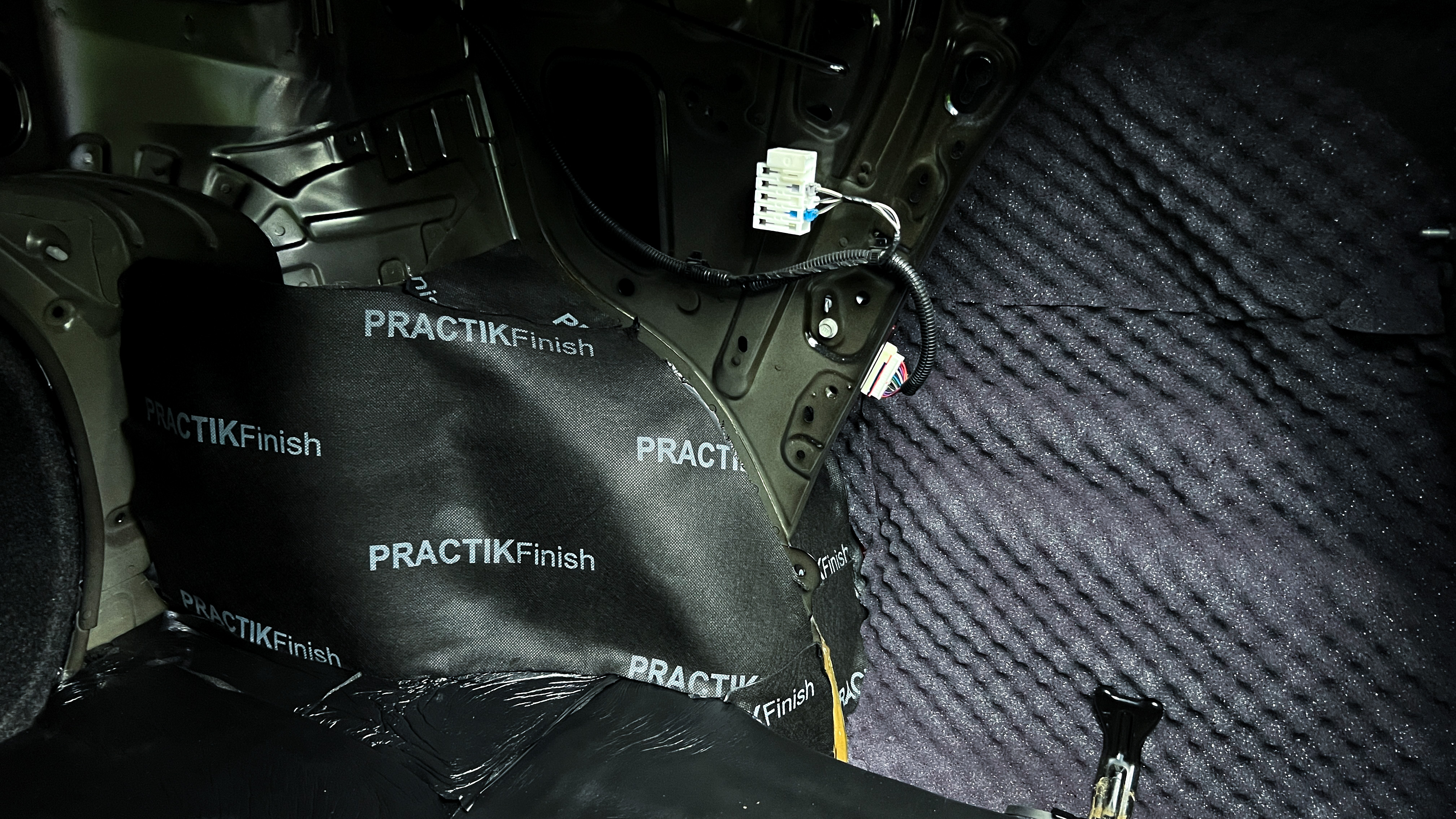 Завершаем шумоизоляцию нанесением третьего слоя звукоизоляционной мембраны Practik Finish на арки. В результате получаем компоновку материалов с максимальной эффективностью и возможностью сборки салона в первозданный вид.