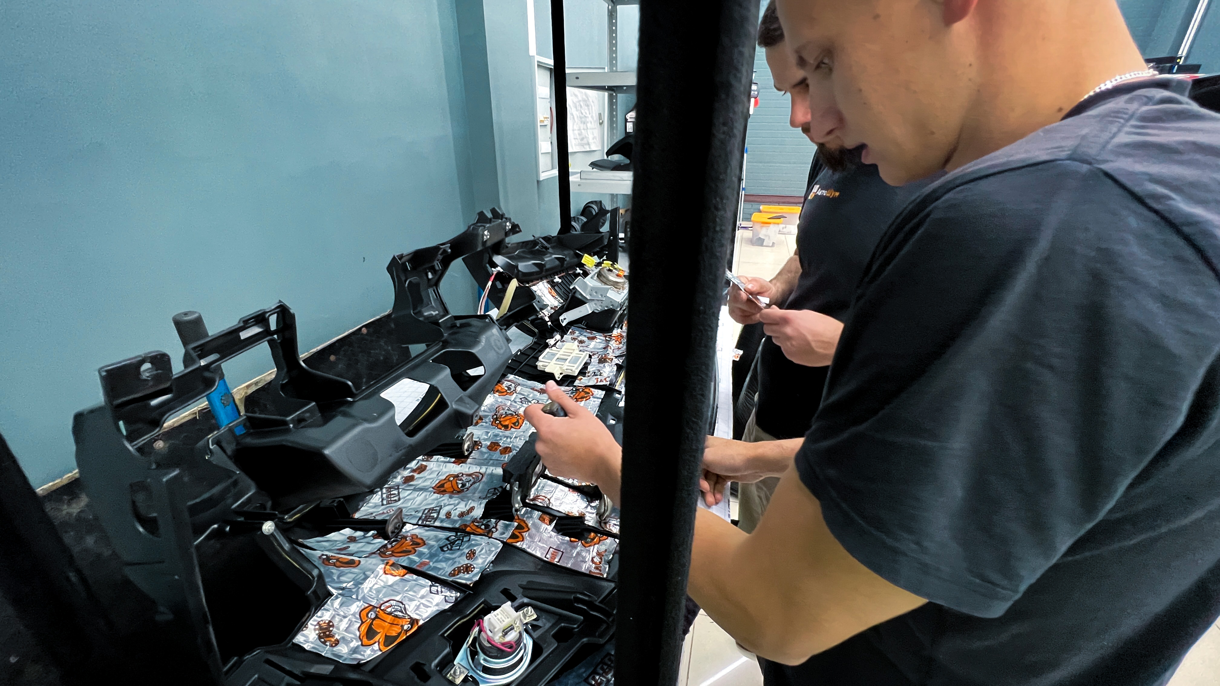 Приступаем к разбору панели и центральной консоли, аккуратно демонтируем воздуховоды, молдинги, декоративные вставки. Далее переходим к электронике, отключаем провода от магнитолы, климат контроля и различных кнопок, никакого вмешательства влияющего на гарантию не происходит, мы лишь штатно отключаем и подключаем разъемы.