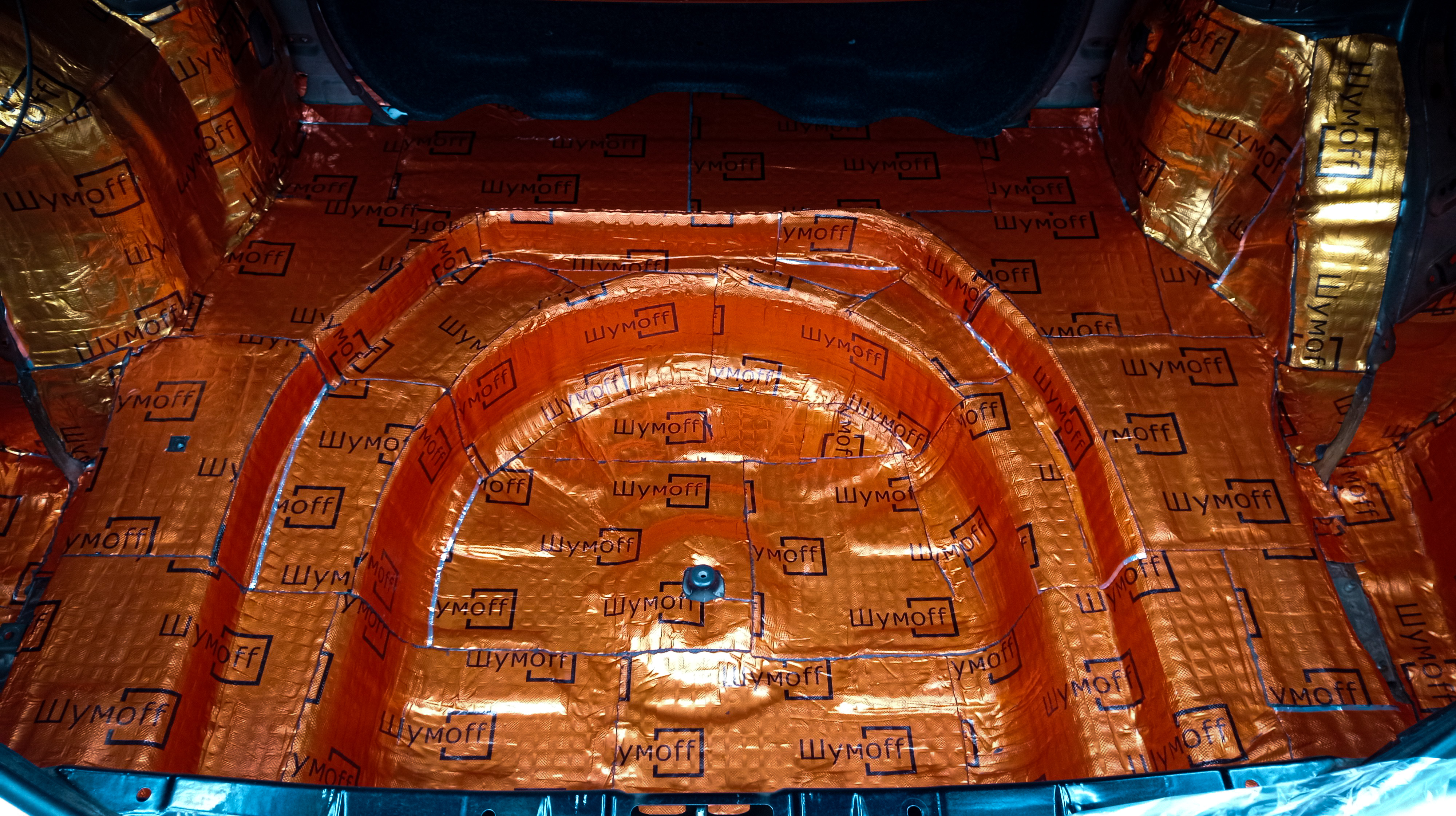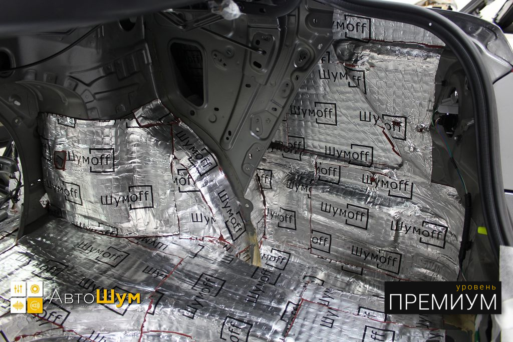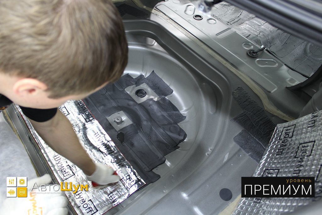 Дно багажника и крылья оклеиваются шумо и теплоизолятором Шумофф П4 4. Арки оклеиваются шумопоглотителем Flex A15.