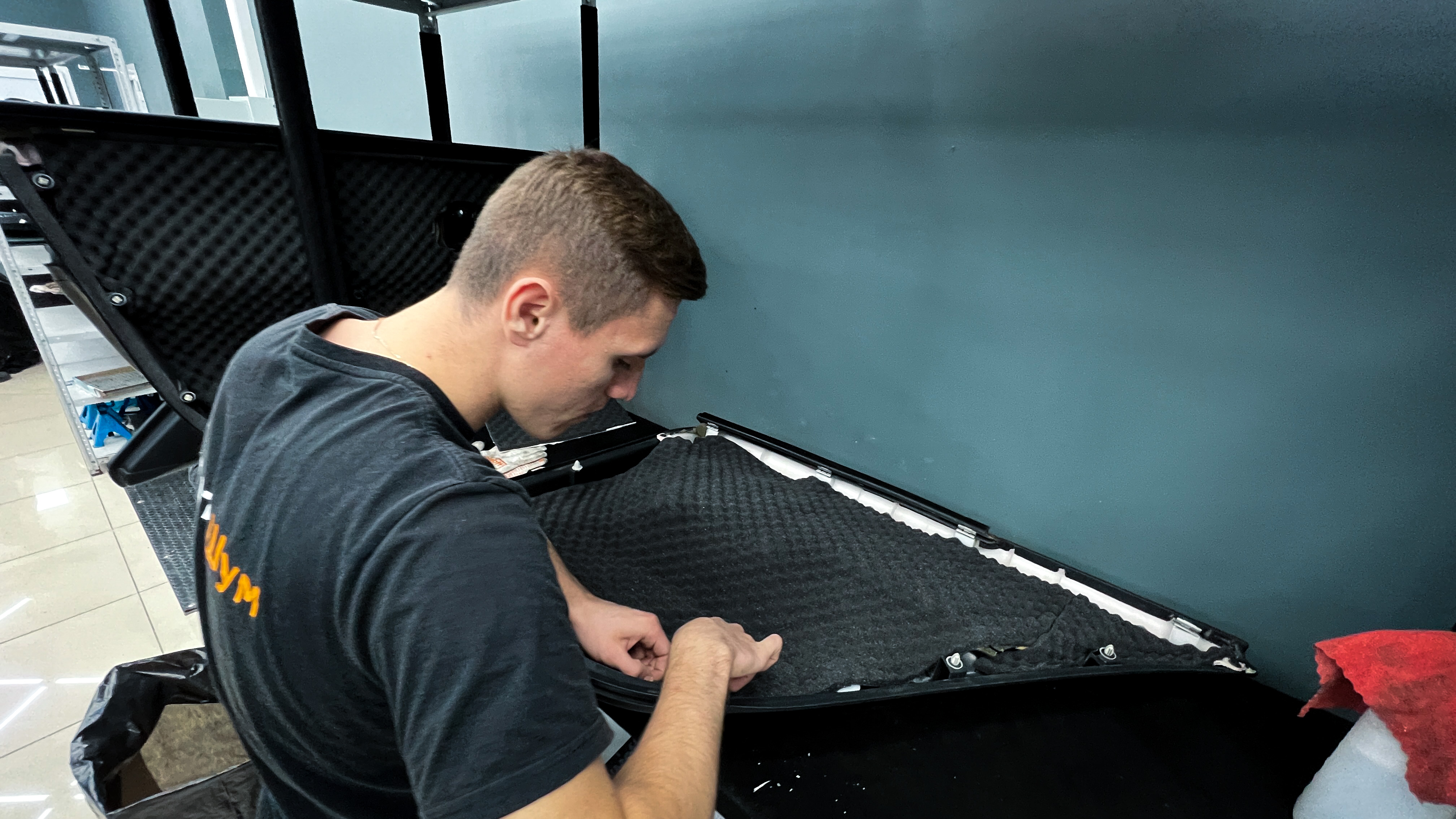 Разбираем багажник, все детали складываем на специальный стеллаж. Штатная шумоизоляция багажника практически отсутствует, при этом еще и плохо держится на кузове. Очищаем и обезжириваем, после приступаем к монтажу.