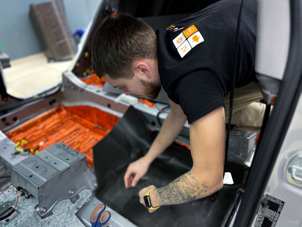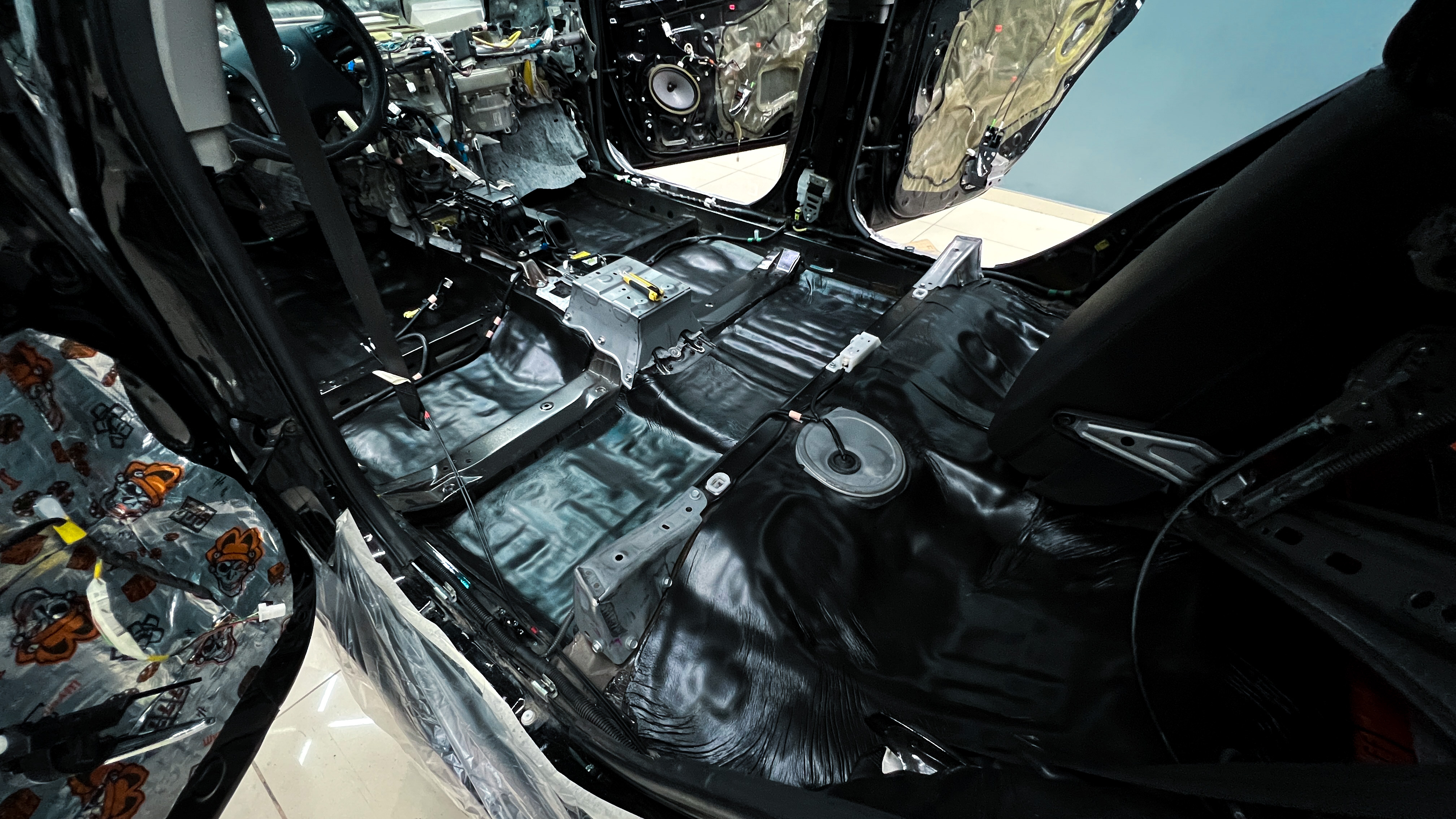 От моторной перегородки и до заднего сиденья вмести с ним клеится мощный многослойный шумо и звукоизолятор Шумофф Prizma 6.