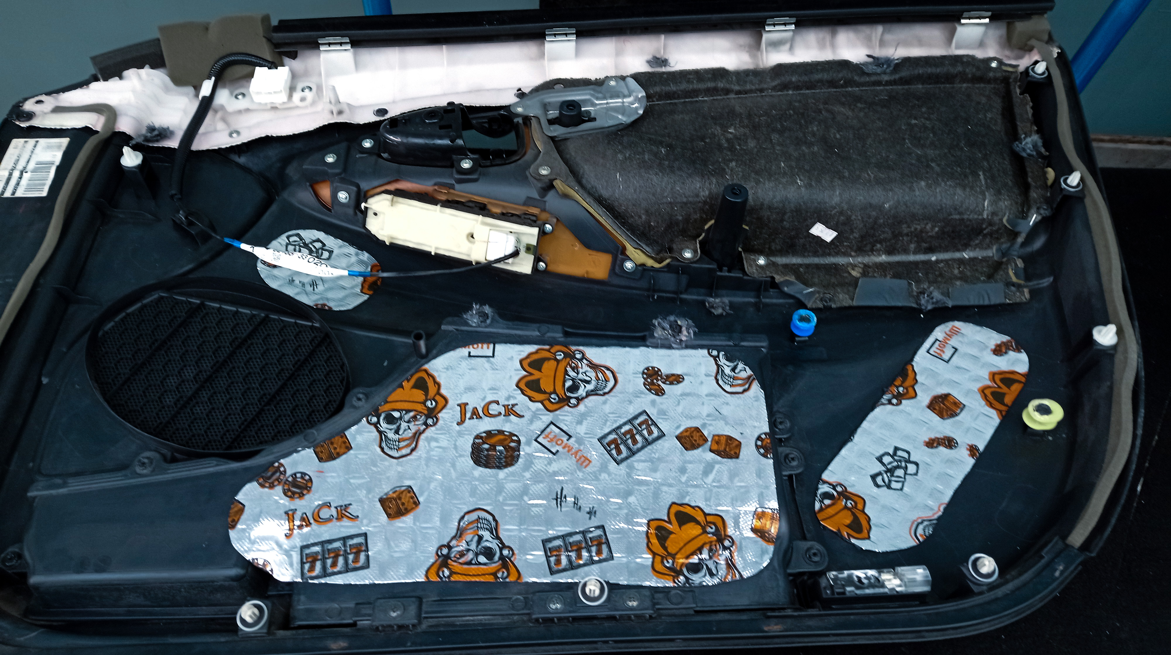 Переходим к дверной обшивке. Убираем штатную шумоизоляцию, обезжириваем поверхность и частично оклеиваем виброизоляцией Шумофф Joker. Этот слой позволит придать обшивке необходимую сбитость тем самым не утяжеляя её.