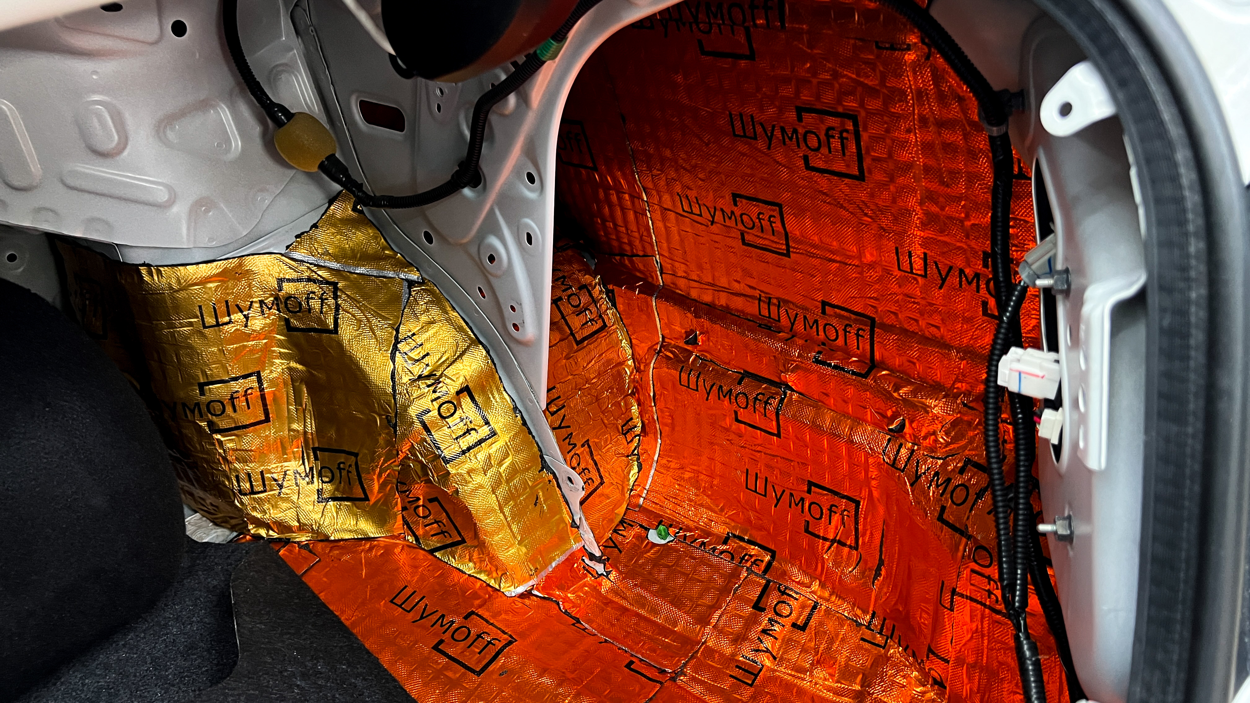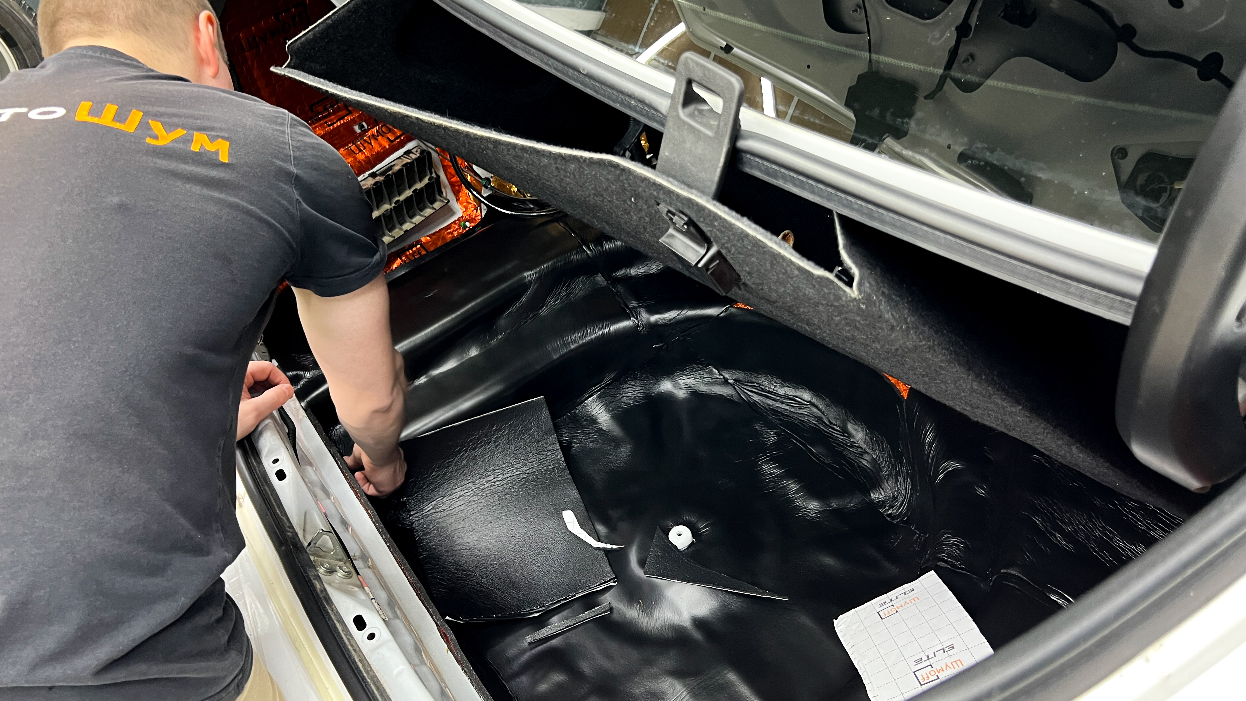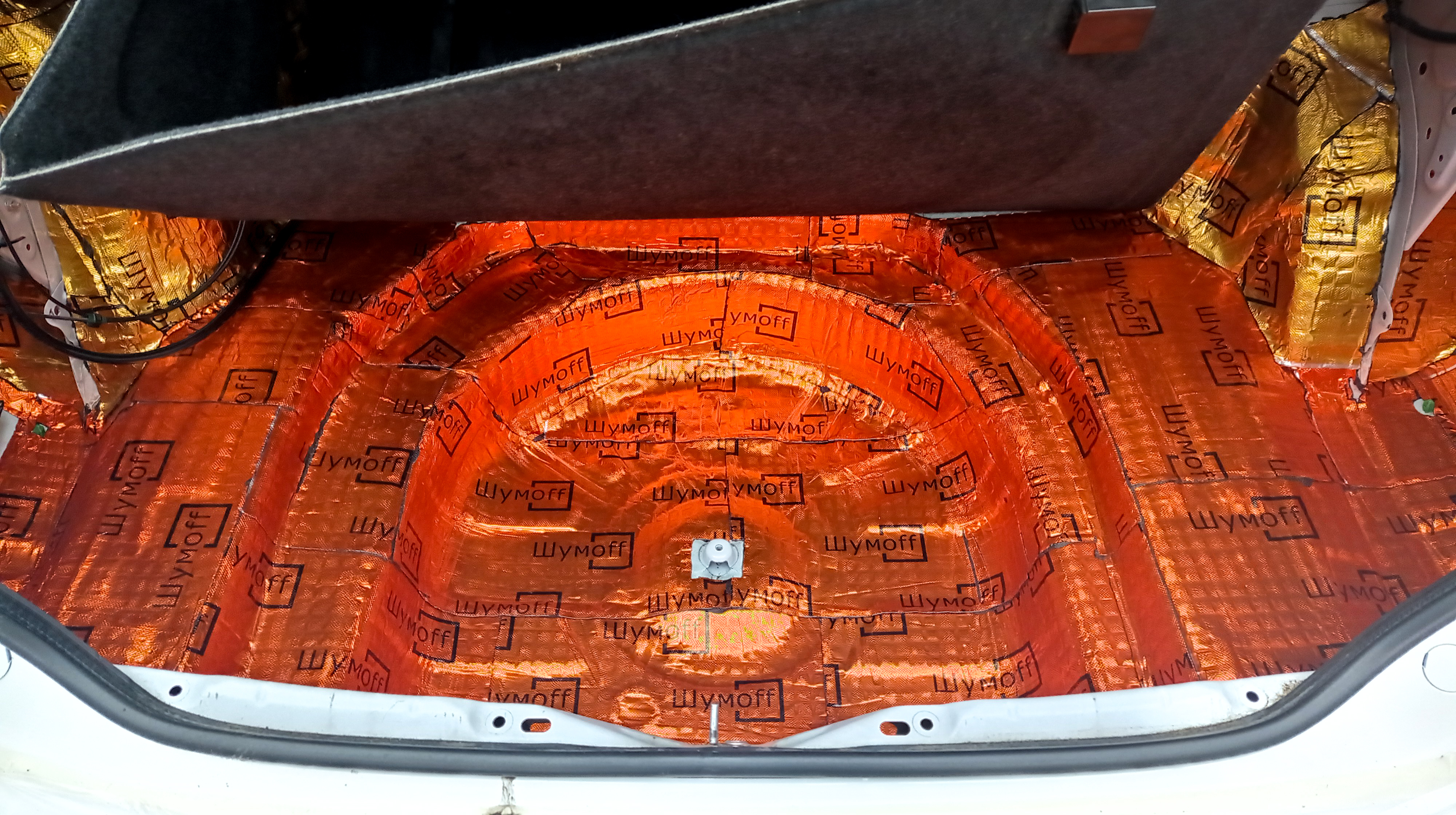Дно багажника и крылья оклеиваются шумо и теплоизолятором Шумофф П4 4. Арки оклеиваются шумопоглотителем Flex A15.