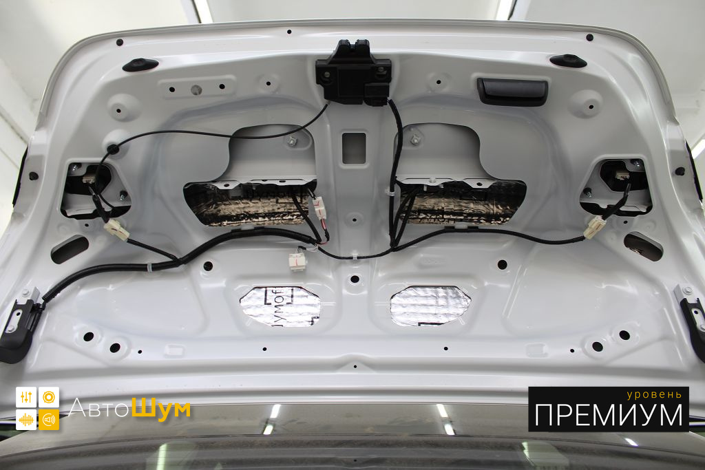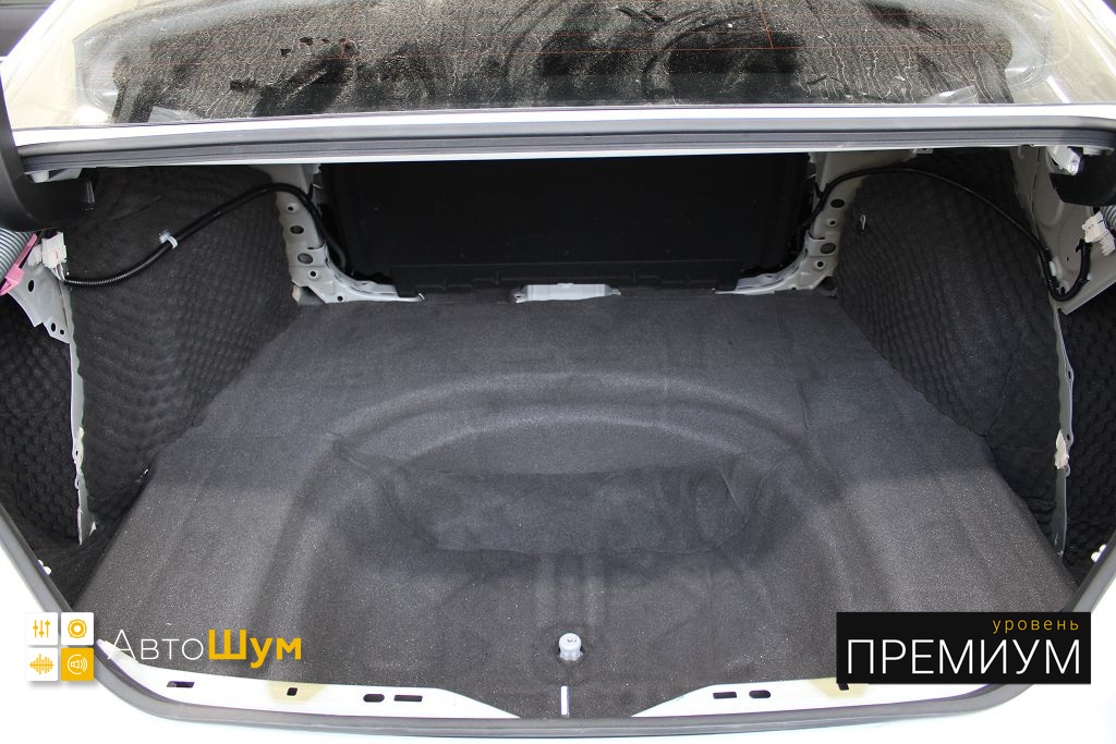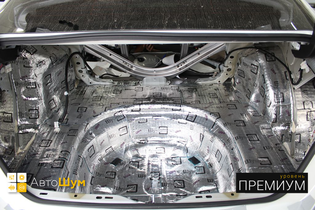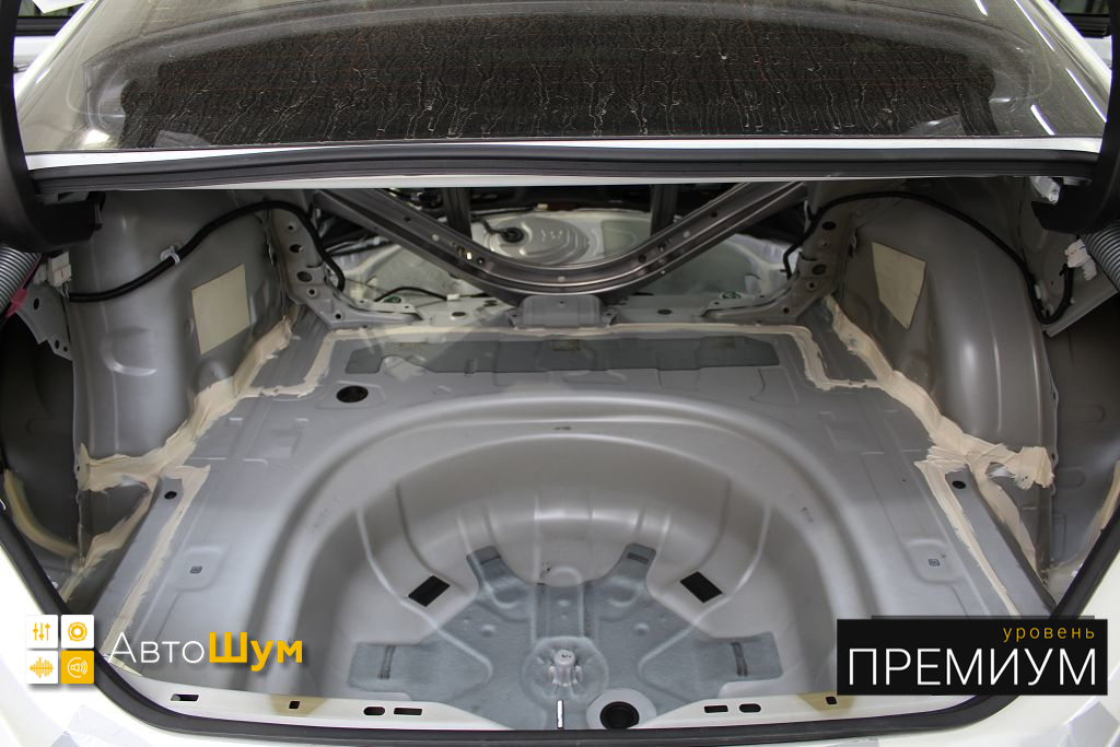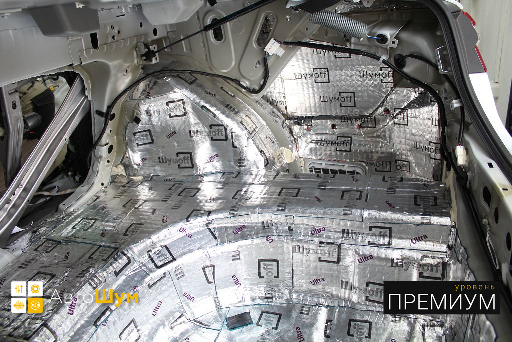 Дно багажника и крылья оклеиваются шумо и теплоизолятором Шумофф П4 4. Арки оклеиваются шумопоглотителем Flex A15.